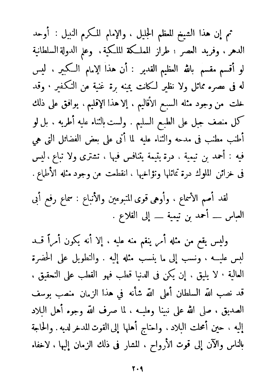 ثُمَّ إنَّ هَذَا الشَّيْخَ الْمُعَظَّمَ الْجَلِيلَ وَالْإِمَامَ الْمُكَرَّمَ النَّبِيلَ: أَوْحَدُ الدَّهْرِ وَفَرِيدُ الْعَصْرِ؛ طِرَازُ الْمَمْلَكَةِ الْمَلَكِيَّةِ وَعَلَمُ الدَّوْلَةِ السُّلْطَانِيَّةِ لَوْ أَقْسَمَ مُقْسِمٌ بِاَللَّهِ الْعَظِيمِ الْقَدِيرِ: أَنَّ هَذَا الْإِمَامَ الْكَبِيرَ لَيْسَ لَهُ فِي عَصْرِهِ مُمَاثِلَ وَلَا نَظِيرٌ لَكَانَتْ يَمِينُهُ بَرَّةً غَنِيَّةً عَنْ التَّكْفِيرِ وَقَدْ خَلَتْ مِنْ وُجُودِ مِثْلِهِ السَّبْعُ الْأَقَالِيمُ إلَّا هَذَا الْإِقْلِيمَ يُوَافِقُ عَلَى ذَلِكَ كُلُّ مُنْصِفٍ جُبِلَ عَلَى الطَّبْعِ السَّلِيمِ. وَلَسْت بِالثَّنَاءِ عَلَيْهِ أُطْرِيهِ بَلْ لَوْ أَطْنَبَ مُطْنِبٌ فِي مَدْحِهِ وَالثَّنَاءِ عَلَيْهِ لَمَا أَتَى عَلَى بَعْضِ الْفَضَائِلِ الَّتِي هِيَ فِيهِ: أَحْمَد ابْن تَيْمِيَّة دُرَّةٌ يَتِيمَةٌ يُتَنَافَسُ فِيهَا تُشْتَرَى وَلَا تُبَاعُ لَيْسَ فِي خَزَائِنِ الْمُلُوكِ دُرَّةٌ تُمَاثِلُهَا وَتُؤَاخِيهَا انْقَطَعَتْ عَنْ وُجُودِ مِثْلِهِ الْأَطْمَاعُ. وَلَقَدْ أَصَمَّ الْأَسْمَاعَ وَأَوْهَى قُوَى الْمَتْبُوعِينَ وَالْأَتْبَاعِ: سَمَّاعُ رَفْعِ أَبِي الْعَبَّاسِ - أَحْمَد ابْنِ تَيْمِيَّة - إلَى الْقِلَاعِ. وَلَيْسَ يَقَعُ مِنْ مِثْلِهِ أَمْرٌ يُنْقَمُ مِنْهُ عَلَيْهِ إلَّا أَنَّهُ يَكُونُ أَمْرًا قَدْ لُبِّسَ عَلَيْهِ وَنُسِبَ إلَى مَا يُنْسَبُ مِثْلُهُ إلَيْهِ. وَالتَّطْوِيلُ عَلَى الْحَضْرَةِ الْعَالِيَةِ لَا يَلِيقُ إنْ يَكُنْ فِي الدُّنْيَا قُطْبٌ فَهُوَ الْقُطْبُ عَلَى التَّحْقِيقِ قَدْ نَصَّبَ اللَّهُ السُّلْطَانَ أَعْلَى اللَّهُ شَأْنَهُ فِي هَذَا الزَّمَانِ مَنْصِبَ يُوسُفَ الصِّدِّيقِ صَلَّى اللَّهُ عَلَى نَبِيِّنَا وَعَلَيْهِ لَمَّا صَرَفَ اللَّهُ وُجُوهَ أَهْلِ الْبِلَادِ إلَيْهِ حِينَ أَمْحَلَتْ الْبِلَادُ وَاحْتَاجَ أَهْلُهَا إلَى الْقُوتِ الْمُدَّخَرِ لَدَيْهِ. وَالْحَاجَةُ بِالنَّاسِ الْآنَ إلَى قُوتِ الْأَرْوَاحِ الْمُشَارِ فِي ذَلِكَ الزَّمَانِ إلَيْهَا لَا خَفَاءَ