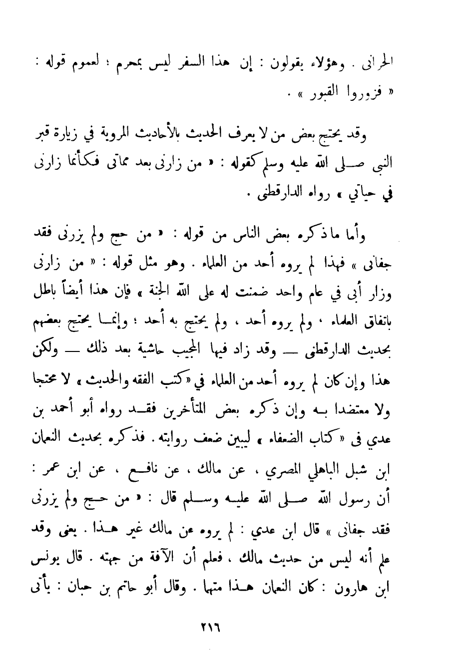 الْحَرَّانِي. وَهَؤُلَاءِ يَقُولُونَ: إنَّ هَذَا السَّفَرَ لَيْسَ بِمُحَرَّمٍ؛ لِعُمُومِ قَوْلِهِ: {فَزُورُوا الْقُبُورَ} . وَقَدْ يَحْتَجُّ بَعْضُ مَنْ لَا يَعْرِفُ الْحَدِيثَ بِالْأَحَادِيثِ الْمَرْوِيَّةِ فِي زِيَارَةِ قَبْرِ النَّبِيِّ صَلَّى اللَّهُ عَلَيْهِ وَسَلَّمَ كَقَوْلِهِ: {مَنْ زَارَنِي بَعْدَ مَمَاتِي فَكَأَنَّمَا زَارَنِي فِي حَيَاتِي} رَوَاهُ الدارقطني. وَأَمَّا مَا ذَكَرَهُ بَعْضُ النَّاسِ مِنْ قَوْلِهِ: {مَنْ حَجَّ وَلَمْ يَزُرْنِي فَقَدْ جَفَانِي} فَهَذَا لَمْ يَرْوِهِ أَحَدٌ مِنْ الْعُلَمَاءِ. وَهُوَ مِثْلُ قَوْلِهِ: {مَنْ زَارَنِي وَزَارَ أَبِي فِي عَامٍ وَاحِدٍ ضَمِنْت لَهُ عَلَى اللَّهِ الْجَنَّةَ} فَإِنَّ هَذَا أَيْضًا بَاطِلٌ بِاتِّفَاقِ الْعُلَمَاءِ وَلَمْ يَرْوِهِ أَحْمَد وَلَمْ يَحْتَجَّ بِهِ أَحَدٌ؛ وَإِنَّمَا يَحْتَجُّ بَعْضُهُمْ بِحَدِيثِ الدارقطني - وَقَدْ زَادَ فِيهَا الْمُجِيبُ حَاشِيَةً بَعْدَ ذَلِكَ - وَلَكِنَّ هَذَا وَإِنْ كَانَ لَمْ يَرْوِهِ أَحَدٌ مِنْ الْعُلَمَاءِ فِي " كُتُبِ الْفِقْهِ وَالْحَدِيثِ " لَا مُحْتَجًّا وَلَا مُعْتَضِدًا بِهِ وَإِنْ ذَكَرَهُ بَعْضُ الْمُتَأَخِّرِينَ فَقَدْ رَوَاهُ أَبُو أَحْمَد بْنُ عَدِيٍّ فِي " كِتَابِ الضُّعَفَاءِ " لِيُبَيِّنَ ضَعْفَ رِوَايَتِهِ. فَذَكَرَهُ بِحَدِيثِ النُّعْمَانِ بْنِ شِبْلٍ الْبَاهِلِيِّ الْمِصْرِيِّ عَنْ مَالِكٍ عَنْ نَافِعٍ عَنْ ابْنِ عُمَرَ: أَنَّ رَسُولَ اللَّهِ صَلَّى اللَّهُ عَلَيْهِ وَسَلَّمَ قَالَ: {مَنْ حَجَّ وَلَمْ يَزُرْنِي فَقَدْ جَفَانِي} قَالَ ابْنُ عَدِيٍّ: لَمْ يَرْوِهِ عَنْ مَالِكٍ غَيْرُ هَذَا. يَعْنِي وَقَدْ عُلِمَ أَنَّهُ لَيْسَ مِنْ حَدِيثِ مَالِكٍ فَعُلِمَ أَنَّ الْآفَةَ مِنْ جِهَتِهِ. قَالَ يُونُسُ بْنُ هَارُونَ: كَانَ النُّعْمَانُ هَذَا مُتَّهَمًا. وَقَالَ أَبُو حَاتِمِ بْنُ حِبَّانَ: يَأْتِي