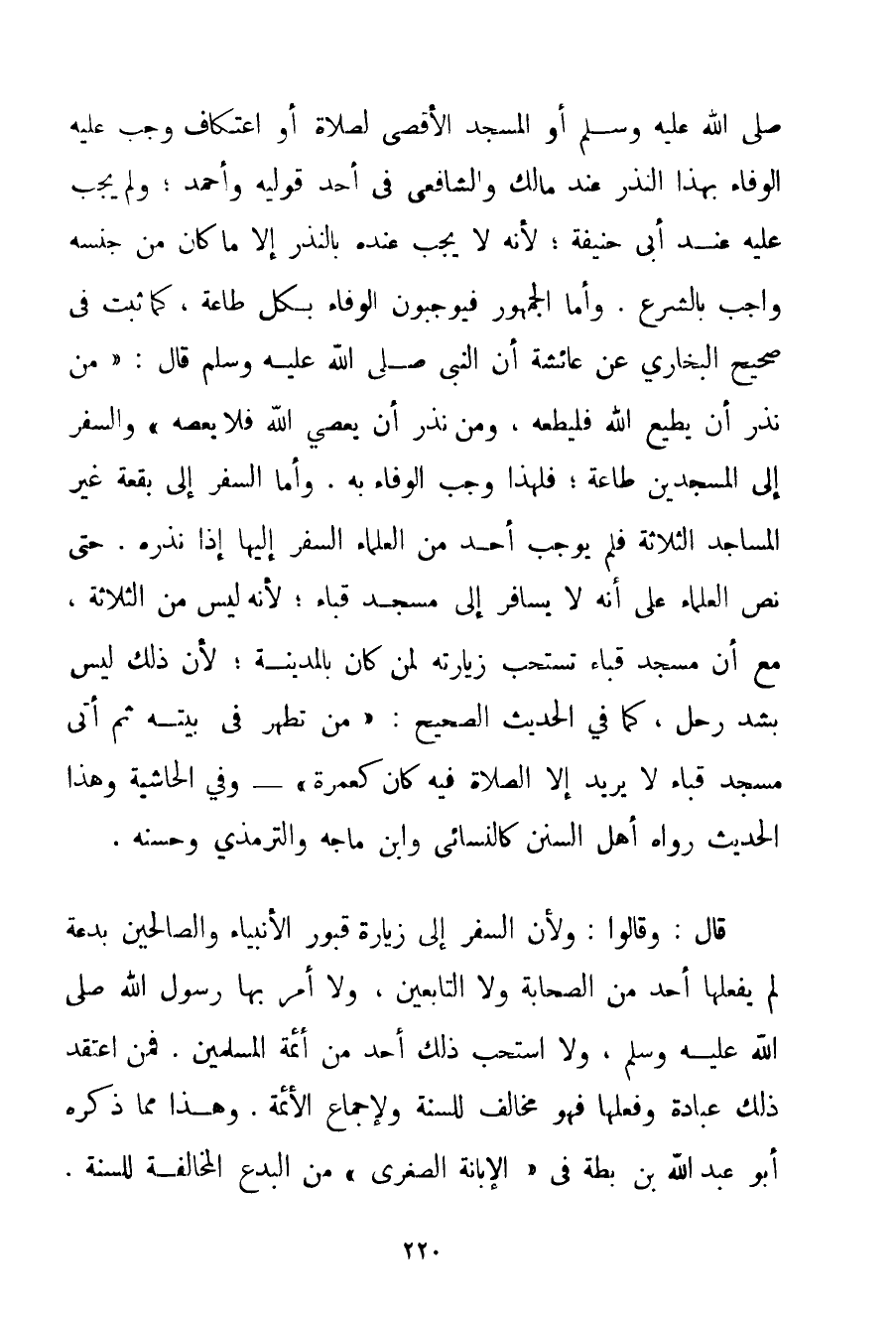 صَلَّى اللَّهُ عَلَيْهِ وَسَلَّمَ أَوْ الْمَسْجِدَ الْأَقْصَى لِصَلَاةِ أَوْ اعْتِكَافٍ وَجَبَ عَلَيْهِ الْوَفَاءُ بِهَذَا النَّذْرِ عِنْدَ مَالِكٍ وَالشَّافِعِيِّ فِي أَحَدِ قَوْلَيْهِ وَأَحْمَد؛ وَلَمْ يَجِبْ عَلَيْهِ عِنْدَ أَبِي حَنِيفَةَ؛ لِأَنَّهُ لَا يَجِبُ عِنْدَهُ بِالنَّذْرِ إلَّا مَا كَانَ مِنْ جِنْسِهِ وَاجِبٌ بِالشَّرْعِ. وَأَمَّا الْجُمْهُورُ فَيُوجِبُونَ الْوَفَاءَ بِكُلِّ طَاعَةٍ كَمَا ثَبَتَ فِي صَحِيحِ الْبُخَارِيِّ عَنْ عَائِشَةَ أَنَّ النَّبِيَّ صَلَّى اللَّهُ عَلَيْهِ وَسَلَّمَ قَالَ: {مَنْ نَذَرَ أَنْ يُطِيعَ اللَّهَ فَلْيُطِعْهُ وَمَنْ نَذَرَ أَنْ يَعْصِيَ اللَّهَ فَلَا يَعْصِهِ} وَالسَّفَرُ إلَى الْمَسْجِدَيْنِ طَاعَةٌ؛ فَلِهَذَا وَجَبَ الْوَفَاءُ بِهِ. وَأَمَّا السَّفَرُ إلَى بُقْعَةٍ غَيْرِ الْمَسَاجِدِ الثَّلَاثَةِ فَلَمْ يُوجِبْ أَحَدٌ مِنْ الْعُلَمَاءِ السَّفَرَ إلَيْهَا إذَا نَذَرَهُ. حَتَّى نَصَّ الْعُلَمَاءُ عَلَى أَنَّهُ لَا يُسَافَرُ إلَى مَسْجِدِ قُبَاء؛ لِأَنَّهُ لَيْسَ مِنْ الثَّلَاثَةِ مَعَ أَنَّ مَسْجِدَ قُبَاء تُسْتَحَبُّ زِيَارَتُهُ لِمَنْ كَانَ بِالْمَدِينَةِ؛ لِأَنَّ ذَلِكَ لَيْسَ بِشَدِّ رَحْلٍ كَمَا فِي الْحَدِيثِ الصَّحِيحِ: {مَنْ تَطَهَّرَ فِي بَيْتِهِ ثُمَّ أَتَى مَسْجِدَ قُبَاء لَا يُرِيدُ إلَّا الصَّلَاةَ فِيهِ كَانَ كَعُمْرَةِ} - وَفِي الْحَاشِيَةِ وَهَذَا الْحَدِيثُ رَوَاهُ أَهْلُ السُّنَنِ كالنَّسَائِي وَابْنِ مَاجَه وَالتِّرْمِذِيِّ وَحَسَّنَهُ. قَالَ: وَقَالُوا: وَلِأَنَّ السَّفَرَ إلَى زِيَارَةِ قُبُورِ الْأَنْبِيَاءِ وَالصَّالِحِينَ بِدْعَةٌ لَمْ يَفْعَلْهَا أَحَدٌ مِنْ الصَّحَابَةَ وَلَا التَّابِعِينَ وَلَا أَمَرَ بِهَا رَسُولُ اللَّهِ صَلَّى اللَّهُ عَلَيْهِ وَسَلَّمَ وَلَا اسْتَحَبَّ ذَلِكَ أَحَدٌ مِنْ أَئِمَّةِ الْمُسْلِمِينَ. فَمَنْ اعْتَقَدَ ذَلِكَ عِبَادَةً وَفَعَلَهَا فَهُوَ مُخَالِفٌ لِلسُّنَّةِ وَلِإِجْمَاعِ الْأَئِمَّةِ. وَهَذَا مِمَّا ذَكَرَهُ أَبُو عَبْدِ اللَّهِ بْنُ بَطَّةَ فِي " الْإِبَانَةِ الصُّغْرَى " مِنْ الْبِدَعِ الْمُخَالِفَةِ لِلسُّنَّةِ.