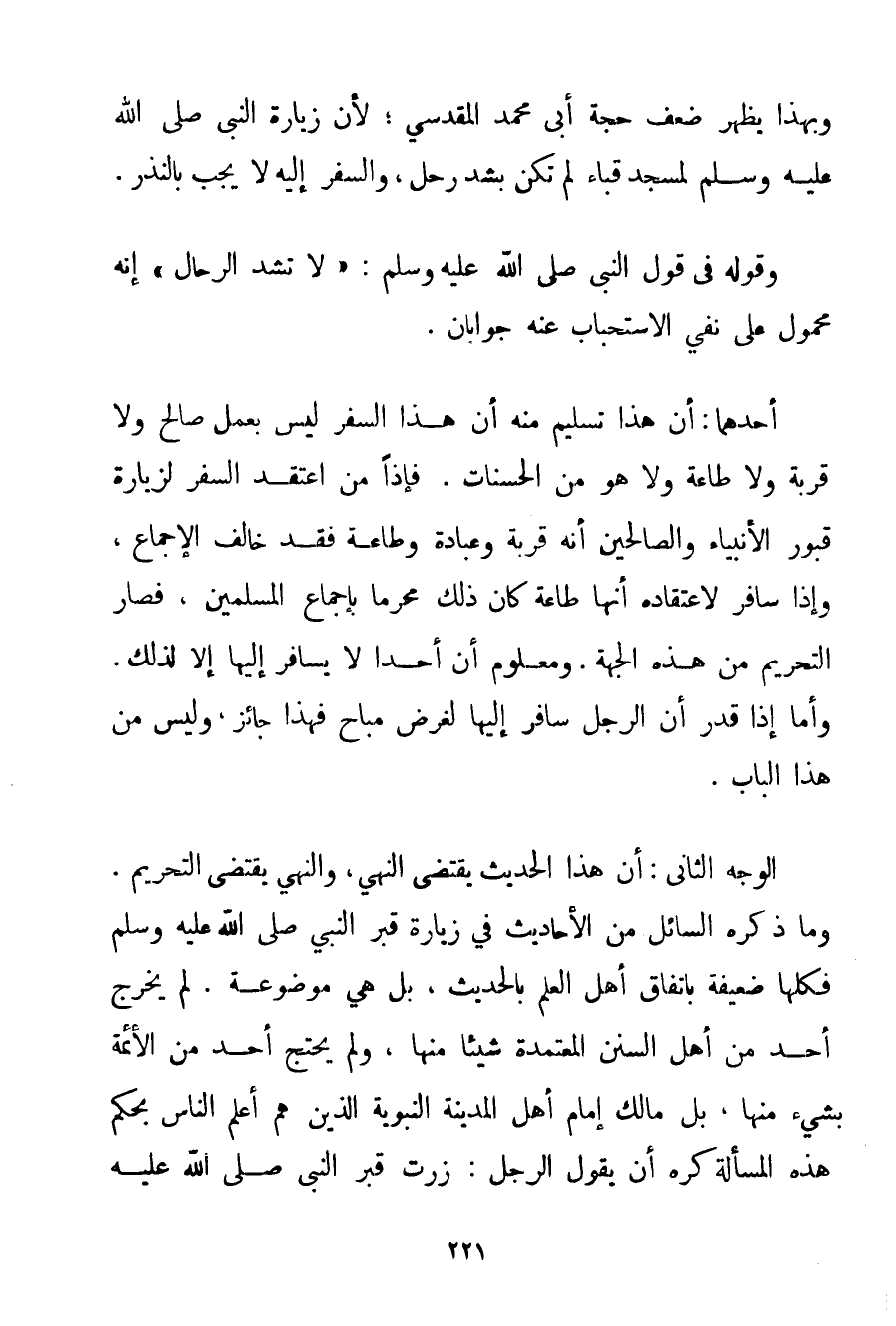 وَبِهَذَا يَظْهَرُ ضَعْفُ حُجَّةِ أَبِي مُحَمَّدٍ المقدسي؛ لِأَنَّ زِيَارَةَ النَّبِيِّ صَلَّى اللَّهُ عَلَيْهِ وَسَلَّمَ لِمَسْجِدِ قُبَاء لَمْ تَكُنْ بِشَدِّ رَحْلٍ وَالسَّفَرَ إلَيْهِ لَا يَجِبُ بِالنَّذْرِ. وَقَوْلُهُ فِي قَوْلِ النَّبِيِّ صَلَّى اللَّهُ عَلَيْهِ وَسَلَّمَ {لَا تُشَدُّ الرِّحَالُ} إنَّهُ مَحْمُولٌ عَلَى نَفْيِ الِاسْتِحْبَابِ عَنْهُ جَوَابَانِ. أَحَدُهُمَا: أَنَّ هَذَا تَسْلِيمٌ مِنْهُ أَنَّ هَذَا السَّفَرَ لَيْسَ بِعَمَلِ صَالِحٍ وَلَا قُرْبَةٍ وَلَا طَاعَةٍ وَلَا هُوَ مِنْ الْحَسَنَاتِ. فَإِذًا مَنْ اعْتَقَدَ السَّفَرَ لِزِيَارَةِ قُبُورِ الْأَنْبِيَاءِ وَالصَّالِحِينَ أَنَّهُ قُرْبَةٌ وَعِبَادَةٌ وَطَاعَةٌ فَقَدْ خَالَفَ الْإِجْمَاعَ وَإِذَا سَافَرَ لِاعْتِقَادِهِ أَنَّهَا طَاعَةٌ كَانَ ذَلِكَ مُحَرَّمًا بِإِجْمَاعِ الْمُسْلِمِينَ فَصَارَ التَّحْرِيمُ مِنْ هَذِهِ الْجِهَةِ. وَمَعْلُومٌ أَنَّ أَحَدًا لَا يُسَافِرُ إلَيْهَا إلَّا لِذَلِكَ. وَأَمَّا إذَا قُدِّرَ أَنَّ الرَّجُلَ سَافَرَ إلَيْهَا لِغَرَضِ مُبَاحٍ فَهَذَا جَائِزٌ وَلَيْسَ مِنْ هَذَا الْبَابِ. الْوَجْهُ الثَّانِي: أَنَّ هَذَا الْحَدِيثَ يَقْتَضِي النَّهْيَ وَالنَّهْيُ يَقْتَضِي التَّحْرِيمَ. وَمَا ذَكَرَهُ السَّائِلُ مِنْ الْأَحَادِيثِ فِي زِيَارَةِ قَبْرِ النَّبِيِّ صَلَّى اللَّهُ عَلَيْهِ وَسَلَّمَ فَكُلُّهَا ضَعِيفَةٌ بِاتِّفَاقِ أَهْلِ الْعِلْمِ بِالْحَدِيثِ بَلْ هِيَ مَوْضُوعَةٌ. لَمْ يُخَرِّجْ أَحَدٌ مِنْ أَهْلِ السُّنَنِ الْمُعْتَمَدَةِ شَيْئًا مِنْهَا وَلَمْ يَحْتَجَّ أَحَدٌ مِنْ الْأَئِمَّةِ بِشَيْءِ مِنْهَا بَلْ مَالِكٌ إمَامُ أَهِلِ الْمَدِينَةِ النَّبَوِيَّةِ الَّذِينَ هُمْ أَعْلَمُ النَّاسِ بِحُكْمِ هَذِهِ الْمَسْأَلَةِ كَرِهَ أَنْ يَقُولَ الرَّجُلُ: زُرْت قَبْرَ النَّبِيِّ صَلَّى اللَّهُ عَلَيْهِ وَسَلَّمَ