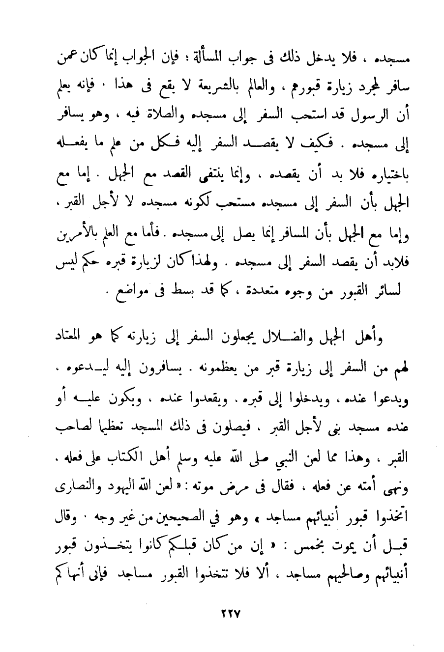 مَسْجِدِهِ فَلَا يَدْخُلُ ذَلِكَ فِي جَوَابِ الْمَسْأَلَةِ؛ فَإِنَّ الْجَوَابَ إنَّمَا كَانَ عَمَّنْ سَافَرَ لِمُجَرَّدِ زِيَارَةِ قُبُورِهِمْ وَالْعَالِمُ بِالشَّرِيعَةِ لَا يَقَعُ فِي هَذَا فَإِنَّهُ يَعْلَمُ أَنَّ الرَّسُولَ قَدْ اسْتَحَبَّ السَّفَرَ إلَى مَسْجِدِهِ وَالصَّلَاةَ فِيهِ وَهُوَ يُسَافِرُ إلَى مَسْجِدِهِ. فَكَيْفَ لَا يَقْصِدُ السَّفَرَ إلَيْهِ فَكُلُّ مَنْ عَلِمَ مَا يَفْعَلُهُ بِاخْتِيَارِهِ فَلَا بُدَّ أَنْ يَقْصِدَهُ وَإِنَّمَا يَنْتَفِي الْقَصْدُ مَعَ الْجَهْلِ. إمَّا مَعَ الْجَهْلِ بِأَنَّ السَّفَرَ إلَى مَسْجِدِهِ مُسْتَحَبٌّ كَوْنُهُ مَسْجِدَهُ لَا لِأَجْلِ الْقَبْرِ وَإِمَّا مَعَ الْجَهْلِ بِأَنَّ الْمُسَافِرَ إنَّمَا يَصِلُ إلَى مَسْجِدِهِ. فَأَمَّا مَعَ الْعِلْمِ بِالْأَمْرَيْنِ فَلَا بُدَّ أَنْ يَقْصِدَ السَّفَرَ إلَى مَسْجِدِهِ. وَلِهَذَا كَانَ لِزِيَارَةِ قَبْرِهِ حُكْمٌ لَيْسَ لِسَائِرِ الْقُبُورِ مِنْ وُجُوهٍ مُتَعَدِّدَةٍ كَمَا قَدْ بُسِطَ فِي مَوَاضِعَ. وَأَهْلُ الْجَهْلِ وَالضَّلَالِ يَجْعَلُونَ السَّفَرَ إلَى زِيَارَتِهِ كَمَا هُوَ الْمُعْتَادُ لَهُمْ مِنْ السَّفَرِ إلَى زِيَارَةِ قَبْرِ مَنْ يُعَظِّمُونَهُ. يُسَافِرُونَ إلَيْهِ لِيَدْعُوهُ وَيَدْعُوا عِنْدَهُ وَيَدْخُلُوا إلَى قَبْرِهِ وَيَقْعُدُوا عِنْدَهُ وَيَكُونُ عَلَيْهِ أَوْ عِنْدَهُ مَسْجِدٌ بُنِيَ لِأَجْلِ الْقَبْرِ فَيُصَلُّونَ فِي ذَلِكَ الْمَسْجِدِ تَعْظِيمًا لِصَاحِبِ الْقَبْرِ وَهَذَا مِمَّا لَعَنَ النَّبِيُّ صَلَّى اللَّهُ عَلَيْهِ وَسَلَّمَ أَهْلَ الْكِتَابِ عَلَى فِعْلِهِ وَنَهَى أُمَّتَهُ عَنْ فِعْلِهِ فَقَالَ فِي مَرَضِ مَوْتِهِ: {لَعَنَ اللَّهُ الْيَهُودَ وَالنَّصَارَى اتَّخَذُوا قُبُورَ أَنْبِيَائِهِمْ مَسَاجِدَ} وَهُوَ فِي الصَّحِيحَيْنِ مِنْ غَيْرِ وَجْهٍ وَقَالَ قَبْلَ أَنْ يَمُوتَ بِخَمْسِ: {إنَّ مَنْ كَانَ قَبْلَكُمْ كَانُوا يَتَّخِذُونَ قُبُورَ أَنْبِيَائِهِمْ وَصَالِحِيهِمْ مَسَاجِدَ أَلَا فَلَا تَتَّخِذُوا الْقُبُورَ مَسَاجِدَ فَإِنِّي أَنْهَاكُمْ