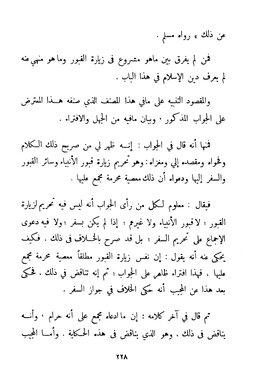 عَنْ ذَلِكَ} رَوَاهُ مُسْلِمٌ. فَمَنْ لَمْ يُفَرِّقْ بَيْنَ مَا هُوَ مَشْرُوعٌ فِي زِيَارَةِ الْقُبُورِ وَمَا هُوَ مَنْهِيٌّ عَنْهُ لَمْ يَعْرِفْ دِينَ الْإِسْلَامِ فِي هَذَا الْبَابِ. وَالْمَقْصُودُ التَّنْبِيهُ عَلَى مَا فِي هَذَا الْمُصَنَّفِ الَّذِي صَنَّفَهُ هَذَا الْمُعْتَرِضُ عَلَى الْجَوَابِ الْمَذْكُورِ وَبَيَانُ مَا فِيهِ مِنْ الْجَهْلِ وَالِافْتِرَاءِ. فَمِنْهَا أَنَّهُ قَالَ فِي الْجَوَابِ: إنَّهُ ظَهَرَ لِي مِنْ صَرِيحِ ذَلِكَ الْكَلَامِ وَفَحْوَاهُ وَمَقْصِدِهِ إلَيَّ وَمَغْزَاهُ: وَهُوَ تَحْرِيمُ زِيَارَةِ قُبُورِ الْأَنْبِيَاءِ وَسَائِرِ الْقُبُورِ وَالسَّفَرِ إلَيْهَا وَدَعْوَاهُ أَنَّ ذَلِكَ مَعْصِيَةٌ مُحَرَّمَةٌ مُجْمَعٌ عَلَيْهَا. فَيُقَالُ: مَعْلُومٌ لِكُلِّ مَنْ رَأَى الْجَوَابَ أَنَّهُ لَيْسَ فِيهِ تَحْرِيمٌ لِزِيَارَةِ الْقُبُورِ؛ لَا قُبُورِ الْأَنْبِيَاءِ وَلَا غَيْرِهِمْ؛ إذَا لَمْ يَكُنْ بِسَفَرِ؛ وَلَا فِيهِ دَعْوَى الْإِجْمَاعِ عَلَى تَحْرِيمِ السَّفَرِ؛ بَلْ قَدْ صَرَّحَ بِالْخِلَافِ فِي ذَلِكَ. فَكَيْفَ يُحْكَى عَنْهُ أَنَّهُ يَقُولُ: إنَّ نَفْسَ زِيَارَةِ الْقُبُورِ مُطْلَقًا مَعْصِيَةٌ مُحَرَّمَةٌ مُجْمَعٌ عَلَيْهَا فَهَذَا افْتِرَاءٌ ظَاهِرٌ عَلَى الْجَوَابِ؛ ثُمَّ إنَّهُ تَنَاقَضَ فِي ذَلِكَ فَحَكَى بَعْدَ هَذَا عَنْ الْمُجِيبِ أَنَّهُ حَكَى الْخِلَافَ فِي جَوَازِ السَّفَرِ. ثُمَّ قَالَ فِي آخِرِ كَلَامِهِ: إنَّ مَا ادَّعَاهُ مُجْمَعٌ عَلَى أَنَّهُ حَرَامٌ وَأَنَّهُ يُنَاقِضُ فِي ذَلِكَ وَهُوَ الَّذِي يُنَاقِضُ فِي هَذِهِ الْحِكَايَةِ. وَأَمَّا الْمُجِيبُ