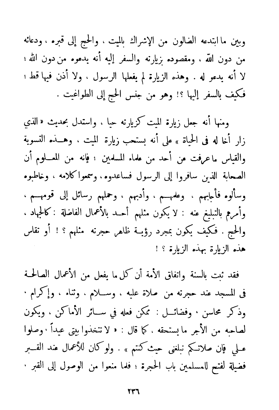 وَبَيْنَ مَا ابْتَدَعَهُ الضَّالُّونَ مِنْ الْإِشْرَاكِ بِالْمَيِّتِ وَالْحَجِّ إلَى قَبْرِهِ وَدُعَائِهِ مِنْ دُونِ اللَّهِ وَمَقْصُودُهُ بِزِيَارَتِهِ وَالسَّفَرِ إلَيْهِ أَنَّهُ يَدْعُوهُ مِنْ دُونِ اللَّهِ؛ لَا أَنَّهُ يَدْعُو لَهُ. وَهَذِهِ الزِّيَارَةُ لَمْ يَفْعَلْهَا الرَّسُولُ وَلَا أَذِنَ فِيهَا قَطُّ؛ فَكَيْفَ بِالسَّفَرِ إلَيْهَا وَهُوَ مِنْ جِنْسِ الْحَجِّ إلَى الطَّوَاغِيتِ.