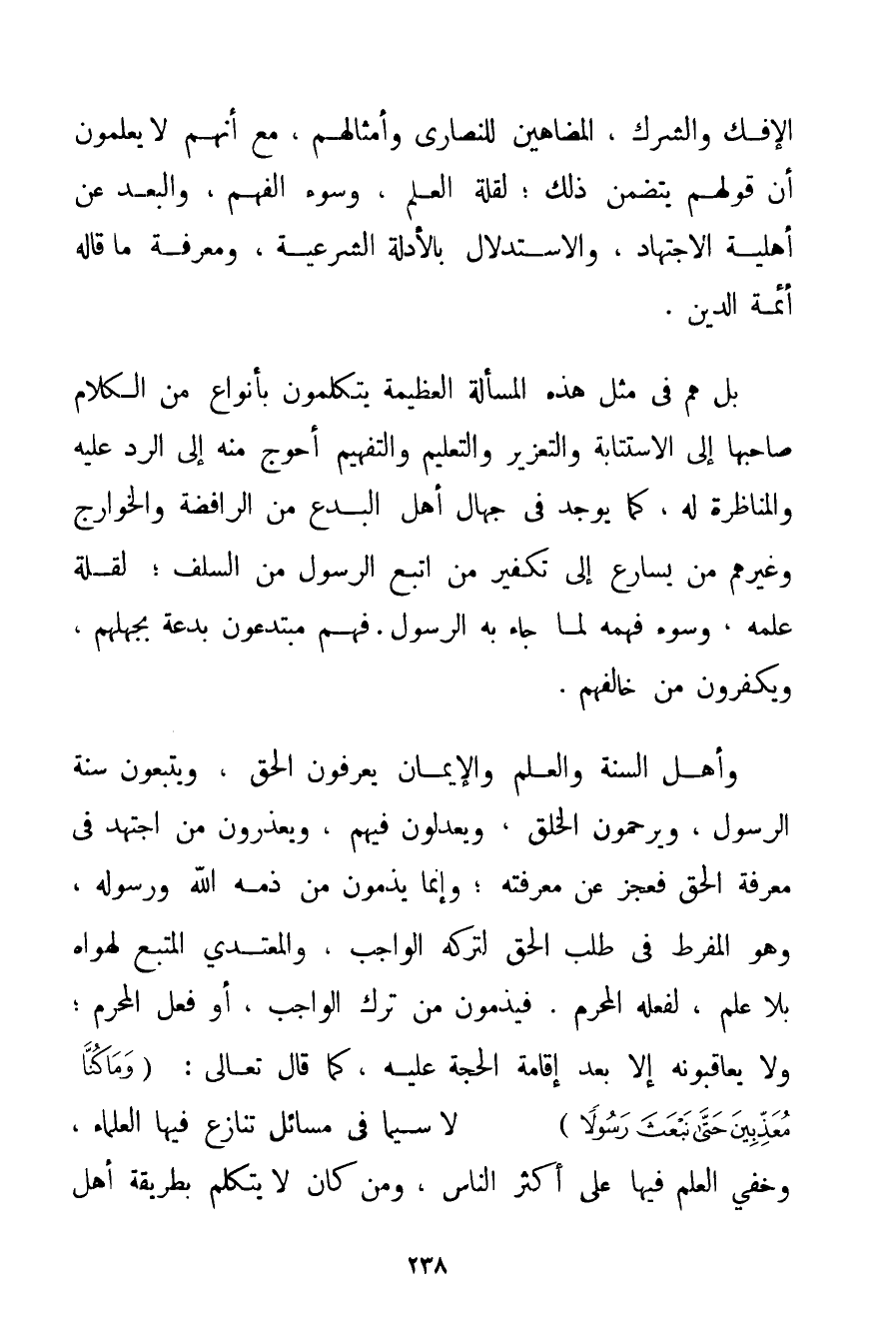 الْإِفْكِ وَالشِّرْكِ الْمُضَاهِينَ لِلنَّصَارَى وَأَمْثَالِهِمْ مَعَ أَنَّهُمْ لَا يَعْلَمُونَ أَنَّ قَوْلَهُمْ يَتَضَمَّنُ ذَلِكَ؛ لِقِلَّةِ الْعِلْمِ وَسُوءِ الْفَهْمِ وَالْبُعْدِ عَنْ أَهْلِيَّةِ الِاجْتِهَادِ وَالِاسْتِدْلَالِ بِالْأَدِلَّةِ الشَّرْعِيَّةِ وَمَعْرِفَةِ مَا قَالَهُ أَئِمَّةُ الدِّينِ. بَلْ هُمْ فِي مِثْلِ هَذِهِ الْمَسْأَلَةِ الْعَظِيمَةِ يَتَكَلَّمُونَ بِأَنْوَاعِ مِنْ الْكَلَامِ صَاحِبُهَا إلَى الِاسْتِتَابَةِ وَالتَّعْزِيرِ وَالتَّعْلِيمِ وَالتَّفْهِيمِ أَحْوَجُ مِنْهُ إلَى الرَّدِّ عَلَيْهِ وَالْمُنَاظَرَةِ لَهُ كَمَا يُوجَدُ فِي جُهَّالِ أَهْلِ الْبِدَعِ مِنْ الرَّافِضَةِ وَالْخَوَارِجِ وَغَيْرِهِمْ مَنْ يُسَارِعُ إلَى تَكْفِيرِ مَنْ اتَّبَعَ الرَّسُولَ مَنْ السَّلَفِ؛ لِقِلَّةِ عِلْمِهِ وَسُوءِ فَهْمِهِ لِمَا جَاءَ بِهِ الرَّسُولُ. فَهُمْ مُبْتَدِعُونَ بِدْعَةً بِجَهْلِهِمْ وَيُكَفِّرُونَ مَنْ خَالَفَهُمْ. وَأَهْلُ السُّنَّةِ وَالْعِلْمِ وَالْإِيمَانِ يَعْرِفُونَ الْحَقَّ وَيَتَّبِعُونَ سُنَّةَ الرَّسُولِ وَيَرْحَمُونَ الْخَلْقَ وَيَعْدِلُونَ فِيهِمْ وَيَعْذُرُونَ مَنْ اجْتَهَدَ فِي مَعْرِفَةِ الْحَقِّ فَعَجَزَ عَنْ مَعْرِفَتِهِ؛ إنَّمَا يَذُمُّونَ مَنْ ذَمَّهُ اللَّهُ وَرَسُولُهُ وَهُوَ الْمُفَرِّطُ فِي طَلَبِ الْحَقِّ لِتَرْكِهِ الْوَاجِبَ وَالْمُعْتَدِي الْمُتَّبِعُ لِهَوَاهُ بِلَا عِلْمٍ لِفِعْلِهِ الْمُحَرَّمَ. فَيَذُمُّونَ مَنْ تَرَكَ الْوَاجِبَ أَوْ فَعَلَ الْمُحَرَّمَ؛ وَلَا يُعَاقِبُونَهُ إلَّا بَعْدَ إقَامَةِ الْحُجَّةِ عَلَيْهِ كَمَا قَالَ تَعَالَى: {وَمَا كُنَّا مُعَذِّبِينَ حَتَّى نَبْعَثَ رَسُولًا} لَا سِيَّمَا فِي مَسَائِلَ تَنَازَعَ فِيهَا الْعُلَمَاءُ وَخَفِيَ الْعِلْمُ فِيهَا عَلَى أَكْثَرِ النَّاسِ وَمَنْ كَانَ لَا يَتَكَلَّمُ بِطَرِيقَةِ أَهْلِ