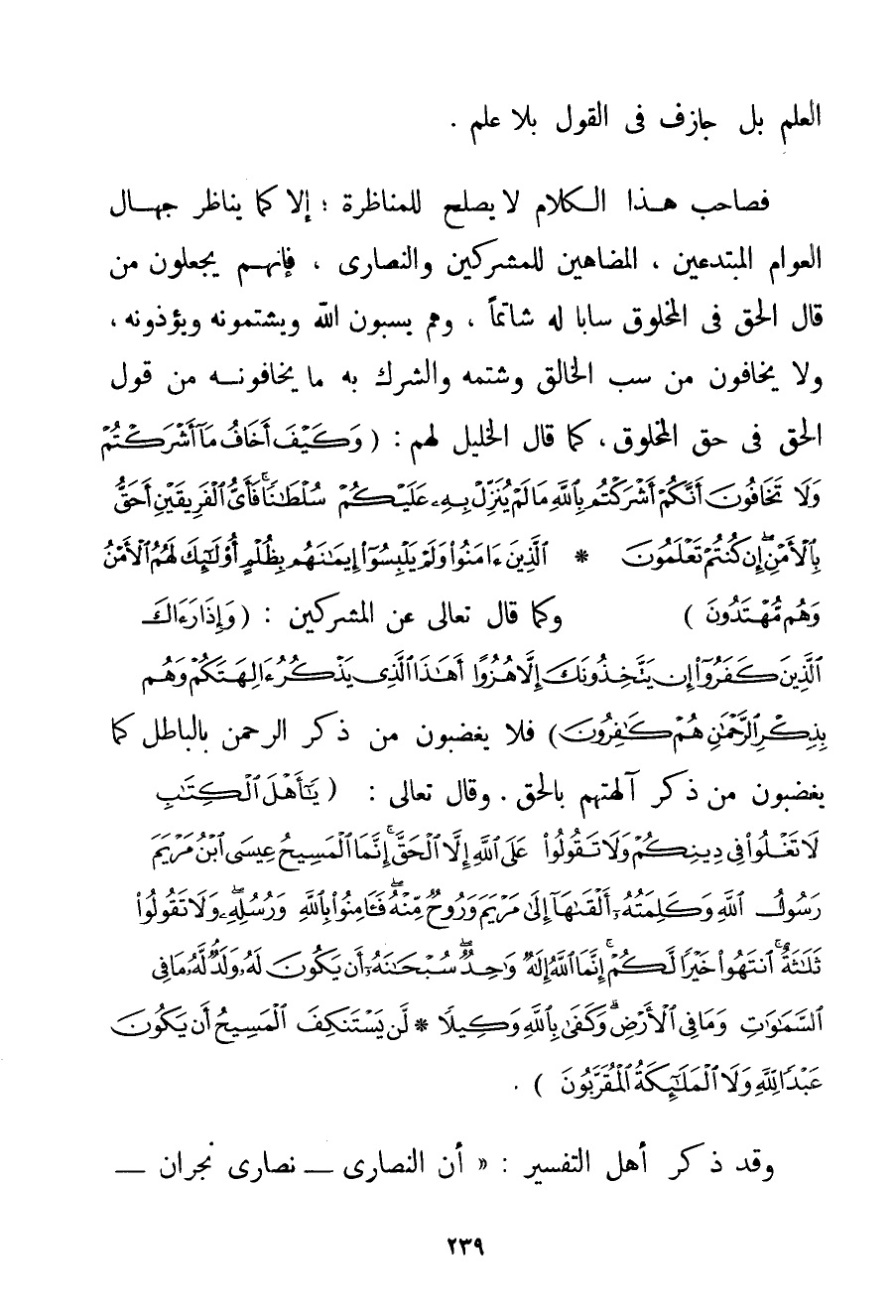 الْعِلْمِ بَلْ جَازَفَ فِي الْقَوْلِ بِلَا عِلْمٍ. فَصَاحِبُ هَذَا الْكَلَامِ لَا يَصْلُحُ لِلْمُنَاظَرَةِ؛ إلَّا كَمَا يُنَاظَرُ جُهَّالُ الْعَوَامِّ الْمُبْتَدِعِينَ الْمُضَاهِينَ لِلْمُشْرِكِينَ وَالنَّصَارَى فَإِنَّهُمْ يَجْعَلُونَ مَنْ قَالَ الْحَقَّ فِي الْمَخْلُوقِ سَابًّا لَهُ شَاتِمًا وَهُمْ يَسُبُّونَ اللَّهَ وَيَشْتُمُونَهُ وَيُؤْذُونَهُ وَلَا يَخَافُونَ مَنْ سَبِّ الْخَالِقِ وَشَتْمِهِ وَالشِّرْكِ بِهِ مَا يَخَافُونَهُ مِنْ قَوْلِ الْحَقِّ فِي حَقِّ الْمَخْلُوقِ كَمَا قَالَ الْخَلِيلُ لَهُمْ: {وَكَيْفَ أَخَافُ مَا أَشْرَكْتُمْ وَلَا تَخَافُونَ أَنَّكُمْ أَشْرَكْتُمْ بِاللَّهِ مَا لَمْ يُنَزِّلْ بِهِ عَلَيْكُمْ سُلْطَانًا فَأَيُّ الْفَرِيقَيْنِ أَحَقُّ بِالْأَمْنِ إنْ كُنْتُمْ تَعْلَمُونَ} {الَّذِينَ آمَنُوا وَلَمْ يَلْبِسُوا إيمَانَهُمْ بِظُلْمٍ أُولَئِكَ لَهُمُ الْأَمْنُ وَهُمْ مُهْتَدُونَ} وَكَمَا قَالَ تَعَالَى عَنْ الْمُشْرِكِينَ: {وَإِذَا رَآكَ الَّذِينَ كَفَرُوا إنْ يَتَّخِذُونَكَ إلَّا هُزُوًا أَهَذَا الَّذِي يَذْكُرُ آلِهَتَكُمْ وَهُمْ بِذِكْرِ الرَّحْمَنِ هُمْ كَافِرُونَ} فَلَا يَغْضَبُونَ مَنْ ذِكْرِ الرَّحْمَنِ بِالْبَاطِلِ كَمَا يَغْضَبُونَ مِنْ ذِكْرِ آلِهَتِهِمْ بِالْحَقِّ. وَقَالَ تَعَالَى: {يَا أَهْلَ الْكِتَابِ لَا تَغْلُوا فِي دِينِكُمْ وَلَا تَقُولُوا عَلَى اللَّهِ إلَّا الْحَقَّ إنَّمَا الْمَسِيحُ عِيسَى ابْنُ مَرْيَمَ رَسُولُ اللَّهِ وَكَلِمَتُهُ أَلْقَاهَا إلَى مَرْيَمَ وَرُوحٌ مِنْهُ فَآمِنُوا بِاللَّهِ وَرُسُلِهِ وَلَا تَقُولُوا ثَلَاثَةٌ انْتَهُوا خَيْرًا لَكُمْ إنَّمَا اللَّهُ إلَهٌ وَاحِدٌ سُبْحَانَهُ أَنْ يَكُونَ لَهُ وَلَدٌ لَهُ مَا فِي السَّمَاوَاتِ وَمَا فِي الْأَرْضِ وَكَفَى بِاللَّهِ وَكِيلًا} {لَنْ يَسْتَنْكِفَ الْمَسِيحُ أَنْ يَكُونَ عَبْدًا لِلَّهِ وَلَا الْمَلَائِكَةُ الْمُقَرَّبُونَ.} وَقَدْ ذَكَرَ أَهْلُ التَّفْسِيرِ: {أَنَّ النَّصَارَى - نَصَارَى نَجْرَانَ -