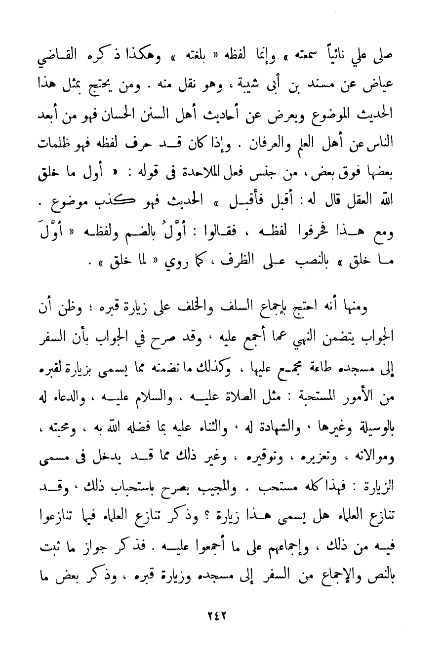 صَلَّى عَلَيَّ نَائِيًا سَمِعْته} وَإِنَّمَا لَفْظُهُ {بُلِّغْته} وَهَكَذَا ذَكَرَهُ الْقَاضِي عِيَاضٌ عَنْ مُسْنَدِ بْنِ أَبِي شَيْبَةَ وَهُوَ نَقْلٌ مِنْهُ. وَمَنْ يَحْتَجُّ بِمِثْلِ هَذَا الْحَدِيثِ الْمَوْضُوعِ وَيُعْرِضُ عَنْ أَحَادِيثِ أَهْلِ السُّنَنِ الْحِسَانِ فَهُوَ مِنْ أَبْعَدِ النَّاسِ عَنْ أَهْلِ الْعِلْمِ وَالْعِرْفَانِ. وَإِذَا كَانَ قَدْ حَرَّفَ لَفْظَهُ فَهُوَ ظُلُمَاتٌ بَعْضُهَا فَوْقَ بَعْضٍ مِنْ جِنْسِ فِعْلِ الْمَلَاحِدَةِ فِي قَوْلِهِ: {أَوَّلُ مَا خَلَقَ اللَّهُ الْعَقْلَ قَالَ لَهُ: أَقْبِلْ فَأَقْبَلَ} الْحَدِيثُ فَهُوَ كَذِبٌ مَوْضُوعٌ. وَمَعَ هَذَا فَحَرَّفُوا لَفْظَهُ فَقَالُوا: أَوَّلُ بِالضَّمِّ وَلَفْظُهُ {أَوَّلَ مَا خَلَقَ} بِالنَّصْبِ عَلَى الظَّرْفِ كَمَا رُوِيَ " لَمَّا خَلَقَ ". وَمِنْهَا أَنَّهُ احْتَجَّ بِإِجْمَاعِ السَّلَفِ وَالْخَلَفِ عَلَى زِيَارَةِ قَبْرِهِ؛ وَظَنَّ أَنَّ الْجَوَابَ يَتَضَمَّنُ النَّهْيَ عَمَّا أُجْمِعَ عَلَيْهِ وَقَدْ صَرَّحَ فِي الْجَوَابِ بِأَنَّ السَّفَرَ إلَى مَسْجِدِهِ طَاعَةٌ مُجْمَعٌ عَلَيْهَا وَكَذَلِكَ مَا تَضَمَّنَهُ مِمَّا يُسَمَّى بِزِيَارَةِ لِقَبْرِهِ مِنْ الْأُمُورِ الْمُسْتَحَبَّةِ: مِثْلَ الصَّلَاةِ عَلَيْهِ وَالسَّلَامِ عَلَيْهِ وَالدُّعَاءِ لَهُ بِالْوَسِيلَةِ وَغَيْرِهَا وَالشَّهَادَةِ لَهُ وَالثَّنَاءِ عَلَيْهِ بِمَا فَضَّلَهُ اللَّهُ بِهِ وَمَحَبَّتِهِ وَمُوَالَاتِهِ وَتَعْزِيرِهِ وَتَوْقِيرِهِ وَغَيْرِ ذَلِكَ مِمَّا قَدْ يَدْخُلُ فِي مُسَمَّى الزِّيَارَةِ: فَهَذَا كُلُّهُ مُسْتَحَبٌّ. وَالْمُجِيبُ يُصَرِّحُ بِاسْتِحْبَابِ ذَلِكَ وَقَدْ تَنَازَعَ الْعُلَمَاءُ هَلْ يُسَمَّى هَذَا زِيَارَةً؟ وَذَكَرَ تَنَازُعَ الْعُلَمَاءِ فِيمَا تَنَازَعُوا فِيهِ مِنْ ذَلِكَ وَإِجْمَاعَهُمْ عَلَى مَا أَجْمَعُوا عَلَيْهِ. فَذَكَرَ جَوَازَ مَا ثَبَتَ بِالنَّصِّ وَالْإِجْمَاعِ مِنْ السَّفَرِ إلَى مَسْجِدِهِ وَزِيَارَةِ قَبْرِهِ وَذَكَرَ بَعْضَ مَا