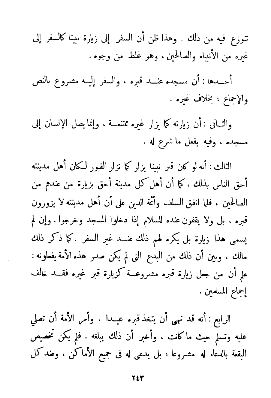 تُنُوزِعَ فِيهِ مِنْ ذَلِكَ. وَهَذَا ظَنَّ أَنَّ السَّفَرَ إلَى زِيَارَةِ نَبِيِّنَا كَالسَّفَرِ إلَى غَيْرِهِ مِنْ الْأَنْبِيَاءِ وَالصَّالِحِينَ وَهُوَ غَلَطٌ مِنْ وُجُوهٍ. أَحَدُهَا: أَنَّ مَسْجِدَهُ عِنْدَ قَبْرِهِ وَالسَّفَرَ إلَيْهِ مَشْرُوعٌ بِالنَّصِّ وَالْإِجْمَاعِ؛ بِخِلَافِ غَيْرِهِ. وَالثَّانِي: أَنَّ زِيَارَتَهُ كَمَا يُزَارُ غَيْرُهُ مُمْتَنِعَةٌ وَإِنَّمَا يَصِلُ الْإِنْسَانُ إلَى مَسْجِدِهِ وَفِيهِ يَفْعَلُ مَا شُرِعَ لَهُ. الثَّالِثُ: أَنَّهُ لَوْ كَانَ قَبْرُ نَبِيِّنَا يُزَارُ كَمَا تُزَارُ الْقُبُورُ لَكَانَ أَهْلُ مَدِينَتِهِ أَحَقَّ النَّاسِ بِذَلِكَ كَمَا أَنَّ أَهْلَ كُلِّ مَدِينَةٍ أَحَقُّ بِزِيَارَةِ مَنْ عِنْدَهُمْ مِنْ الصَّالِحِينَ فَلَمَّا اتَّفَقَ السَّلَفُ وَأَئِمَّةُ الدِّينِ عَلَى أَنَّ أَهْلَ مَدِينَتِهِ لَا يَزُورُونَ قَبْرَهُ بَلْ وَلَا يَقِفُونَ عِنْدَهُ لِلسَّلَامِ إذَا دَخَلُوا الْمَسْجِدَ وَخَرَجُوا. وَإِنْ لَمْ يُسَمَّى هَذَا زِيَارَةً بَلْ يُكْرَهُ لَهُمْ ذَلِكَ عِنْدَ غَيْرِ السَّفَرِ كَمَا ذَكَرَ ذَلِكَ مَالِكٌ وَبَيَّنَ أَنَّ ذَلِكَ مِنْ الْبِدَعِ الَّتِي لَمْ يَكُنْ صَدْرُ هَذِهِ الْأُمَّةِ يَفْعَلُونَهُ: عُلِمَ أَنَّ مَنْ جَعَلَ زِيَارَةَ قَبْرِهِ مَشْرُوعَةً كَزِيَارَةِ قَبْرِ غَيْرِهِ فَقَدْ خَالَفَ إجْمَاعَ الْمُسْلِمِينَ. الرَّابِعُ: أَنَّهُ قَدْ نَهَى أَنْ يُتَّخَذَ قَبْرُهُ عِيدًا وَأَمَرَ الْأُمَّةَ أَنْ تُصَلِّيَ عَلَيْهِ وَتُسَلِّمَ حَيْثُ مَا كَانَتْ وَأَخْبَرَ أَنَّ ذَلِكَ يَبْلُغُهُ. فَلَمْ يَكُنْ تَخْصِيصُ الْبُقْعَةِ بِالدُّعَاءِ لَهُ مَشْرُوعًا؛ بَلْ يُدْعَى لَهُ فِي جَمِيعِ الْأَمَاكِنِ وَعِنْدَ كُلِّ