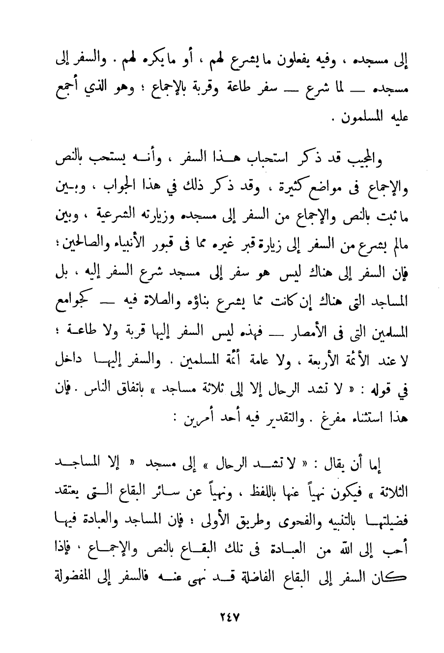 إلَى مَسْجِدِهِ وَفِيهِ يَفْعَلُونَ مَا يُشْرَعُ لَهُمْ أَوْ مَا يُكْرَهُ لَهُمْ. وَالسَّفَرُ إلَى مَسْجِدِهِ - لَمَّا شُرِعَ - سَفَرُ طَاعَةٍ وَقُرْبَةٍ بِالْإِجْمَاعِ؛ وَهُوَ الَّذِي أَجْمَعَ عَلَيْهِ الْمُسْلِمُونَ. وَالْمُجِيبُ قَدْ ذَكَرَ اسْتِحْبَابَ هَذَا السَّفَرِ وَأَنَّهُ يُسْتَحَبُّ بِالنَّصِّ وَالْإِجْمَاعِ فِي مَوَاضِعَ كَثِيرَةٍ وَقَدْ ذَكَرَ ذَلِكَ فِي هَذَا الْجَوَابِ وَبَيَّنَ مَا ثَبَتَ بِالنَّصِّ وَالْإِجْمَاعِ مِنْ السَّفَرِ إلَى مَسْجِدِهِ وَزِيَارَتِهِ الشَّرْعِيَّةِ وَبَيَّنَ مَا لَمْ يُشْرَعْ مِنْ السَّفَرِ إلَى زِيَارَةِ قَبْرِ غَيْرِهِ مِمَّا فِي قُبُورِ الْأَنْبِيَاءِ وَالصَّالِحِينَ؛ فَإِنَّ السَّفَرَ إلَى هُنَاكَ لَيْسَ هُوَ سَفَرٌ إلَى مَسْجِدٍ شُرِعَ السَّفَرُ إلَيْهِ بَلْ الْمَسَاجِدُ الَّتِي هُنَاكَ إنْ كَانَتْ مِمَّا يُشْرَعُ بِنَاؤُهُ وَالصَّلَاةُ فِيهِ - كَجَوَامِعِ الْمُسْلِمِينَ الَّتِي فِي الْأَمْصَارِ - فَهَذِهِ لَيْسَ السَّفَرُ إلَيْهَا قُرْبَةً وَلَا طَاعَةً؛ لَا عِنْدَ الْأَئِمَّةِ الْأَرْبَعَةِ وَلَا عَامَّةِ أَئِمَّةِ الْمُسْلِمِينَ. وَالسَّفَرُ إلَيْهَا دَاخِلٌ فِي قَوْلِهِ: {لَا تُشَدُّ الرِّحَالُ إلَّا إلَى ثَلَاثَةِ مَسَاجِدَ} بِاتِّفَاقِ النَّاسِ. فَإِنَّ هَذَا اسْتِثْنَاءٌ مُفْرَغٌ. وَالتَّقْدِيرُ فِيهِ أَحَدُ أَمْرَيْنِ: إمَّا أَنْ يُقَالَ: {لَا تُشَدُّ الرِّحَالُ} إلَى مَسْجِدٍ {إلَّا الْمَسَاجِدَ الثَّلَاثَةَ} فَيَكُونُ نَهْيًا عَنْهَا بِاللَّفْظِ وَنَهْيًا عَنْ سَائِرِ الْبِقَاعِ الَّتِي يُعْتَقَدُ فَضِيلَتُهَا بِالتَّنْبِيهِ وَالْفَحْوَى وَطَرِيقِ الْأَوْلَى؛ فَإِنَّ الْمَسَاجِدَ وَالْعِبَادَةَ فِيهَا أَحَبُّ إلَى اللَّهِ مِنْ الْعِبَادَةِ فِي تِلْكَ الْبِقَاعِ بِالنَّصِّ وَالْإِجْمَاعِ فَإِذَا كَانَ السَّفَرُ إلَى الْبِقَاعِ الْفَاضِلَةِ قَدْ نُهِيَ عَنْهُ فَالسَّفَرُ إلَى المفضولة