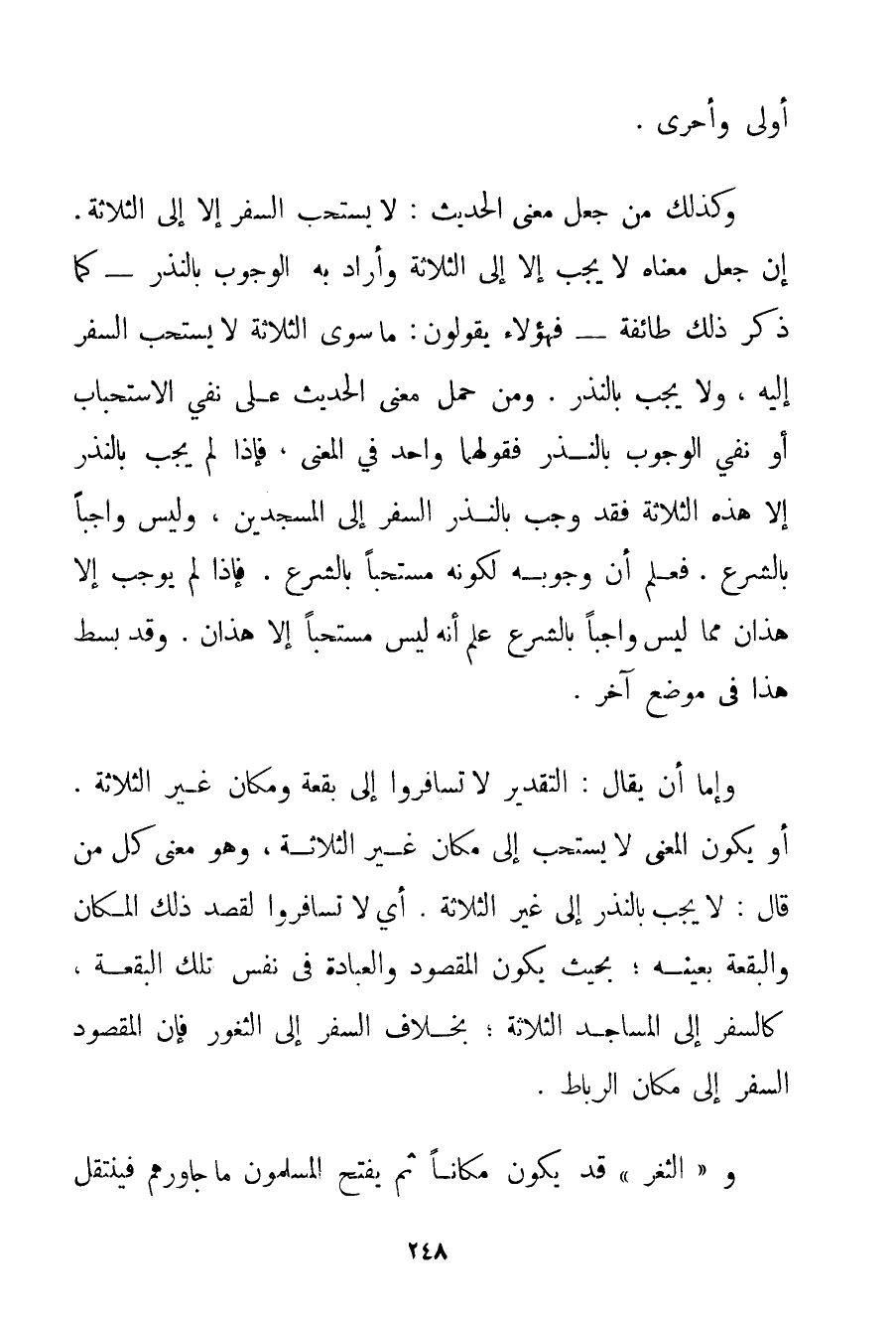 أَوْلَى وَأَحْرَى. وَكَذَلِكَ مَنْ جَعَلَ مَعْنَى الْحَدِيثِ: لَا يُسْتَحَبُّ السَّفَرُ إلَّا إلَى الثَّلَاثَةِ. إنْ جَعَلَ مَعْنَاهُ لَا يَجِبُ إلَّا إلَى الثَّلَاثَةِ وَأَرَادَ بِهِ الْوُجُوبَ بِالنَّذْرِ - كَمَا ذَكَرَ ذَلِكَ طَائِفَةٌ - فَهَؤُلَاءِ يَقُولُونَ: مَا سِوَى الثَّلَاثَةِ لَا يُسْتَحَبُّ السَّفَرُ إلَيْهِ وَلَا يَجِبُ بِالنَّذْرِ. وَمَنْ حَمَلَ مَعْنَى الْحَدِيثِ عَلَى نَفْيِ الِاسْتِحْبَابِ أَوْ نَفْيِ الْوُجُوبِ بِالنَّذْرِ فَقَوْلُهُمَا وَاحِدٌ فِي الْمَعْنَى فَإِذَا لَمْ يَجِبْ بِالنَّذْرِ إلَّا هَذِهِ الثَّلَاثَةُ فَقَدْ وَجَبَ بِالنَّذْرِ السَّفَرُ إلَى الْمَسْجِدَيْنِ وَلَيْسَ وَاجِبًا بِالشَّرْعِ. فَعُلِمَ أَنَّ وُجُوبَهُ لِكَوْنِهِ مُسْتَحَبًّا بِالشَّرْعِ. فَإِذَا لَمْ يَجِبْ إلَّا هَذَانِ مِمَّا لَيْسَ وَاجِبًا بِالشَّرْعِ عُلِمَ أَنَّهُ لَيْسَ مُسْتَحَبًّا إلَّا هَذَانِ. وَقَدْ بُسِطَ هَذَا فِي مَوْضِعٍ آخَرَ. وَإِمَّا أَنْ يُقَالَ: التَّقْدِيرُ لَا تُسَافِرُوا إلَى بُقْعَةٍ وَمَكَانٍ غَيْرَ الثَّلَاثَةِ. أَوْ يَكُونُ الْمَعْنَى لَا يُسْتَحَبُّ إلَى مَكَانٍ غَيْرَ الثَّلَاثَةِ وَهُوَ مَعْنَى كُلِّ مَنْ قَالَ: لَا يَجِبُ بِالنَّذْرِ إلَى غَيْرِ الثَّلَاثَةِ. أَيْ لَا تُسَافِرُوا لِقَصْدِ ذَلِكَ الْمَكَانِ وَالْبُقْعَةِ بِعَيْنِهِ؛ بِحَيْثُ يَكُونُ الْمَقْصُودُ وَالْعِبَادَةُ فِي نَفْسِ تِلْكَ الْبُقْعَةِ كَالسَّفَرِ إلَى الْمَسَاجِدِ الثَّلَاثَةِ؛ بِخِلَافِ السَّفَرِ إلَى الثُّغُورِ فَإِنَّ الْمَقْصُودَ السَّفَرُ إلَى مَكَانِ الرِّبَاطِ. و " الثَّغْرُ " قَدْ يَكُونُ مَكَانًا ثُمَّ يَفْتَحُ الْمُسْلِمُونَ مَا جَاوَرَهُمْ فَيَنْتَقِلُ