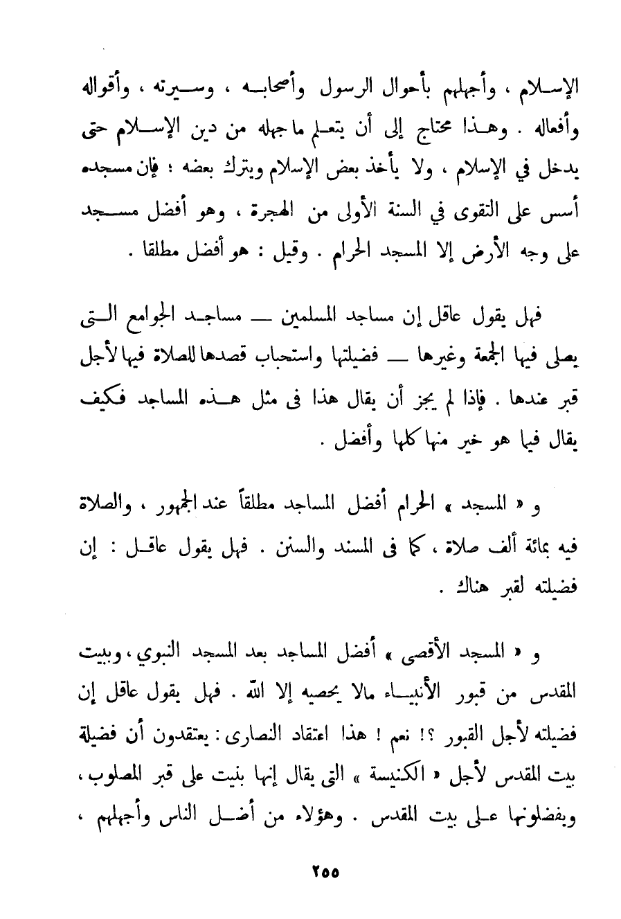 الْإِسْلَامِ وَأَجْهَلِهِمْ بِأَحْوَالِ الرَّسُولِ وَأَصْحَابِهِ وَسِيرَتِهِ وَأَقْوَالِهِ وَأَفْعَالِهِ. وَهَذَا مُحْتَاجٌ إلَى أَنْ يَتَعَلَّمَ مَا جَهِلَهُ مِنْ دِينِ الْإِسْلَامِ حَتَّى يَدْخُلَ فِي الْإِسْلَامِ وَلَا يَأْخُذُ بَعْضَ الْإِسْلَامِ وَيَتْرُكُ بَعْضَهُ؛ فَإِنَّ مَسْجِدَهُ أُسِّسَ عَلَى التَّقْوَى فِي السَّنَةِ الْأُولَى مِنْ الْهِجْرَةِ وَهُوَ أَفْضَلُ مَسْجِدٍ عَلَى وَجْهِ الْأَرْضِ إلَّا الْمَسْجِدَ الْحَرَامَ. وَقِيلَ: هُوَ أَفْضَلُ مُطْلَقًا. فَهَلْ يَقُولُ عَاقِلٌ إنَّ مَسَاجِدَ الْمُسْلِمِينَ - مَسَاجِدُ الْجَوَامِعِ الَّتِي يُصَلَّى فِيهَا الْجُمْعَةُ وَغَيْرُهَا - فَضِيلَتُهَا وَاسْتِحْبَابُ قَصْدِهَا لِلصَّلَاةِ فِيهَا لِأَجْلِ قَبْرٍ عِنْدَهَا. فَإِذَا لَمْ يَجُزْ أَنْ يُقَالَ هَذَا فِي مِثْلِ هَذِهِ الْمَسَاجِدِ فَكَيْفَ يُقَالُ فِيمَا هُوَ خَيْرٌ مِنْهَا كُلِّهَا وَأَفْضَلُ. و " الْمَسْجِدُ " الْحَرَامُ أَفْضَلُ الْمَسَاجِدِ مُطْلَقًا عِنْدَ الْجُمْهُورِ وَالصَّلَاةُ فِيهِ بِمِائَةِ أَلْفِ صَلَاةٍ كَمَا فِي الْمُسْنَدِ وَالسُّنَنِ. فَهَلْ يَقُولُ عَاقِلٌ: إنَّ فَضِيلَتَهُ لِقَبْرِ هُنَاكَ. و " الْمَسْجِدُ الْأَقْصَى " أَفْضَلُ الْمَسَاجِدِ بَعْدَ الْمَسْجِدِ النَّبَوِيِّ وَبِبَيْتِ الْمَقْدِسِ مِنْ قُبُورِ الْأَنْبِيَاءِ مَا لَا يُحْصِيهِ إلَّا اللَّهُ. فَهَلْ يَقُولُ عَاقِلٌ إنَّ فَضِيلَتَهُ لِأَجْلِ الْقُبُورِ نَعَمْ هَذَا اعْتِقَادُ النَّصَارَى: يَعْتَقِدُونَ أَنَّ فَضِيلَةَ بَيْتِ الْمَقْدِسِ لِأَجْلِ " الْكَنِيسَةِ " الَّتِي يُقَالُ إنَّهَا بُنِيَتْ عَلَى قَبْرِ الْمَصْلُوبِ وَيُفَضِّلُونَهَا عَلَى بَيْتِ الْمَقْدِسِ. وَهَؤُلَاءِ مِنْ أَضَلِّ النَّاسِ وَأَجْهَلِهِمْ