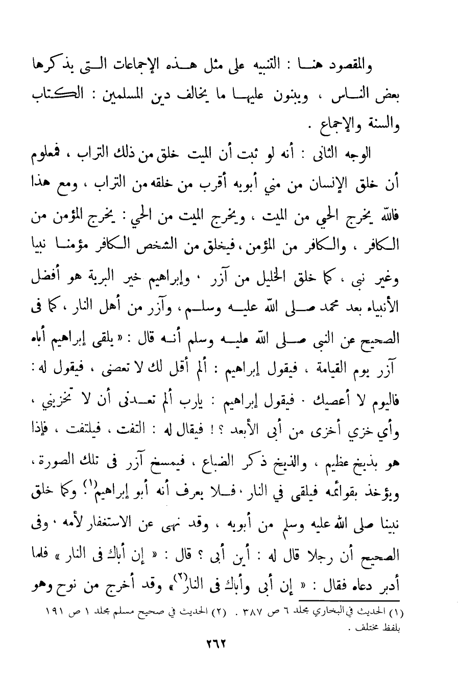 وَالْمَقْصُودُ هُنَا: التَّنْبِيهُ عَلَى مِثْلِ هَذِهِ الإجماعات الَّتِي يَذْكُرُهَا بَعْضُ النَّاسِ وَيَبْنُونَ عَلَيْهَا مَا يُخَالِفُ دِينَ الْمُسْلِمِينَ: الْكِتَابَ وَالسُّنَّةَ وَالْإِجْمَاعَ. الْوَجْهُ الثَّانِي: أَنَّهُ لَوْ ثَبَتَ أَنَّ الْمَيِّتَ خُلِقَ مِنْ ذَلِكَ التُّرَابِ فَمَعْلُومٌ أَنَّ خَلْقَ الْإِنْسَانِ مِنْ مَنِيِّ أَبَوَيْهِ أَقْرَبُ مَنْ خَلْقِهِ مِنْ التُّرَابِ وَمَعَ هَذَا فَاَللَّهُ يُخْرِجُ الْحَيَّ مِنْ الْمَيِّتِ وَيُخْرِجُ الْمَيِّتَ مِنْ الْحَيِّ: يُخْرِجُ الْمُؤْمِنَ مِنْ الْكَافِرِ وَالْكَافِرَ مِنْ الْمُؤْمِنِ فَيَخْلُقُ مِنْ الشَّخْصِ الْكَافِرِ مُؤْمِنًا نَبِيًّا وَغَيْرَ نَبِيٍّ كَمَا خَلَقَ الْخَلِيلَ مِنْ آزَرَ وَإِبْرَاهِيمُ خَيْرُ الْبَرِيَّةِ هُوَ أَفْضَلُ الْأَنْبِيَاءِ بَعْدَ مُحَمَّدٍ صَلَّى اللَّهُ عَلَيْهِ وَسَلَّمَ وَآزَرُ مِنْ أَهْلِ النَّارِ كَمَا فِي الصَّحِيحِ عَنْ النَّبِيِّ صَلَّى اللَّهُ عَلَيْهِ وَسَلَّمَ أَنَّهُ قَالَ: {يَلْقَى إبْرَاهِيمُ أَبَاهُ آزَرَ يَوْمَ الْقِيَامَةِ فَيَقُولُ إبْرَاهِيمُ: أَلَمْ أَقُلْ لَك لَا تَعْصِنِي فَيَقُولُ لَهُ: فَالْيَوْمَ لَا أَعْصِيك. فَيَقُولُ إبْرَاهِيمُ: يَا رَبِّ أَلَمْ تَعِدْنِي أَنْ لَا تُخْزِيَنِي وَأَيُّ خِزْيٍ أَخْزَى مِنْ أَبِي الْأَبْعَدِ فَيُقَالُ لَهُ: الْتَفِتْ فَيَلْتَفِتُ فَإِذَا هُوَ بِذِيخِ عَظِيمٍ وَالذِّيخُ ذَكَرُ الضِّبَاعِ فَيُمْسَخُ آزَرُ فِي تِلْكَ الصُّورَةِ وَيُؤْخَذُ بِقَوَائِمِهِ فَيُلْقَى فِي النَّارِ فَلَا يُعْرَفُ أَنَّهُ أَبُو إبْرَاهِيمَ} . وَكَمَا خُلِقَ نَبِيُّنَا صَلَّى اللَّهُ عَلَيْهِ وَسَلَّمَ مِنْ أَبَوَيْهِ وَقَدْ نُهِيَ عَنْ الِاسْتِغْفَارِ لِأُمِّهِ وَفِي الصَّحِيحِ {أَنَّ رَجُلًا قَالَ لَهُ: أَيْنَ أَبِي؟ قَالَ: إنَّ أَبَاك فِي النَّارِ فَلَمَّا أَدْبَرَ دَعَاهُ فَقَالَ: إنَّ أَبِي وَأَبَاك فِي النَّارِ} وَقَدْ أَخْرَجَ مِنْ نُوحٍ وَهُوَ
