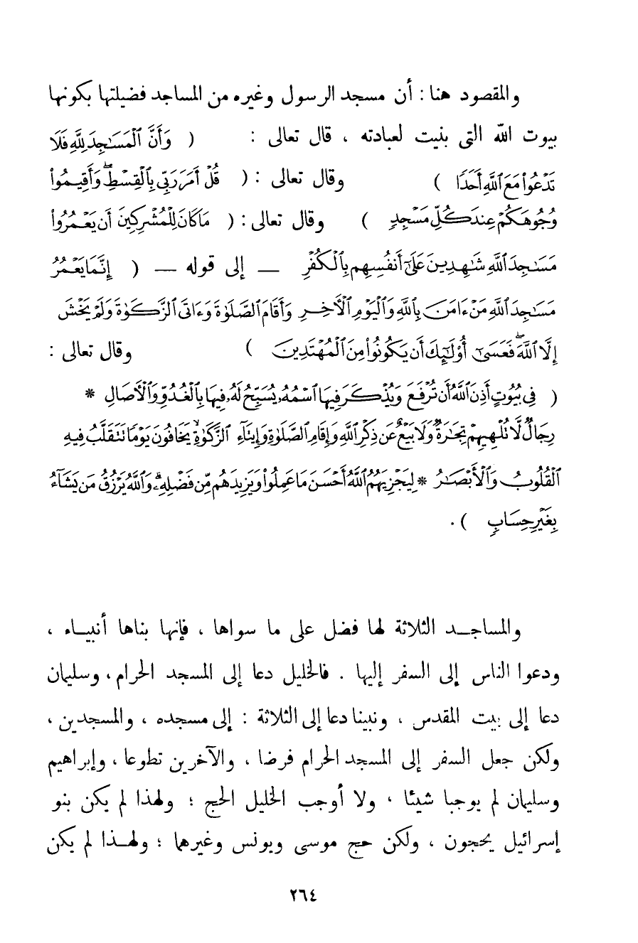 وَالْمَقْصُودُ هُنَا: أَنَّ مَسْجِدَ الرَّسُولِ وَغَيْرَهُ مِنْ الْمَسَاجِدِ فَضِيلَتُهَا بِكَوْنِهَا بُيُوتَ اللَّهِ الَّتِي بُنِيَتْ لِعِبَادَتِهِ قَالَ تَعَالَى: {وَأَنَّ الْمَسَاجِدَ لِلَّهِ فَلَا تَدْعُوا مَعَ اللَّهِ أَحَدًا} وَقَالَ تَعَالَى: {قُلْ أَمَرَ رَبِّي بِالْقِسْطِ وَأَقِيمُوا وُجُوهَكُمْ عِنْدَ كُلِّ مَسْجِدٍ} وَقَالَ تَعَالَى: {مَا كَانَ لِلْمُشْرِكِينَ أَنْ يَعْمُرُوا مَسَاجِدَ اللَّهِ شَاهِدِينَ عَلَى أَنْفُسِهِمْ بِالْكُفْرِ} - إلَى قَوْلِهِ - {إنَّمَا يَعْمُرُ مَسَاجِدَ اللَّهِ مَنْ آمَنَ بِاللَّهِ وَالْيَوْمِ الْآخِرِ وَأَقَامَ الصَّلَاةَ وَآتَى الزَّكَاةَ وَلَمْ يَخْشَ إلَّا اللَّهَ فَعَسَى أُولَئِكَ أَنْ يَكُونُوا مِنَ الْمُهْتَدِينَ} وَقَالَ تَعَالَى: {فِي بُيُوتٍ أَذِنَ اللَّهُ أَنْ تُرْفَعَ وَيُذْكَرَ فِيهَا اسْمُهُ يُسَبِّحُ لَهُ فِيهَا بِالْغُدُوِّ وَالْآصَالِ} {رِجَالٌ لَا تُلْهِيهِمْ تِجَارَةٌ وَلَا بَيْعٌ عَنْ ذِكْرِ اللَّهِ وَإِقَامِ الصَّلَاةِ وَإِيتَاءِ الزَّكَاةِ يَخَافُونَ يَوْمًا تَتَقَلَّبُ فِيهِ الْقُلُوبُ وَالْأَبْصَارُ} {لِيَجْزِيَهُمُ اللَّهُ أَحْسَنَ مَا عَمِلُوا وَيَزِيدَهُمْ مِنْ فَضْلِهِ وَاللَّهُ يَرْزُقُ مَنْ يَشَاءُ بِغَيْرِ حِسَابٍ} .