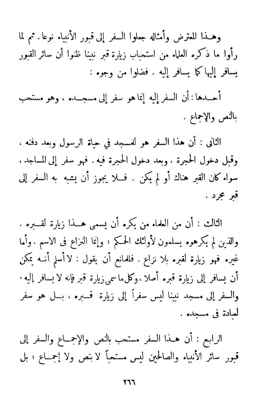 وَاَلَّذِينَ لَمْ يَكْرَهُوهُ يُسَلِّمُونَ لِأُولَئِكَ الْحُكْمَ؛ وَإِنَّمَا النِّزَاعُ فِي الِاسْمِ. وَأَمَّا غَيْرُهُ فَهُوَ زِيَارَةٌ لِقَبْرِهِ بِلَا نِزَاعٍ. فَلِلْمَانِعِ أَنْ يَقُولَ: لَا أُسَلِّمُ أَنَّهُ يُمْكِنُ أَنْ يُسَافَرَ إلَى زِيَارَةِ قَبْرِهِ أَصْلًا وَكُلُّ مَا سُمِّيَ زِيَارَةَ قَبْرٍ فَإِنَّهُ لَا يُسَافَرُ إلَيْهِ وَالسَّفَرُ إلَى مَسْجِدِ نَبِيِّنَا لَيْسَ سَفَرًا إلَى زِيَارَةِ قَبْرِهِ بَلْ هُوَ سَفَرٌ لِعِبَادَةِ فِي مَسْجِدِهِ. الرَّابِعُ: أَنَّ هَذَا السَّفَرَ مُسْتَحَبٌّ بِالنَّصِّ وَالْإِجْمَاعِ وَالسَّفَرَ إلَى قُبُورِ سَائِرِ الْأَنْبِيَاءِ وَالصَّالِحِينَ لَيْسَ مُسْتَحَبًّا لَا بِنَصِّ وَلَا إجْمَاعٍ؛ بَلْ