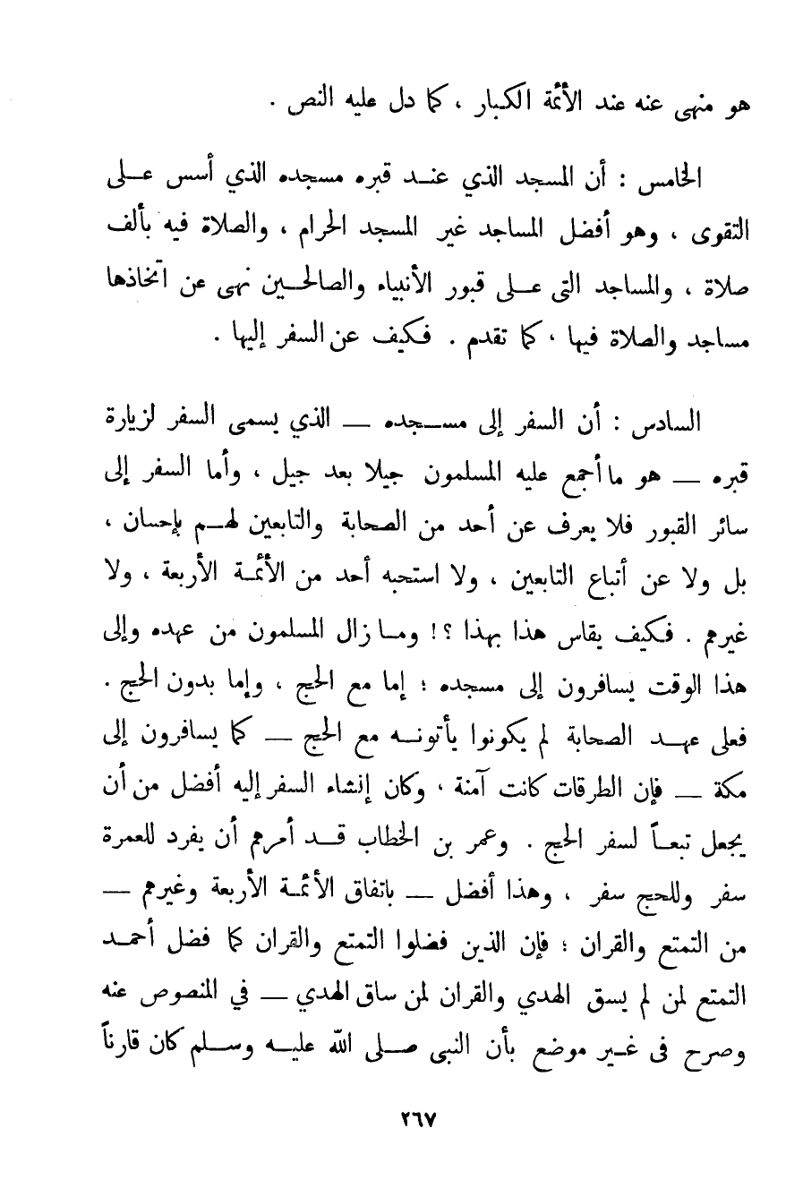 هُوَ مَنْهِيٌّ عَنْهُ عِنْدَ الْأَئِمَّةِ الْكِبَارِ كَمَا دَلَّ عَلَيْهِ النَّصُّ. الْخَامِسُ: أَنَّ الْمَسْجِدَ الَّذِي عِنْدَ قَبْرِهِ مَسْجِدُهُ الَّذِي أُسِّسَ عَلَى التَّقْوَى وَهُوَ أَفْضَلُ الْمَسَاجِدِ غَيْرَ الْمَسْجِدِ الْحَرَامِ وَالصَّلَاةُ فِيهِ بِأَلْفِ صَلَاةٍ وَالْمَسَاجِدُ الَّتِي عَلَى قُبُورِ الْأَنْبِيَاءِ وَالصَّالِحِينَ نُهِيَ عَنْ اتِّخَاذِهَا مَسَاجِدَ وَالصَّلَاةُ فِيهَا كَمَا تَقَدَّمَ. فَكَيْفَ عَنْ السَّفَرِ إلَيْهَا. السَّادِسُ: أَنَّ السَّفَرَ إلَى مَسْجِدِهِ - الَّذِي يُسَمَّى السَّفَرَ لِزِيَارَةِ قَبْرِهِ - هُوَ مَا أَجْمَعَ عَلَيْهِ الْمُسْلِمُونَ جِيلًا بَعْدَ جِيلٍ وَأَمَّا السَّفَرُ إلَى سَائِرِ الْقُبُورِ فَلَا يُعْرَفُ عَنْ أَحَدٍ مِنْ الصَّحَابَةِ وَالتَّابِعِينَ لَهُمْ بِإِحْسَانِ بَلْ وَلَا عَنْ أَتْبَاعِ التَّابِعِينَ وَلَا اسْتَحَبَّهُ أَحَدٌ مِنْ الْأَئِمَّةِ الْأَرْبَعَةِ وَلَا غَيْرِهِمْ. فَكَيْفَ يُقَاسُ هَذَا بِهَذَا؟ وَمَا زَالَ الْمُسْلِمُونَ مِنْ عَهْدِهِ وَإِلَى هَذَا الْوَقْتِ يُسَافِرُونَ إلَى مَسْجِدِهِ؛ إمَّا مَعَ الْحَجِّ وَإِمَّا بِدُونِ الْحَجِّ. فَعَلَى عَهْدِ الصَّحَابَةِ لَمْ يَكُونُوا يَأْتُونَهُ مَعَ الْحَجِّ - كَمَا يُسَافِرُونَ إلَى مَكَّةَ - فَإِنَّ الطُّرُقَاتِ كَانَتْ آمِنَةً وَكَانَ إنْشَاءُ السَّفَرِ إلَيْهِ أَفْضَلَ مِنْ أَنْ يُجْعَلَ تَبَعًا لِسَفَرِ الْحَجِّ. وَعُمَرُ بْنُ الْخَطَّابِ قَدْ أَمَرَهُمْ أَنْ يُفْرِدُوا لِلْعُمْرَةِ سَفَرًا وَلِلْحَجِّ سَفَرًا وَهَذَا أَفْضَلُ - بِاتِّفَاقِ الْأَئِمَّةِ الْأَرْبَعَةِ وَغَيْرِهِمْ - مِنْ التَّمَتُّعِ وَالْقِرَانِ؛ فَإِنَّ الَّذِينَ فَضَّلُوا التَّمَتُّعَ وَالْقِرَانَ كَمَا فَضَّلَ أَحْمَد التَّمَتُّعَ لِمَنْ لَمْ يَسُقْ الْهَدْيَ وَالْقِرَانَ لِمَنْ سَاقَ الْهَدْيَ - فِي الْمَنْصُوصِ عَنْهُ وَصَرَّحَ فِي غَيْرِ مَوْضِعٍ بِأَنَّ النَّبِيَّ صَلَّى اللَّهُ عَلَيْهِ وَسَلَّمَ كَانَ قَارِنًا -