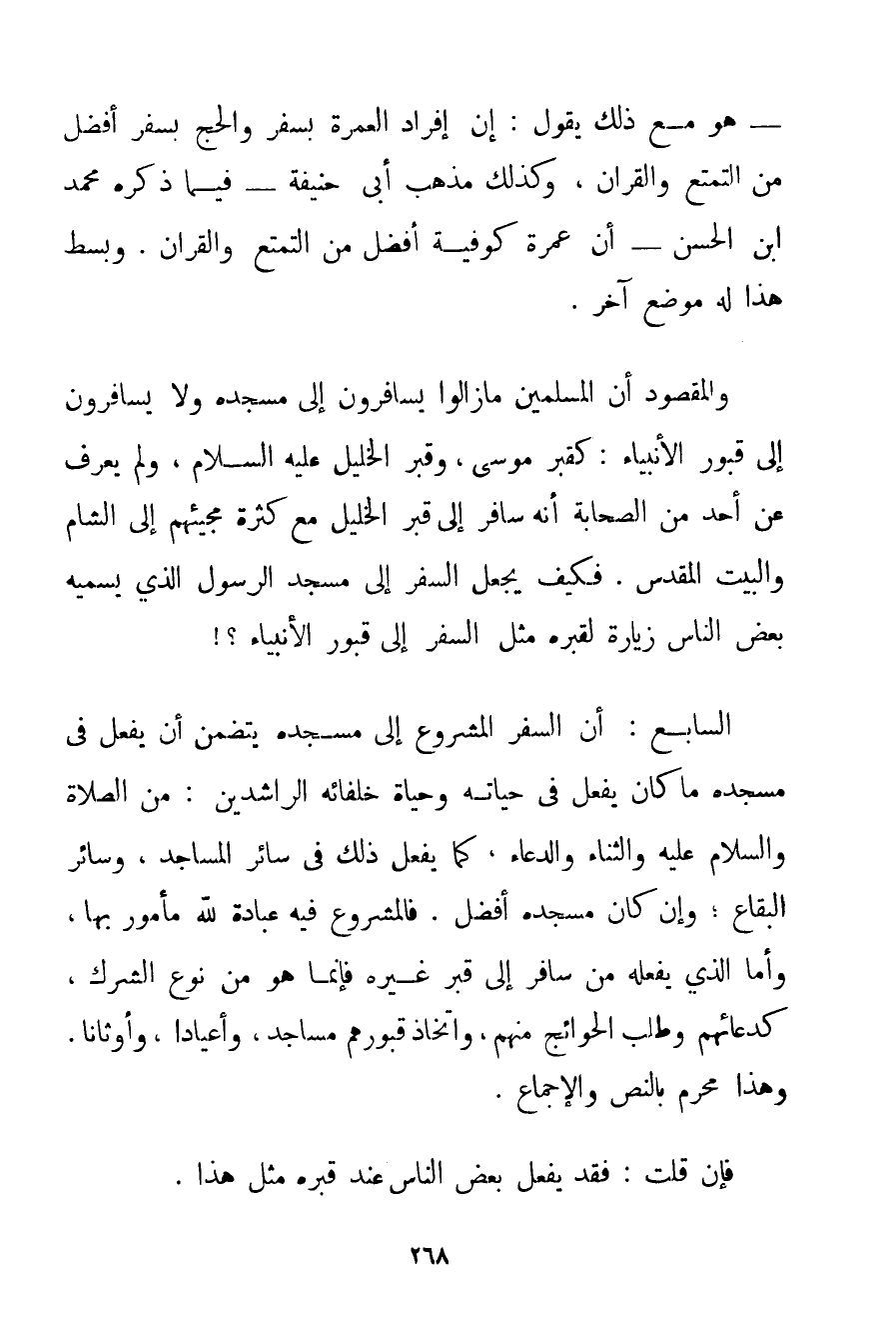 هُوَ مَعَ ذَلِكَ يَقُولُ: إنَّ إفْرَادَ الْعُمْرَةِ بِسَفَرِ وَالْحَجِّ بِسَفَرِ أَفْضَلُ مِنْ التَّمَتُّعِ وَالْقِرَانِ وَكَذَلِكَ مَذْهَبُ أَبِي حَنِيفَةَ - فِيمَا ذَكَرَهُ مُحَمَّدُ بْنُ الْحَسَنِ - أَنَّ عُمْرَةً كُوفِيَّةً أَفْضَلُ مِنْ التَّمَتُّعِ وَالْقِرَانِ. وَبَسْطُ هَذَا لَهُ مَوْضِعٌ آخَرُ. وَالْمَقْصُودُ أَنَّ الْمُسْلِمِينَ مَا زَالُوا يُسَافِرُونَ إلَى مَسْجِدِهِ وَلَا يُسَافِرُونَ إلَى قُبُورِ الْأَنْبِيَاءِ: كَقَبْرِ مُوسَى وَقَبْرِ الْخَلِيلِ عَلَيْهِ السَّلَامُ وَلَمْ يُعْرَفْ عَنْ أَحَدٍ مِنْ الصَّحَابَة أَنَّهُ سَافَرَ إلَى قَبْرِ الْخَلِيلِ مَعَ كَثْرَةِ مَجِيئِهِمْ إلَى الشَّامِ وَالْبَيْتِ الْمُقَدَّسِ. فَكَيْفَ يُجْعَلُ السَّفَرُ إلَى مَسْجِدِ الرَّسُولِ الَّذِي يُسَمِّيهِ بَعْضُ النَّاسِ زِيَارَةً لِقَبْرِهِ مِثْلَ السَّفَرِ إلَى قُبُورِ الْأَنْبِيَاءِ السَّابِعُ: أَنَّ السَّفَرَ الْمَشْرُوعَ إلَى مَسْجِدِهِ يَتَضَمَّنُ أَنْ يُفْعَلَ فِي مَسْجِدِهِ مَا كَانَ يُفْعَلُ فِي حَيَاتِهِ وَحَيَاةِ خُلَفَائِهِ الرَّاشِدِينَ: مِنْ الصَّلَاةِ وَالسَّلَامِ عَلَيْهِ وَالثَّنَاءِ وَالدُّعَاءِ كَمَا يُفْعَلُ ذَلِكَ فِي سَائِرِ الْمَسَاجِدِ وَسَائِرِ الْبِقَاعِ. وَإِنْ كَانَ مَسْجِدُهُ أَفْضَلَ. فَالْمَشْرُوعُ فِيهِ عِبَادَةٌ لِلَّهِ مَأْمُورٌ بِهَا وَأَمَّا الَّذِي يَفْعَلُهُ مَنْ سَافَرَ إلَى قَبْرِ غَيْرِهِ فَإِنَّمَا هُوَ مِنْ نَوْعِ الشِّرْكِ كَدُعَائِهِمْ وَطَلَبِ الْحَوَائِجِ مِنْهُمْ وَاِتِّخَاذِ قُبُورِهِمْ مَسَاجِدَ وَأَعْيَادًا وَأَوْثَانًا. وَهَذَا مُحَرَّمٌ بِالنَّصِّ وَالْإِجْمَاعِ. فَإِنْ قُلْت: فَقَدْ يَفْعَلُ بَعْضُ النَّاسِ عِنْدَ قَبْرِهِ مِثْلَ هَذَا.