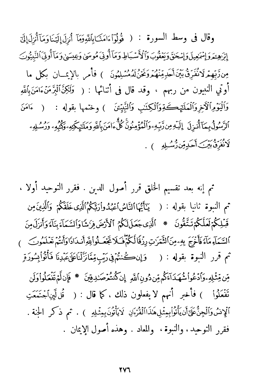 وَقَالَ فِي وَسَطِ السُّورَةِ: {قُولُوا آمَنَّا بِاللَّهِ وَمَا أُنْزِلَ إلَيْنَا وَمَا أُنْزِلَ إلَى إبْرَاهِيمَ وَإِسْمَاعِيلَ وَإِسْحَاقَ وَيَعْقُوبَ وَالْأَسْبَاطِ وَمَا أُوتِيَ مُوسَى وَعِيسَى وَمَا أُوتِيَ النَّبِيُّونَ مِنْ رَبِّهِمْ لَا نُفَرِّقُ بَيْنَ أَحَدٍ مِنْهُمْ وَنَحْنُ لَهُ مُسْلِمُونَ} فَأَمَرَ بِالْإِيمَانِ بِكُلِّ مَا أُوتِيَ النَّبِيُّونَ مِنْ رَبِّهِمْ وَقَدْ قَالَ فِي أَثْنَائِهَا: {وَلَكِنَّ الْبِرَّ مَنْ آمَنَ بِاللَّهِ وَالْيَوْمِ الْآخِرِ وَالْمَلَائِكَةِ وَالْكِتَابِ وَالنَّبِيِّينَ} وَخَتَمَهَا بِقَوْلِهِ: {آمَنَ الرَّسُولُ بِمَا أُنْزِلَ إلَيْهِ مِنْ رَبِّهِ وَالْمُؤْمِنُونَ كُلٌّ آمَنَ بِاللَّهِ وَمَلَائِكَتِهِ وَكُتُبِهِ وَرُسُلِهِ لَا نُفَرِّقُ بَيْنَ أَحَدٍ مِنْ رُسُلِهِ} . ثُمَّ إنَّهُ بَعْدَ تَقْسِيمِ الْخَلْقِ قَرَّرَ أُصُولَ الدِّينِ. فَقَرَّرَ التَّوْحِيدَ أَوَّلًا ثُمَّ النُّبُوَّةَ ثَانِيًا بِقَوْلِهِ: {يَا أَيُّهَا النَّاسُ اعْبُدُوا رَبَّكُمُ الَّذِي خَلَقَكُمْ وَالَّذِينَ مِنْ قَبْلِكُمْ لَعَلَّكُمْ تَتَّقُونَ} {الَّذِي جَعَلَ لَكُمُ الْأَرْضَ فِرَاشًا وَالسَّمَاءَ بِنَاءً وَأَنْزَلَ مِنَ السَّمَاءِ مَاءً فَأَخْرَجَ بِهِ مِنَ الثَّمَرَاتِ رِزْقًا لَكُمْ فَلَا تَجْعَلُوا لِلَّهِ أَنْدَادًا وَأَنْتُمْ تَعْلَمُونَ} ثُمَّ قَرَّرَ النُّبُوَّةَ بِقَوْلِهِ: {وَإِنْ كُنْتُمْ فِي رَيْبٍ مِمَّا نَزَّلْنَا عَلَى عَبْدِنَا فَأْتُوا بِسُورَةٍ مِنْ مِثْلِهِ وَادْعُوا شُهَدَاءَكُمْ مِنْ دُونِ اللَّهِ إنْ كُنْتُمْ صَادِقِينَ} {فَإِنْ لَمْ تَفْعَلُوا وَلَنْ تَفْعَلُوا} فَأَخْبَرَ أَنَّهُمْ لَا يَفْعَلُونَ ذَلِكَ كَمَا قَالَ: {قُلْ لَئِنِ اجْتَمَعَتِ الْإِنْسُ وَالْجِنُّ عَلَى أَنْ يَأْتُوا بِمِثْلِ هَذَا الْقُرْآنِ لَا يَأْتُونَ بِمِثْلِهِ} . ثُمَّ ذَكَرَ الْجَنَّةَ. فَقَرَّرَ التَّوْحِيدَ وَالنُّبُوَّةَ وَالْمَعَادَ. وَهَذِهِ أُصُولُ الْإِيمَانِ.
