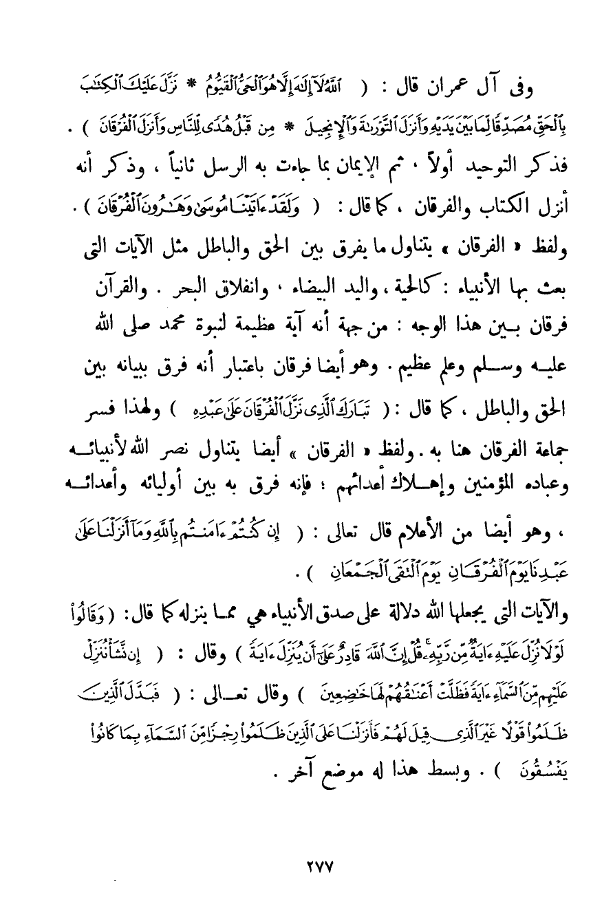 وَفِي آلِ عِمْرَانَ قَالَ: {اللَّهُ لَا إلَهَ إلَّا هُوَ الْحَيُّ الْقَيُّومُ} {نَزَّلَ عَلَيْكَ الْكِتَابَ بِالْحَقِّ مُصَدِّقًا لِمَا بَيْنَ يَدَيْهِ وَأَنْزَلَ التَّوْرَاةَ وَالْإِنْجِيلَ} {مِنْ قَبْلُ هُدًى لِلنَّاسِ وَأَنْزَلَ الْفُرْقَانَ} . فَذَكَرَ التَّوْحِيدَ أَوَّلًا ثُمَّ الْإِيمَانَ بِمَا جَاءَتْ بِهِ الرُّسُلُ ثَانِيًا وَذَكَرَ أَنَّهُ أَنْزَلَ الْكِتَابَ وَالْفُرْقَانَ كَمَا قَالَ: {وَإِذْ آَتَيْنَا مُوسَى الْكِتَابَ وَالْفُرْقَانَ} . وَلَفْظُ " الْفُرْقَانَ " يَتَنَاوَلُ مَا يُفَرِّقُ بَيْنَ الْحَقِّ وَالْبَاطِلِ مِثْلَ الْآيَاتِ الَّتِي بُعِثَ بِهَا الْأَنْبِيَاءُ: كَالْحَيَّةِ وَالْيَدِ الْبَيْضَاءِ وَانْفِلَاقِ الْبَحْرِ. وَالْقُرْآنُ فُرْقَانٌ بَيْنَ هَذَا الْوَجْهِ: مِنْ جِهَةِ أَنَّهُ آيَةٌ عَظِيمَةٌ لِنُبُوَّةِ مُحَمَّدٍ صَلَّى اللَّهُ عَلَيْهِ وَسَلَّمَ وَعِلْمٌ عَظِيمٌ. وَهُوَ أَيْضًا فُرْقَانٌ بِاعْتِبَارِ أَنَّهُ فَرَّقَ بِبَيَانِهِ بَيْنَ الْحَقِّ وَالْبَاطِلِ كَمَا قَالَ: {تَبَارَكَ الَّذِي نَزَّلَ الْفُرْقَانَ عَلَى عَبْدِهِ} وَلِهَذَا فَسَّرَ جَمَاعَةٌ الْفُرْقَانَ هُنَا بِهِ. وَلَفْظُ " الْفُرْقَانِ " أَيْضًا يَتَنَاوَلُ نَصْرَ اللَّهِ لِأَنْبِيَائِهِ وَعِبَادِهِ الْمُؤْمِنِينَ وَإِهْلَاكَ أَعْدَائِهِمْ؛ فَإِنَّهُ فَرَّقَ بِهِ بَيْنَ أَوْلِيَائِهِ وَأَعْدَائِهِ وَهُوَ أَيْضًا مِنْ الْأَعْلَامِ قَالَ تَعَالَى: {إنْ كُنْتُمْ آمَنْتُمْ بِاللَّهِ وَمَا أَنْزَلْنَا عَلَى عَبْدِنَا يَوْمَ الْفُرْقَانِ يَوْمَ الْتَقَى الْجَمْعَانِ} . وَالْآيَاتُ الَّتِي يَجْعَلُهَا اللَّهُ دِلَالَةً عَلَى صِدْقِ الْأَنْبِيَاءِ هِيَ مِمَّا يُنَزِّلُهُ كَمَا قَالَ: {وَقَالُوا لَوْلَا نُزِّلَ عَلَيْهِ آيَةٌ مِنْ رَبِّهِ قُلْ إنَّ اللَّهَ قَادِرٌ عَلَى أَنْ يُنَزِّلَ آيَةً} وَقَالَ: {إنْ نَشَأْ نُنَزِّلْ عَلَيْهِمْ مِنَ السَّمَاءِ آيَةً فَظَلَّتْ أَعْنَاقُهُمْ لَهَا خَاضِعِينَ} وَقَالَ تَعَالَى: {فَبَدَّلَ الَّذِينَ ظَلَمُوا قَوْلًا غَيْرَ الَّذِي قِيلَ لَهُمْ فَأَنْزَلْنَا عَلَى الَّذِينَ ظَلَمُوا رِجْزًا مِنَ السَّمَاءِ بِمَا كَانُوا يَفْسُقُونَ} . وَبَسْطُ هَذَا لَهُ مَوْضِعٌ آخَرُ.