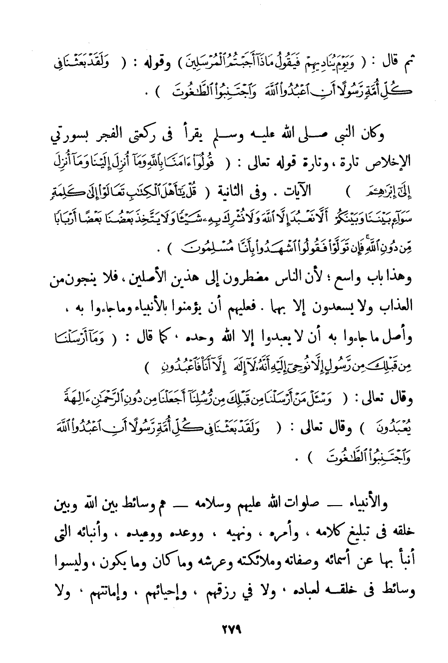 {وَيَوْمَ يُنَادِيهِمْ فَيَقُولُ مَاذَا أَجَبْتُمُ الْمُرْسَلِينَ} وَقَوْلُهُ: {وَلَقَدْ بَعَثْنَا فِي كُلِّ أُمَّةٍ رَسُولًا أَنِ اُعْبُدُوا اللَّهَ وَاجْتَنِبُوا الطَّاغُوتَ} . وَكَانَ النَّبِيُّ صَلَّى اللَّهُ عَلَيْهِ وَسَلَّمَ يَقْرَأُ فِي رَكْعَتَيْ الْفَجْرِ بِسُورَتَيْ الْإِخْلَاصِ تَارَةً وَتَارَةً قَوْله تَعَالَى {قُولُوا آمَنَّا بِاللَّهِ وَمَا أُنْزِلَ إلَيْنَا وَمَا أُنْزِلَ إلَى إبْرَاهِيمَ} الْآيَاتُ. وَفِي الثَّانِيَةِ {قُلْ يَا أَهْلَ الْكِتَابِ تَعَالَوْا إلَى كَلِمَةٍ سَوَاءٍ بَيْنَنَا وَبَيْنَكُمْ أَلَّا نَعْبُدَ إلَّا اللَّهَ وَلَا نُشْرِكَ بِهِ شَيْئًا وَلَا يَتَّخِذَ بَعْضُنَا بَعْضًا أَرْبَابًا مِنْ دُونِ اللَّهِ فَإِنْ تَوَلَّوْا فَقُولُوا اشْهَدُوا بِأَنَّا مُسْلِمُونَ} . وَهَذَا بَابٌ وَاسِعٌ؛ لِأَنَّ النَّاسَ مُضْطَرُّونَ إلَى هَذَيْنَ الْأَصْلَيْنِ فَلَا يَنْجُونَ مِنْ الْعَذَابِ وَلَا يَسْعَدُونَ إلَّا بِهِمَا. فَعَلَيْهِمْ أَنْ يُؤْمِنُوا بِالْأَنْبِيَاءِ وَمَا جَاءُوا بِهِ وَأَصْلُ مَا جَاءُوا بِهِ أَنْ لَا يَعْبُدُوا إلَّا اللَّهَ وَحْدَهُ كَمَا قَالَ: {وَمَا أَرْسَلْنَا مِنْ قَبْلِكَ مِنْ رَسُولٍ إلَّا نُوحِي إلَيْهِ أَنَّهُ لَا إلَهَ إلَّا أَنَا فَاعْبُدُونِ} وَقَالَ تَعَالَى: {وَاسْأَلْ مَنْ أَرْسَلْنَا مِنْ قَبْلِكَ مِنْ رُسُلِنَا أَجَعَلْنَا مِنْ دُونِ الرَّحْمَنِ آلِهَةً يُعْبَدُونَ} وَقَالَ تَعَالَى: {وَلَقَدْ بَعَثْنَا فِي كُلِّ أُمَّةٍ رَسُولًا أَنِ اُعْبُدُوا اللَّهَ وَاجْتَنِبُوا الطَّاغُوتَ} . وَالْأَنْبِيَاءُ - صَلَوَاتُ اللَّهِ عَلَيْهِمْ وَسَلَامُهُ - هُمْ وَسَائِطُ بَيْنَ اللَّهِ وَبَيْنَ خَلْقِهِ فِي تَبْلِيغِ كَلَامِهِ وَأَمْرِهِ وَنَهْيِهِ وَوَعْدِهِ وَوَعِيدِهِ وَأَنْبَائِهِ الَّتِي أَنْبَأَ بِهَا عَنْ أَسْمَائِهِ وَصِفَاتِهِ وَمَلَائِكَتِهِ وَعَرْشِهِ وَمَا كَانَ وَمَا يَكُونُ وَلَيْسُوا وَسَائِطَ فِي خَلْقِهِ لِعِبَادِهِ وَلَا فِي رِزْقِهِمْ وَإِحْيَائِهِمْ وَإِمَاتَتِهِمْ وَلَا