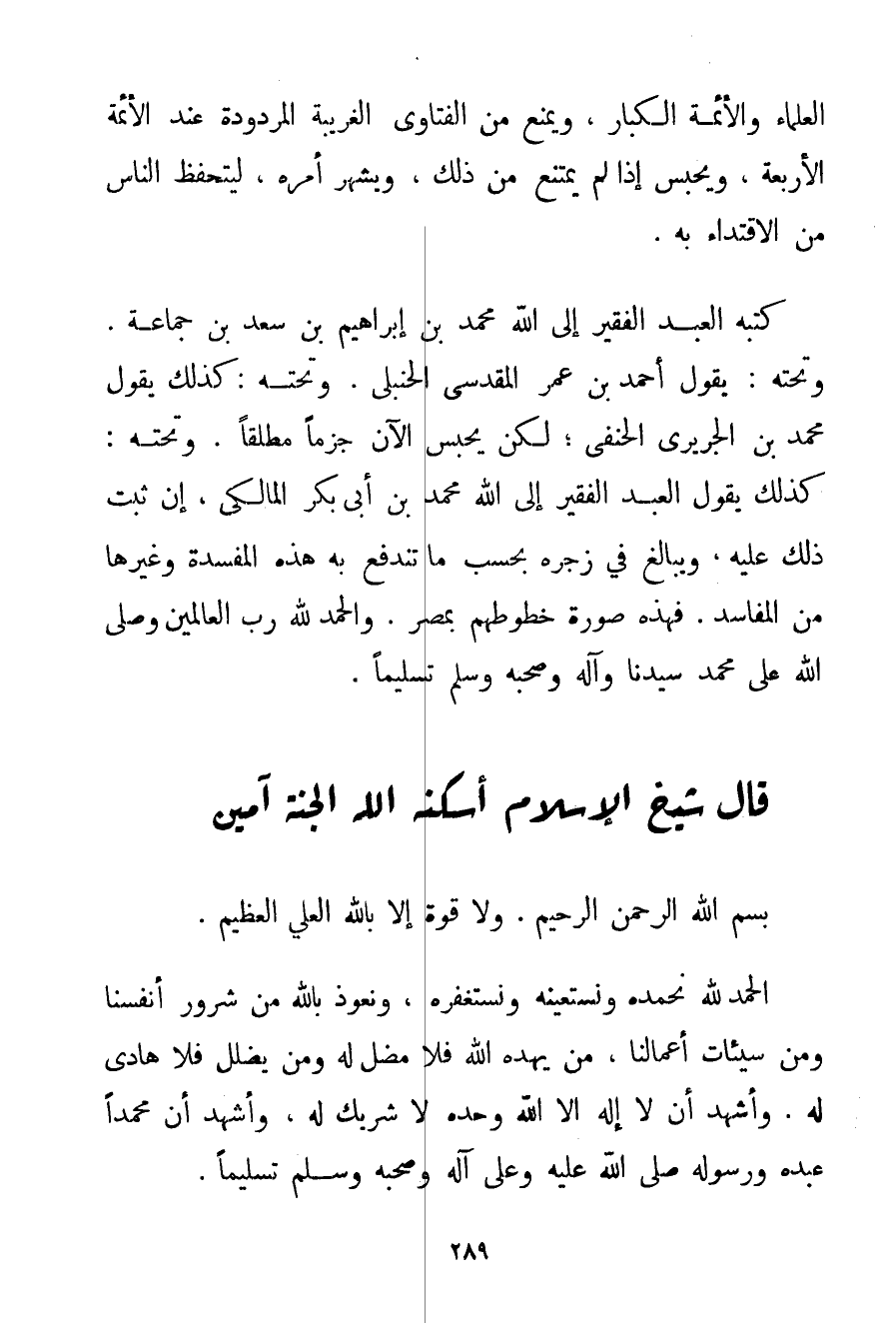 الْعُلَمَاء وَالْأَئِمَّةِ الْكِبَارِ وَيُمْنَعَ مِنْ الْفَتَاوَى الْغَرِيبَةِ الْمَرْدُودَةِ عِنْدَ الْأَئِمَّةِ الْأَرْبَعَةِ وَيُحْبَسَ إذَا لَمْ يَمْتَنِعْ مِنْ ذَلِكَ وَيُشْهَرَ أَمْرُهُ لِيَتَحَفَّظَ النَّاسُ مِنْ الِاقْتِدَاءِ بِهِ. كَتَبَهُ الْعَبْدُ الْفَقِيرُ إلَى اللَّهِ مُحَمَّدُ بْنُ إبْرَاهِيمَ بْنِ سَعْدِ بْنِ جَمَاعَةَ. وَتَحْتَهُ: يَقُولُ أَحْمَد بْنُ عُمَرَ المقدسي الْحَنْبَلِيُّ. وَتَحْتَهُ: كَذَلِكَ يَقُولُ مُحَمَّدُ بْنُ الجريري الْحَنَفِيِّ. لَكِنْ يُحْبَسُ الْآنَ جَزْمًا مُطْلَقًا. وَتَحْتَهُ: كَذَلِكَ يَقُولُ الْعَبْدُ الْفَقِيرُ إلَى اللَّهِ مُحَمَّدُ بْنُ أَبِي بَكْرٍ الْمَالِكِيُّ إنْ ثَبَتَ ذَلِكَ عَلَيْهِ وَيُبَالَغُ فِي زَجْرِهِ بِحَسَبِ مَا تَنْدَفِعُ بِهِ هَذِهِ الْمَفْسَدَةُ وَغَيْرُهَا مِنْ الْمَفَاسِدِ. فَهَذِهِ صُورَةُ خُطُوطِهِمْ بِمِصْرِ. وَالْحَمْدُ لِلَّهِ رَبِّ الْعَالَمِينَ وَصَلَّى اللَّهُ عَلَى مُحَمَّدٍ سَيِّدِنَا وَآلِهِ وَصَحْبِهِ وَسَلَّمَ تَسْلِيمًا.