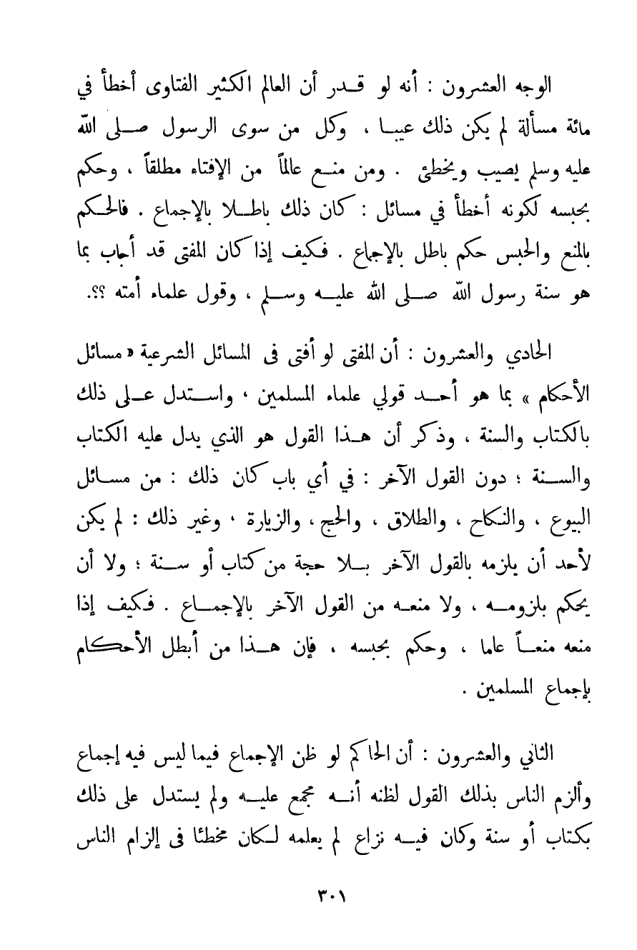الْوَجْهُ الْعِشْرُونَ: أَنَّهُ لَوْ قُدِّرَ أَنَّ الْعَالِمَ الْكَثِيرَ الْفَتَاوَى أَخْطَأَ فِي مِائَةِ مَسْأَلَةٍ لَمْ يَكُنْ ذَلِكَ عَيْبًا وَكُلُّ مَنْ سِوَى الرَّسُولِ صَلَّى اللَّهُ عَلَيْهِ وَسَلَّمَ يُصِيبُ وَيُخْطِئُ. وَمَنْ مَنَعَ عَالِمًا مِنْ الْإِفْتَاءِ مُطْلَقًا وَحَكَمَ بِحَبْسِهِ لِكَوْنِهِ أَخْطَأَ فِي مَسَائِلَ: كَانَ ذَلِكَ بَاطِلًا بِالْإِجْمَاعِ. فَالْحُكْمُ بِالْمَنْعِ وَالْحَبْسِ حُكْمٌ بَاطِلٌ بِالْإِجْمَاعِ. فَكَيْفَ إذَا كَانَ الْمُفْتِي قَدْ أَجَابَ بِمَا هُوَ سُنَّةُ رَسُولِ اللَّهِ صَلَّى اللَّهُ عَلَيْهِ وَسَلَّمَ وَقَوْلُ عُلَمَاءِ أُمَّتِهِ؟ .