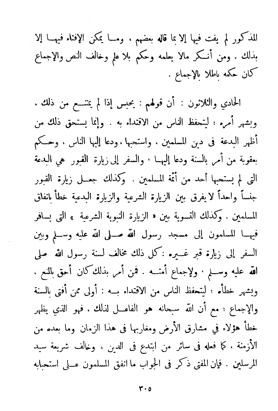 الْحَادِي وَالثَّلَاثُونَ: أَنَّ قَوْلَهُمْ: يُحْبَسُ إذَا لَمْ يَمْتَنِعْ مِنْ ذَلِكَ وَيُشْهَرُ أَمْرُهُ؛ لِيَتَحَفَّظَ النَّاسُ مِنْ الِاقْتِدَاءِ بِهِ. وَإِنَّمَا يَسْتَحِقُّ ذَلِكَ مَنْ أَظْهَرَ الْبِدْعَةَ فِي دِينِ الْمُسْلِمِينَ وَاسْتَحَبَّهَا وَدَعَا إلَيْهَا النَّاسَ وَحَكَمَ بِعُقُوبَةِ مَنْ أَمَرَ بِالسُّنَّةِ وَدَعَا إلَيْهَا وَالسَّفَرُ إلَى زِيَارَةِ الْقُبُورِ هِيَ الْبِدْعَةُ الَّتِي لَمْ يَسْتَحِبَّهَا أَحَدٌ مِنْ أَئِمَّةِ الْمُسْلِمِينَ. وَكَذَلِكَ جَعْلُ زِيَارَةِ الْقُبُورِ جِنْسًا وَاحِدًا لَا يُفَرَّقُ بَيْنَ الزِّيَارَةِ الشَّرْعِيَّةِ وَالزِّيَارَةِ الْبِدْعِيَّةِ خَطَأٌ بِاتِّفَاقِ الْمُسْلِمِينَ. وَكَذَلِكَ التَّسْوِيَةُ بَيْنَ " الزِّيَارَةِ النَّبَوِيَّةِ الشَّرْعِيَّةِ " الَّتِي يُسَافِرُ فِيهَا الْمُسْلِمُونَ إلَى مَسْجِدِ رَسُولِ اللَّهِ صَلَّى اللَّهُ عَلَيْهِ وَسَلَّمَ وَبَيْنَ السَّفَرِ إلَى زِيَارَةِ قَبْرِ غَيْرِهِ: كُلُّ ذَلِكَ مُخَالِفٌ لِسُنَّةِ رَسُولِ اللَّهِ صَلَّى اللَّهُ عَلَيْهِ وَسَلَّمَ وَلِإِجْمَاعِ أُمَّتِهِ. فَمَنْ أَمَرَ بِذَلِكَ كَانَ أَحَقَّ بِالْمَنْعِ وَيُشْهَرُ خَطَؤُهُ؛ لِيَتَحَفَّظَ النَّاسُ مِنْ الِاقْتِدَاءِ بِهِ: أَوْلَى مِمَّنْ أَفْتَى بِالسُّنَّةِ وَالْإِجْمَاعِ؛ مَعَ أَنَّ اللَّهَ سُبْحَانَهُ هُوَ الْفَاعِلُ لِذَلِكَ فَهُوَ الَّذِي يُظْهِرُ خَطَأَ هَؤُلَاءِ فِي مَشَارِقِ الْأَرْضِ وَمَغَارِبهَا فِي هَذَا الزَّمَانِ وَمَا بَعْدَهُ مِنْ الْأَزْمِنَةِ كَمَا فَعَلَهُ فِي سَائِرِ مَنْ ابْتَدَعَ فِي الدِّينِ وَخَالَفَ شَرِيعَةَ سَيِّدِ الْمُرْسَلِينَ. فَإِنَّ الْمُفْتِيَ ذَكَرَ فِي الْجَوَابِ مَا اتَّفَقَ الْمُسْلِمُونَ عَلَى اسْتِحْبَابِهِ