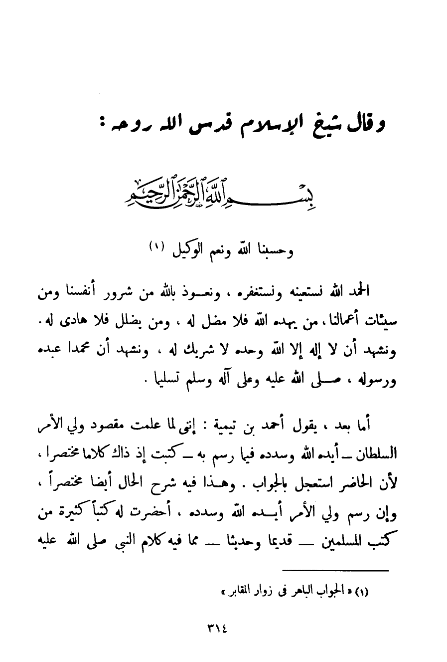 أَمَّا بَعْدُ يَقُولُ أَحْمَد ابْنُ تَيْمِيَّة: إنَّنِي لَمَّا عَلِمْت مَقْصُودَ وَلِيِّ الْأَمْرِ السُّلْطَانِ - أَيَّدَهُ اللَّهُ وَسَدَّدَهُ فِيمَا رَسَمَ بِهِ - كَتَبْت إذْ ذَاكَ كَلَامًا مُخْتَصَرًا لِأَنَّ الْحَاضِرَ اسْتَعْجَلَ بِالْجَوَابِ وَهَذَا فِيهِ شَرْحُ الْحَالِ أَيْضًا مُخْتَصَرًا وَإِنَّ رَسْمَ وَلِيِّ الْأَمْرِ أَيَّدَهُ اللَّهُ وَسَدَّدَهُ أَحْضَرْت لَهُ كُتُبًا كَثِيرَةً مِنْ كُتُبِ الْمُسْلِمِينَ - قَدِيمًا وَحَدِيثًا - مِمَّا فِيهِ كَلَامُ النَّبِيِّ صَلَّى اللَّهُ عَلَيْهِ وَسَلَّمَ