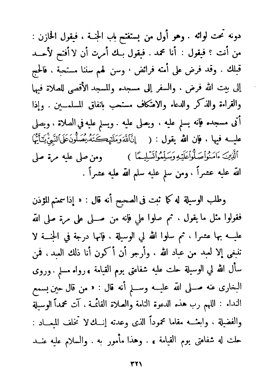 دُونَهُ تَحْتَ لِوَائِهِ. وَهُوَ أَوَّلُ مَنْ يَسْتَفْتِحُ بَابَ الْجَنَّةِ {فَيَقُولُ الْخَازِنُ: مَنْ أَنْتَ؟ فَيَقُولُ: أَنَا مُحَمَّدٌ. فَيَقُولُ بِك أُمِرْت أَنْ لَا أَفْتَحَ لِأَحَدِ قَبْلَك} . وَقَدْ فَرَضَ عَلَى أُمَّتِهِ فَرَائِضَ وَسَنَّ لَهُمْ سُنَنًا مُسْتَحَبَّةً فَالْحَجُّ إلَى بَيْتِ اللَّهِ فَرْضٌ وَالسَّفَرُ إلَى مَسْجِدِهِ وَالْمَسْجِدِ الْأَقْصَى لِلصَّلَاةِ فِيهِمَا وَالْقِرَاءَةِ وَالذِّكْرِ وَالدُّعَاءِ وَالِاعْتِكَافِ مُسْتَحَبٌّ بِاتِّفَاقِ الْمُسْلِمِينَ. وَإِذَا أُتِيَ مَسْجِدُهُ فَإِنَّهُ يُسَلَّمُ عَلَيْهِ وَيُصَلَّى عَلَيْهِ. وَيُسَلَّمُ عَلَيْهِ فِي الصَّلَاةِ وَيُصَلَّى عَلَيْهِ فِيهَا فَإِنَّ اللَّهَ يَقُولُ: {إنَّ اللَّهَ وَمَلَائِكَتَهُ يُصَلُّونَ عَلَى النَّبِيِّ يَا أَيُّهَا الَّذِينَ آمَنُوا صَلُّوا عَلَيْهِ وَسَلِّمُوا تَسْلِيمًا} وَمَنْ صَلَّى عَلَيْهِ مَرَّةً صَلَّى اللَّهُ عَلَيْهِ عَشْرًا وَمَنْ سَلَّمَ عَلَيْهِ سَلَّمَ اللَّهُ عَلَيْهِ عَشْرًا. وَطَلَبَ الْوَسِيلَةَ لَهُ كَمَا ثَبَتَ فِي الصَّحِيحِ أَنَّهُ قَالَ: {إذَا سَمِعْتُمْ الْمُؤَذِّنَ فَقُولُوا مِثْلَ مَا يَقُولُ ثُمَّ صَلُّوا عَلَيَّ فَإِنَّهُ مَنْ صَلَّى عَلَيَّ مَرَّةً صَلَّى اللَّهُ عَلَيْهِ بِهَا عَشْرًا ثُمَّ سَلُوا اللَّهَ لِي الْوَسِيلَةَ فَإِنَّهَا دَرَجَةٌ فِي الْجَنَّةِ لَا تَنْبَغِي إلَّا لِعَبْدِ مِنْ عِبَادِ اللَّهِ وَأَرْجُو أَنْ أَكُونَ أَنَا ذَلِكَ الْعَبْدَ فَمَنْ سَأَلَ اللَّهَ لِي الْوَسِيلَةَ حَلَّتْ عَلَيْهِ شَفَاعَتِي يَوْمَ الْقِيَامَةِ} رَوَاهُ مُسْلِمٌ. وَرَوَى الْبُخَارِيُّ عَنْهُ صَلَّى اللَّهُ عَلَيْهِ وَسَلَّمَ أَنَّهُ قَالَ: {مَنْ قَالَ حِينَ يَسْمَعُ النِّدَاءَ: اللَّهُمَّ رَبَّ هَذِهِ الدَّعْوَةِ التَّامَّةِ وَالصَّلَاةِ الْقَائِمَةِ آتِ مُحَمَّدًا الْوَسِيلَةَ وَالْفَضِيلَةَ وَابْعَثْهُ مَقَامًا مَحْمُودًا الَّذِي وَعَدْته إنَّك لَا تُخْلِفُ الْمِيعَادَ: حَلَّتْ لَهُ شَفَاعَتِي يَوْمَ الْقِيَامَةِ} . وَهَذَا مَأْمُورٌ بِهِ. وَالسَّلَامُ عَلَيْهِ عِنْدَ
