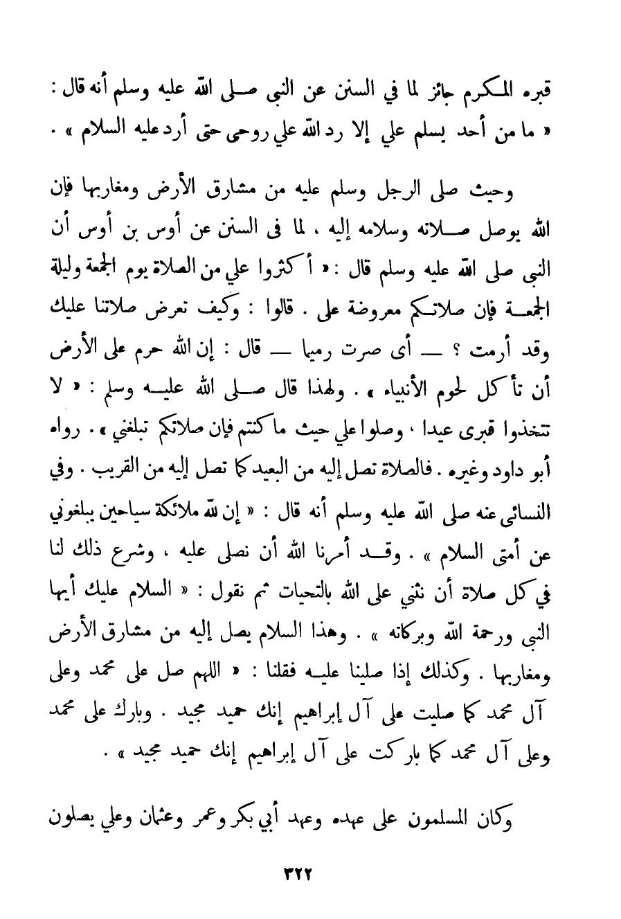 قَبْرِهِ الْمُكَرَّمِ جَائِزٌ لِمَا فِي السُّنَنِ عَنْ النَّبِيِّ صَلَّى اللَّهُ عَلَيْهِ وَسَلَّمَ أَنَّهُ قَالَ: {مَا مِنْ أَحَدٍ يُسَلِّمُ عَلَيَّ إلَّا رَدَّ اللَّهُ عَلَيَّ رُوحِي حَتَّى أَرُدَّ عَلَيْهِ السَّلَامَ} . وَحَيْثُ صَلَّى الرَّجُلُ وَسَلَّمَ عَلَيْهِ مِنْ مَشَارِقِ الْأَرْضِ وَمَغَارِبِهَا فَإِنَّ اللَّهَ يُوصِلُ صَلَاتَهُ وَسَلَامَهُ إلَيْهِ لِمَا فِي السُّنَنِ عَنْ أَوْسِ بْنِ أَوْسٍ أَنَّ النَّبِيَّ صَلَّى اللَّهُ عَلَيْهِ وَسَلَّمَ قَالَ: {أَكْثِرُوا عَلَيَّ مِنْ الصَّلَاةِ يَوْمَ الْجُمْعَةِ وَلَيْلَةَ الْجُمْعَةِ فَإِنَّ صَلَاتَكُمْ مَعْرُوضَةٌ عَلَيَّ. قَالُوا: كَيْفَ تُعْرَضُ صَلَاتُنَا عَلَيْك وَقَدْ أَرَمْت؟ - أَيْ صِرْت رَمِيمًا - قَالَ: إنَّ اللَّهَ حَرَّمَ عَلَى الْأَرْضِ أَنْ تَأْكُلَ لُحُومَ الْأَنْبِيَاءِ} . وَلِهَذَا قَالَ صَلَّى اللَّهُ عَلَيْهِ وَسَلَّمَ {لَا تَتَّخِذُوا قَبْرِي عِيدًا وَصَلُّوا عَلَيَّ حَيْثُمَا كُنْتُمْ فَإِنَّ صَلَاتَكُمْ تَبْلُغُنِي} . رَوَاهُ أَبُو دَاوُد وَغَيْرُهُ. فَالصَّلَاةُ تَصِلُ إلَيْهِ مِنْ الْبَعِيدِ كَمَا تَصِلُ إلَيْهِ مِنْ الْقَرِيبِ. وَفِي النَّسَائِي عَنْهُ صَلَّى اللَّهُ عَلَيْهِ وَسَلَّمَ أَنَّهُ قَالَ: {إنَّ لِلَّهِ مَلَائِكَةً سَيَّاحِينَ يُبَلِّغُونِي عَنْ أُمَّتِي السَّلَامَ} . وَقَدْ أَمَرَنَا اللَّهُ أَنْ نُصَلِّيَ عَلَيْهِ وَشَرَعَ ذَلِكَ لَنَا فِي كُلِّ صَلَاةٍ أَنْ نُثْنِيَ عَلَى اللَّهِ بِالتَّحِيَّاتِ ثُمَّ نَقُولَ: {السَّلَامُ عَلَيْك أَيُّهَا النَّبِيُّ وَرَحْمَةُ اللَّهِ وَبَرَكَاتُهُ} . وَهَذَا السَّلَامُ يَصِلُ إلَيْهِ مِنْ مَشَارِقِ الْأَرْضِ وَمَغَارِبِهَا. وَكَذَلِكَ إذَا صَلَّيْنَا عَلَيْهِ فَقُلْنَا: {اللَّهُمَّ صَلِّ عَلَى مُحَمَّدٍ وَعَلَى آلِ مُحَمَّدٍ كَمَا صَلَّيْت عَلَى آلِ إبْرَاهِيمَ إنَّك حَمِيدٌ مَجِيدٌ. وَبَارِكْ عَلَى مُحَمَّدٍ وَعَلَى آلِ مُحَمَّدٍ كَمَا بَارَكْت عَلَى آلِ إبْرَاهِيمَ إنَّك حَمِيدٌ مَجِيدٌ} . وَكَانَ الْمُسْلِمُونَ عَلَى عَهْدِهِ وَعَهْدِ أَبِي بَكْرٍ وَعُمَرَ وَعُثْمَانَ وَعَلِيٍّ يُصَلُّونَ