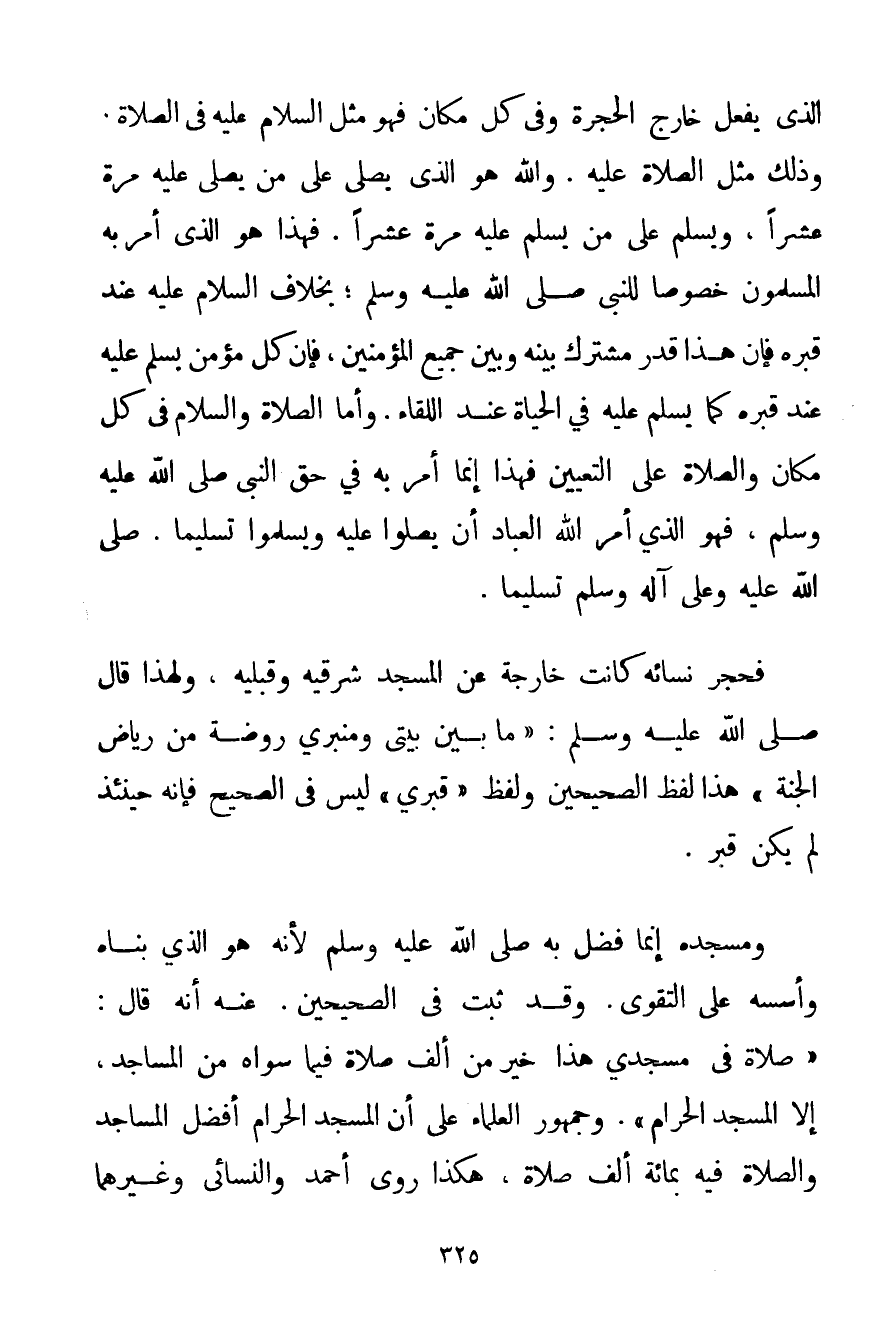الَّذِي يُفْعَلُ خَارِجَ الْحُجْرَةِ وَفِي كُلِّ مَكَانٍ فَهُوَ مِثْلُ السَّلَامِ عَلَيْهِ فِي الصَّلَاةِ وَذَلِكَ مِثْلُ الصَّلَاةِ عَلَيْهِ. وَاَللَّهُ هُوَ الَّذِي يُصَلِّي عَلَى مَنْ يُصَلِّي عَلَيْهِ مَرَّةً عَشْرًا وَيُسَلِّمُ عَلَى مَنْ يُسَلِّمُ عَلَيْهِ مَرَّةً عَشْرًا. فَهَذَا هُوَ الَّذِي أَمَرَ بِهِ الْمُسْلِمُونَ خُصُوصًا لِلنَّبِيِّ صَلَّى اللَّهُ عَلَيْهِ وَسَلَّمَ بِخِلَافِ السَّلَامِ عَلَيْهِ عِنْدَ قَبْرِهِ فَإِنَّ هَذَا قَدْرٌ مُشْتَرَكٌ بَيْنَهُ وَبَيْنَ جَمِيعِ الْمُؤْمِنِينَ فَإِنَّ كُلَّ مُؤْمِنٍ يُسَلِّمُ عَلَيْهِ عِنْدَ قَبْرِهِ كَمَا يُسَلِّمُ عَلَيْهِ فِي الْحَيَاةِ عِنْدَ اللِّقَاءِ. وَأَمَّا الصَّلَاةُ وَالسَّلَامُ فِي كُلِّ مَكَانٍ وَالصَّلَاةُ عَلَى التَّعْيِينِ فَهَذَا إنَّمَا أَمَرَ بِهِ فِي حَقِّ النَّبِيِّ صَلَّى اللَّهُ عَلَيْهِ وَسَلَّمَ فَهُوَ الَّذِي أَمَرَ الْعِبَادَ أَنْ يُصَلُّوا عَلَيْهِ وَيُسَلِّمُوا تَسْلِيمًا. صَلَّى اللَّهُ عَلَيْهِ وَعَلَى آلِهِ وَسَلَّمَ تَسْلِيمًا. فَحُجَرُ نِسَائِهِ كَانَتْ خَارِجَةً عَنْ الْمَسْجِدِ شَرْقِيِّهِ وَقِبْلِيِّهِ وَلِهَذَا قَالَ صَلَّى اللَّهُ عَلَيْهِ وَسَلَّمَ {مَا بَيْنَ بَيْتِي وَمِنْبَرِي رَوْضَةٌ مِنْ رِيَاضِ الْجَنَّةِ} هَذَا لَفْظُ الصَّحِيحَيْنِ وَلَفْظُ " قَبْرِي " لَيْسَ فِي الصَّحِيحِ فَإِنَّهُ حِينَئِذٍ لَمْ يَكُنْ قَبْرٌ. وَمَسْجِدُهُ إنَّمَا فُضِّلَ بِهِ صَلَّى اللَّهُ عَلَيْهِ وَسَلَّمَ لِأَنَّهُ هُوَ الَّذِي بَنَاهُ وَأَسَّسَهُ عَلَى التَّقْوَى. وَقَدْ ثَبَتَ فِي الصَّحِيحَيْنِ. عَنْهُ أَنَّهُ قَالَ: {صَلَاةٌ فِي مَسْجِدِي هَذَا خَيْرٌ مِنْ أَلْفِ صَلَاةٍ فِيمَا سِوَاهُ مِنْ الْمَسَاجِدِ إلَّا الْمَسْجِدَ الْحَرَامَ} . وَجُمْهُورُ الْعُلَمَاءِ عَلَى أَنَّ الْمَسْجِدَ الْحَرَامَ أَفْضَلُ الْمَسَاجِدِ وَالصَّلَاةَ فِيهِ بِمِائَةِ أَلْفِ صَلَاةٍ هَكَذَا رَوَى أَحْمَد وَالنَّسَائِي وَغَيْرُهُمَا