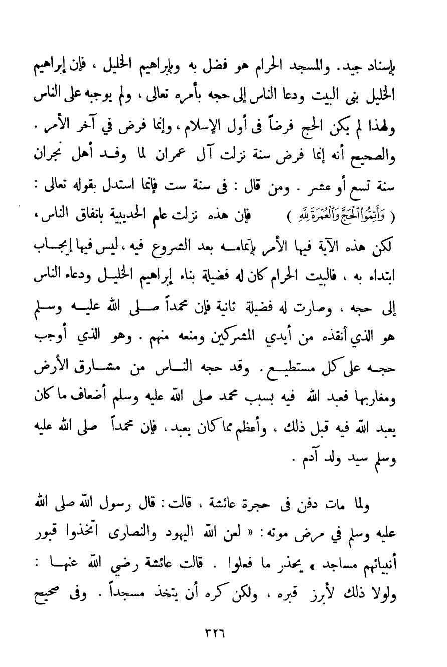 بِإِسْنَادِ جَيِّدٍ. وَالْمَسْجِدُ الْحَرَامُ هُوَ فُضِّلَ بِهِ وَبِإِبْرَاهِيمَ الْخَلِيلِ فَإِنَّ إبْرَاهِيمَ الْخَلِيلَ بَنَى الْبَيْتَ وَدَعَا النَّاسَ إلَى حَجِّهِ بِأَمْرِهِ تَعَالَى وَلَمْ يُوجِبْهُ عَلَى النَّاسِ وَلِهَذَا لَمْ يَكُنْ الْحَجُّ فَرْضًا فِي أَوَّلِ الْإِسْلَامِ وَإِنَّمَا فُرِضَ فِي آخِرِ الْأَمْرِ. وَالصَّحِيحُ أَنَّهُ إنَّمَا فُرِضَ سَنَةَ نَزَلَتْ آلُ عِمْرَانَ لَمَّا وَفَدَ أَهْلُ نَجْرَانَ سَنَةَ تِسْعٍ أَوْ عَشْرٍ. وَمَنْ قَالَ: فِي سَنَةِ سِتٍّ فَإِنَّمَا اسْتَدَلَّ بِقَوْلِهِ تَعَالَى: {وَأَتِمُّوا الْحَجَّ وَالْعُمْرَةَ لِلَّهِ} فَإِنَّ هَذِهِ نَزَلَتْ عَامَ الْحُدَيْبِيَةِ بِاتِّفَاقِ النَّاسِ لَكِنَّ هَذِهِ الْآيَةَ فِيهَا الْأَمْرُ بِإِتْمَامِهِ بَعْدَ الشُّرُوعِ فِيهِ لَيْسَ فِيهَا إيجَابُ ابْتِدَاءٍ بِهِ فَالْبَيْتُ الْحَرَامُ كَانَ لَهُ فَضِيلَةُ بِنَاءِ إبْرَاهِيمَ الْخَلِيلِ وَدُعَاءِ النَّاسِ إلَى حَجِّهِ وَصَارَتْ لَهُ فَضِيلَةٌ ثَانِيَةٌ فَإِنَّ مُحَمَّدًا صَلَّى اللَّهُ عَلَيْهِ وَسَلَّمَ هُوَ الَّذِي أَنْقَذَهُ مِنْ أَيْدِي الْمُشْرِكِينَ وَمَنَعَهُ مِنْهُمْ. وَهُوَ الَّذِي أَوْجَبَ حَجَّهُ عَلَى كُلِّ مُسْتَطِيعٍ. وَقَدْ حَجَّهُ النَّاسُ مِنْ مَشَارِقِ الْأَرْضِ وَمَغَارِبِهَا فَعَبَدَ اللَّهَ فِيهِ بِسَبَبِ مُحَمَّدٍ صَلَّى اللَّهُ عَلَيْهِ وَسَلَّمَ أَضْعَافُ مَا كَانَ يَعْبُدُ اللَّهَ فِيهِ قَبْلَ ذَلِكَ وَأَعْظَمُ مِمَّا كَانَ يُعْبَدُ فَإِنَّ مُحَمَّدًا صَلَّى اللَّهُ عَلَيْهِ وَسَلَّمَ سَيِّدُ وَلَدِ آدَمَ. وَلَمَّا مَاتَ دُفِنَ فِي حُجْرَةِ عَائِشَةَ؛ قَالَتْ: قَالَ رَسُولُ اللَّهِ صَلَّى اللَّهُ عَلَيْهِ وَسَلَّمَ فِي مَرَضِ مَوْتِهِ: {لَعَنَ اللَّهُ الْيَهُودَ وَالنَّصَارَى اتَّخَذُوا قُبُورَ أَنْبِيَائِهِمْ مَسَاجِدَ} يُحَذِّرُ مَا فَعَلُوا. قَالَتْ عَائِشَةُ رَضِيَ اللَّهُ عَنْهَا وَلَوْلَا ذَلِكَ لَأُبْرِزَ قَبْرُهُ وَلَكِنْ كَرِهَ أَنْ يُتَّخَذَ مَسْجِدًا. وَفِي صَحِيحِ