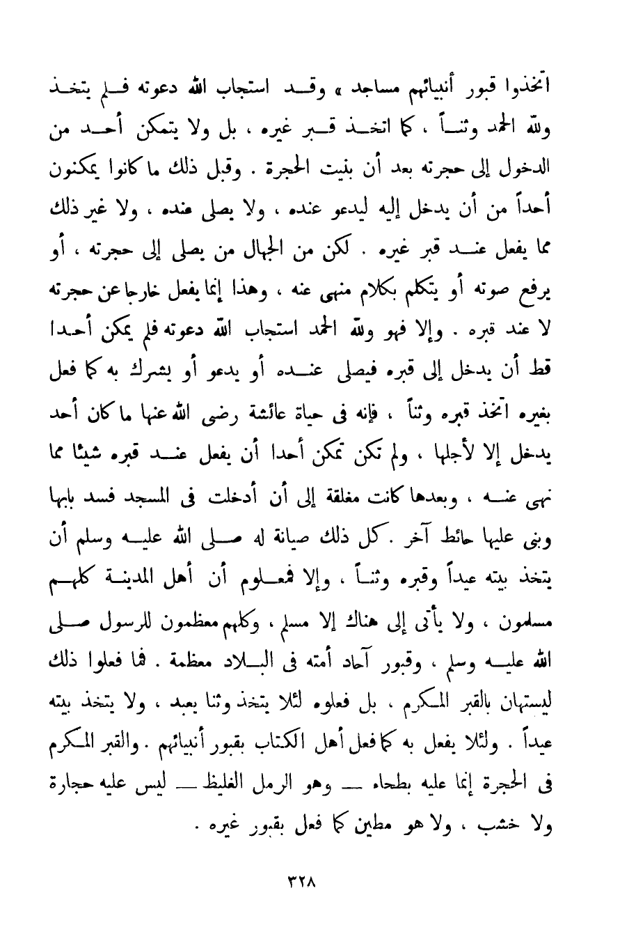 اتَّخَذُوا قُبُورَ أَنْبِيَائِهِمْ مَسَاجِدَ} وَقَدْ اسْتَجَابَ اللَّهُ دَعْوَتَهُ فَلَمْ يُتَّخَذْ وَلِلَّهِ الْحَمْدُ وَثَنًا كَمَا اُتُّخِذَ قَبْرُ غَيْرِهِ بَلْ وَلَا يَتَمَكَّنُ أَحَدٌ مِنْ الدُّخُولِ إلَى حُجْرَتِهِ بَعْدَ أَنْ بُنِيَتْ الْحُجْرَةُ. وَقَبْلَ ذَلِكَ مَا كَانُوا يُمَكِّنُونَ أَحَدًا مِنْ أَنْ يَدْخُلَ إلَيْهِ لِيَدْعُوَ عِنْدَهُ وَلَا يُصَلِّيَ عِنْدَهُ وَلَا غَيْرَ ذَلِكَ مِمَّا يُفْعَلُ عِنْدَ قَبْرِ غَيْرِهِ. لَكِنْ مِنْ الْجُهَّالِ مَنْ يُصَلِّي إلَى حُجْرَتِهِ أَوْ يَرْفَعُ صَوْتَهُ أَوْ يَتَكَلَّمُ بِكَلَامِ مَنْهِيٍّ عَنْهُ وَهَذَا إنَّمَا يُفْعَلُ خَارِجًا عِنْدَ حُجْرَتِهِ لَا عِنْدَ قَبْرِهِ. وَإِلَّا فَهُوَ وَلِلَّهِ الْحَمْدُ اسْتَجَابَ اللَّهُ دَعْوَتَهُ فَلَمْ يُمَكَّنْ أَحَدٌ قَطُّ أَنْ يَدْخُلَ إلَى قَبْرِهِ فَيُصَلِّيَ عِنْدَهُ أَوْ يَدْعُوَ أَوْ يُشْرِكَ بِهِ كَمَا فُعِلَ بِغَيْرِهِ اُتُّخِذَ قَبْرُهُ وَثَنًا فَإِنَّهُ فِي حَيَاةِ عَائِشَةَ رَضِيَ اللَّهُ عَنْهَا مَا كَانَ أَحَدٌ يَدْخُلُ إلَّا لِأَجْلِهَا وَلَمْ تَكُنْ تُمَكِّنُ أَحَدًا أَنْ يَفْعَلَ عِنْدَ قَبْرِهِ شَيْئًا مِمَّا نَهَى عَنْهُ وَبَعْدَهَا كَانَتْ مُغْلَقَةً إلَى أَنْ أُدْخِلَتْ فِي الْمَسْجِدِ فَسُدَّ بَابُهَا وَبُنِيَ عَلَيْهَا حَائِطٌ آخَرُ. كُلُّ ذَلِكَ صِيَانَةً لَهُ صَلَّى اللَّهُ عَلَيْهِ وَسَلَّمَ أَنْ يُتَّخَذَ بَيْتُهُ عِيدًا وَقَبْرُهُ وَثَنًا وَإِلَّا فَمَعْلُومٌ أَنَّ أَهْلَ الْمَدِينَةِ كُلَّهُمْ مُسْلِمُونَ وَلَا يَأْتِي إلَى هُنَاكَ إلَّا مُسْلِمٌ وَكُلُّهُمْ مُعَظِّمُونَ لِلرَّسُولِ صَلَّى اللَّهُ عَلَيْهِ وَسَلَّمَ وَقُبُورُ آحَادِ أُمَّتِهِ فِي الْبِلَادِ مُعَظَّمَةٌ. فَمَا فَعَلُوا ذَلِكَ لِيُسْتَهَانَ بِالْقَبْرِ الْمُكَرَّمِ بَلْ فَعَلَوْهُ لِئَلَّا يُتَّخَذَ وَثَنًا يُعْبَدُ وَلَا يُتَّخَذُ بَيْتُهُ عِيدًا. وَلِئَلَّا يُفْعَلَ بِهِ كَمَا فَعَلَ أَهْلُ الْكِتَابِ بِقُبُورِ أَنْبِيَائِهِمْ. وَالْقَبْرُ الْمُكَرَّمُ فِي الْحُجْرَةِ إنَّمَا عَلَيْهِ بَطْحَاءُ - وَهُوَ الرَّمْلُ الْغَلِيظُ - لَيْسَ عَلَيْهِ حِجَارَةٌ وَلَا خَشَبٌ وَلَا هُوَ مُطَيَّنٌ كَمَا فُعِلَ بِقُبُورِ غَيْرِهِ.