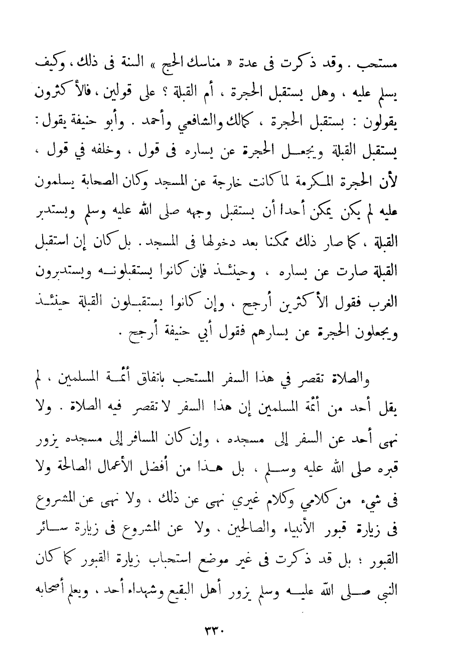 مُسْتَحَبٌّ. وَقَدْ ذَكَرْت فِي عُدَّةِ " مَنَاسِكِ الْحَجِّ " السُّنَّةَ فِي ذَلِكَ وَكَيْفَ يُسَلِّمُ عَلَيْهِ وَهَلْ يَسْتَقْبِلُ الْحُجْرَةَ أَمْ الْقِبْلَةَ؟ عَلَى قَوْلَيْنِ فَالْأَكْثَرُونَ يَقُولُونَ: يَسْتَقْبِلُ الْحُجْرَةَ كَمَالِكِ وَالشَّافِعِيِّ وَأَحْمَد. وَأَبُو حَنِيفَةَ يَقُولُ: يَسْتَقْبِلُ الْقِبْلَةَ وَيَجْعَلُ الْحُجْرَةَ عَنْ يَسَارِهِ فِي قَوْلٍ وَخَلْفَهُ فِي قَوْلٍ لِأَنَّ الْحُجْرَةَ الْمُكَرَّمَةَ لَمَّا كَانَتْ خَارِجَةً عَنْ الْمَسْجِدِ وَكَانَ الصَّحَابَةُ يُسَلِّمُونَ عَلَيْهِ لَمْ يَكُنْ يُمْكِنُ أَحَدًا أَنْ يَسْتَقْبِلَ وَجْهَهُ صَلَّى اللَّهُ عَلَيْهِ وَسَلَّمَ وَيَسْتَدْبِرَ الْقِبْلَةَ كَمَا صَارَ ذَلِكَ مُمْكِنًا بَعْدَ دُخُولِهَا فِي الْمَسْجِدِ. بَلْ كَانَ إنْ اسْتَقْبَلَ الْقِبْلَةَ صَارَتْ عَنْ يَسَارِهِ وَحِينَئِذٍ فَإِنْ كَانُوا يَسْتَقْبِلُونَهُ وَيَسْتَدْبِرُونَ الْغَرْبَ فَقَوْلُ الْأَكْثَرِينَ أَرْجَحُ وَإِنْ كَانُوا يَسْتَقْبِلُونَ الْقِبْلَةَ حِينَئِذٍ وَيَجْعَلُونَ الْحُجْرَةَ عَنْ يَسَارِهِمْ فَقَوْلُ أَبِي حَنِيفَةَ أَرْجَحُ. وَالصَّلَاةُ تُقْصَرُ فِي هَذَا السَّفَرِ الْمُسْتَحَبِّ بِاتِّفَاقِ أَئِمَّةِ الْمُسْلِمِينَ لَمْ يَقُلْ أَحَدٌ مِنْ أَئِمَّةِ الْمُسْلِمِينَ إنَّ هَذَا السَّفَرَ لَا تُقْصَرُ فِيهِ الصَّلَاةُ. وَلَا نَهَى أَحَدٌ عَنْ السَّفَرِ إلَى مَسْجِدِهِ وَإِنْ كَانَ الْمُسَافِرُ إلَى مَسْجِدِهِ يَزُورُ قَبْرَهُ صَلَّى اللَّهُ عَلَيْهِ وَسَلَّمَ بَلْ هَذَا مِنْ أَفْضَلِ الْأَعْمَالِ الصَّالِحَةِ وَلَا فِي شَيْءٍ مِنْ كَلَامِي وَكَلَامِ غَيْرِي نَهْيٌ عَنْ ذَلِكَ وَلَا نَهْيٌ عَنْ الْمَشْرُوعِ فِي زِيَارَةِ قُبُورِ الْأَنْبِيَاءِ وَالصَّالِحِينَ وَلَا عَنْ الْمَشْرُوعِ فِي زِيَارَةِ سَائِرِ الْقُبُورِ؛ بَلْ قَدْ ذَكَرْت فِي غَيْرِ مَوْضِعٍ اسْتِحْبَابَ زِيَارَةِ الْقُبُورِ كَمَا {كَانَ النَّبِيُّ صَلَّى اللَّهُ عَلَيْهِ وَسَلَّمَ يَزُورُ أَهْلَ الْبَقِيعِ وَشُهَدَاءَ أُحُدٍ وَيُعَلِّمُ أَصْحَابَهُ