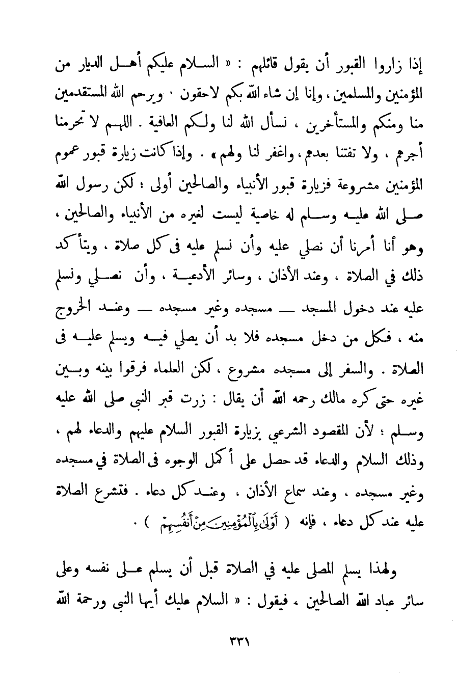 إذَا زَارُوا الْقُبُورَ أَنْ يَقُولَ قَائِلُهُمْ: السَّلَامُ عَلَيْكُمْ أَهْلَ الدِّيَارِ مِنْ الْمُؤْمِنِينَ وَالْمُسْلِمِينَ وَإِنَّا إنْ شَاءَ اللَّهُ بِكُمْ لَاحِقُونَ وَيَرْحَمُ اللَّهُ الْمُسْتَقْدِمِينَ مِنَّا وَمِنْكُمْ وَالْمُسْتَأْخِرِين نَسْأَلُ اللَّهَ لَنَا وَلَكُمْ الْعَافِيَةَ. اللَّهُمَّ لَا تَحْرِمْنَا أَجْرَهُمْ وَلَا تَفْتِنَّا بَعْدَهُمْ وَاغْفِرْ لَنَا وَلَهُمْ} . وَإِذَا كَانَتْ زِيَارَةُ قُبُورِ عُمُومِ الْمُؤْمِنِينَ مَشْرُوعَةً فَزِيَارَةُ قُبُورِ الْأَنْبِيَاءِ وَالصَّالِحِينَ أَوْلَى؛ لَكِنَّ رَسُولَ اللَّهِ صَلَّى اللَّهُ عَلَيْهِ وَسَلَّمَ لَهُ خَاصِّيَّةٌ لَيْسَتْ لِغَيْرِهِ مِنْ الْأَنْبِيَاءِ وَالصَّالِحِينَ وَهُوَ أَنَّا أُمِرْنَا أَنْ نُصَلِّيَ عَلَيْهِ وَأَنْ نُسَلِّمَ عَلَيْهِ فِي كُلِّ صَلَاةٍ وَيَتَأَكَّدُ ذَلِكَ فِي الصَّلَاةِ وَعِنْدَ الْأَذَانِ وَسَائِرِ الْأَدْعِيَةِ وَأَنْ نُصَلِّيَ وَنُسَلِّمَ عَلَيْهِ عِنْدَ دُخُولِ الْمَسْجِدِ - مَسْجِدِهِ وَغَيْرِ مَسْجِدِهِ - وَعِنْدَ الْخُرُوجِ مِنْهُ فَكُلُّ مَنْ دَخَلَ مَسْجِدَهُ فَلَا بُدَّ أَنْ يُصَلِّيَ فِيهِ وَيُسَلِّمَ عَلَيْهِ فِي الصَّلَاةِ. وَالسَّفَرُ إلَى مَسْجِدِهِ مَشْرُوعٌ لَكِنَّ الْعُلَمَاءَ فَرَّقُوا بَيْنَهُ وَبَيْنَ غَيْرِهِ حَتَّى كَرِهَ مَالِكٌ رَحِمَهُ اللَّهُ أَنْ يُقَالَ: زُرْت قَبْرَ النَّبِيِّ صَلَّى اللَّهُ عَلَيْهِ وَسَلَّمَ؛ لِأَنَّ الْمَقْصُودَ الشَّرْعِيَّ بِزِيَارَةِ الْقُبُورِ السَّلَامُ عَلَيْهِمْ وَالدُّعَاءُ لَهُمْ وَذَلِكَ السَّلَامُ وَالدُّعَاءُ قَدْ حَصَلَ عَلَى أَكْمَلِ الْوُجُوهِ فِي الصَّلَاةِ فِي مَسْجِدِهِ وَغَيْرِ مَسْجِدِهِ وَعِنْدَ سَمَاعِ الْأَذَانِ. وَعِنْد كُلِّ دُعَاءٍ. فَتُشْرَعُ الصَّلَاةُ عَلَيْهِ عِنْدَ كُلِّ دُعَاءٍ فَإِنَّهُ {أَوْلَى بِالْمُؤْمِنِينَ مِنْ أَنْفُسِهِمْ} . وَلِهَذَا يُسَلِّمُ الْمُصَلِّي عَلَيْهِ فِي الصَّلَاةِ قَبْلَ أَنْ يُسَلِّمَ عَلَى نَفْسِهِ وَعَلَى سَائِرِ عِبَادِ اللَّهِ الصَّالِحِينَ فَيَقُولُ: {السَّلَامُ عَلَيْك أَيُّهَا النَّبِيُّ وَرَحْمَةُ اللَّهِ