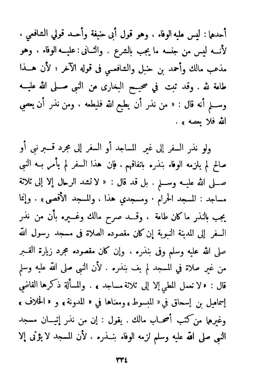 أَحَدُهُمَا: لَيْسَ عَلَيْهِ الْوَفَاءُ وَهُوَ قَوْلُ أَبِي حَنِيفَةَ وَأَحَدُ قَوْلَيْ الشَّافِعِيِّ لِأَنَّهُ لَيْسَ مَنْ جِنْسِهِ مَا يَجِبُ بِالشَّرْعِ. وَالثَّانِي: عَلَيْهِ الْوَفَاءُ وَهُوَ مَذْهَبُ مَالِكٍ وَأَحْمَد بْنِ حَنْبَلٍ وَالشَّافِعِيِّ فِي قَوْلِهِ الْآخَرِ؛ لِأَنَّ هَذَا طَاعَةٌ لِلَّهِ. وَقَدْ ثَبَتَ فِي صَحِيحِ الْبُخَارِيِّ عَنْ النَّبِيِّ صَلَّى اللَّهُ عَلَيْهِ وَسَلَّمَ أَنَّهُ قَالَ: {مَنْ نَذَرَ أَنْ يُطِيعَ اللَّهَ فَلْيُطِعْهُ وَمَنْ نَذَرَ أَنْ يَعْصِيَ اللَّهَ فَلَا يَعْصِهِ} . وَلَوْ نَذَرَ السَّفَرَ إلَى غَيْرِ الْمَسَاجِدِ أَوْ السَّفَرَ إلَى مُجَرَّدِ قَبْرِ نَبِيٍّ أَوْ صَالِحٍ لَمْ يَلْزَمْهُ الْوَفَاءُ بِنَذْرِهِ بِاتِّفَاقِهِمْ فَإِنَّ هَذَا السَّفَرَ لَمْ يَأْمُرْ بِهِ النَّبِيُّ صَلَّى اللَّهُ عَلَيْهِ وَسَلَّمَ. بَلْ قَدْ قَالَ: {لَا تُشَدُّ الرِّحَالُ إلَّا إلَى ثَلَاثَةِ مَسَاجِدَ: الْمَسْجِدِ الْحَرَامِ وَمَسْجِدِي هَذَا وَالْمَسْجِدِ الْأَقْصَى} . وَإِنَّمَا يَجِبُ بِالنَّذْرِ مَا كَانَ طَاعَةً وَقَدْ صَرَّحَ مَالِكٌ وَغَيْرُهُ بِأَنَّ مَنْ نَذَرَ السَّفَرَ إلَى الْمَدِينَةِ النَّبَوِيَّةِ إنْ كَانَ مَقْصُودُهُ الصَّلَاةَ فِي مَسْجِدِ رَسُولِ اللَّهِ صَلَّى اللَّهُ عَلَيْهِ وَسَلَّمَ وَفَّى بِنَذْرِهِ وَإِنْ كَانَ مَقْصُودُهُ مُجَرَّدَ زِيَارَةِ الْقَبْرِ مِنْ غَيْرِ صَلَاةٍ فِي الْمَسْجِدِ لَمْ يَفِ بِنَذْرِهِ. لِأَنَّ النَّبِيَّ صَلَّى اللَّهُ عَلَيْهِ وَسَلَّمَ قَالَ: {لَا تُعْمَلُ الْمَطِيُّ إلَّا إلَى ثَلَاثَةِ مَسَاجِدَ} . وَالْمَسْأَلَةُ ذَكَرَهَا الْقَاضِي إسْمَاعِيلُ بْنُ إسْحَاقَ فِي " الْمَبْسُوطِ " وَمَعْنَاهَا فِي " الْمُدَوَّنَةِ " و " الْخِلَافِ " وَغَيْرِهِمَا مِنْ كُتُبِ أَصْحَابِ مَالِكٍ. يَقُولُ: إنَّ مَنْ نَذَرَ إتْيَانَ مَسْجِدِ النَّبِيِّ صَلَّى اللَّهُ عَلَيْهِ وَسَلَّمَ لَزِمَهُ الْوَفَاءُ بِنَذْرِهِ لِأَنَّ الْمَسْجِدَ لَا يُؤْتَى إلَّا