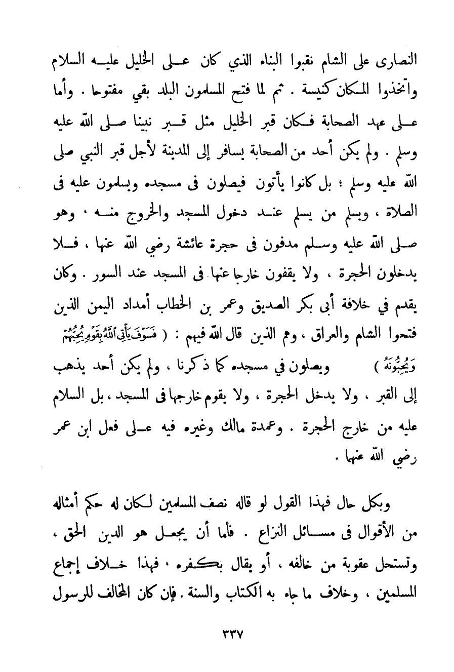 النَّصَارَى عَلَى الشَّامِ نَقَبُوا الْبِنَاءَ الَّذِي كَانَ عَلَى الْخَلِيلِ عَلَيْهِ السَّلَامُ وَاِتَّخَذُوا الْمَكَانَ كَنِيسَةً. ثُمَّ لَمَّا فَتَحَ الْمُسْلِمُونَ الْبَلَدَ بَقِيَ مَفْتُوحًا. وَأَمَّا عَلَى عَهْدِ الصَّحَابَةِ فَكَانَ قَبْرُ الْخَلِيلِ مِثْلَ قَبْرِ نَبِيِّنَا صَلَّى اللَّهُ عَلَيْهِ وَسَلَّمَ وَلَمْ يَكُنْ أَحَدٌ مِنْ الصَّحَابَةِ يُسَافِرُ إلَى الْمَدِينَةِ لِأَجْلِ قَبْرِ النَّبِيِّ صَلَّى اللَّهُ عَلَيْهِ وَسَلَّمَ بَلْ كَانُوا يَأْتُونَ فَيُصَلُّونَ فِي مَسْجِدِهِ وَيُسَلِّمُونَ عَلَيْهِ فِي الصَّلَاةِ وَيُسَلِّمُ مَنْ يُسَلِّمُ عِنْدَ دُخُولِ الْمَسْجِدِ وَالْخُرُوجِ مِنْهُ وَهُوَ صَلَّى اللَّهُ عَلَيْهِ وَسَلَّمَ مَدْفُونٌ فِي حُجْرَةِ عَائِشَةَ رَضِيَ اللَّهُ عَنْهَا فَلَا يَدْخُلُونَ الْحُجْرَةَ وَلَا يَقِفُونَ خَارِجًا عَنْهَا فِي الْمَسْجِدِ عِنْدَ السُّورِ. وَكَانَ يَقْدَمُ فِي خِلَافِهِ أَبِي بَكْرٍ الصَّدِيقِ وَعُمَرَ بْنِ الْخَطَّابِ أَمْدَادُ الْيَمَنِ الَّذِينَ فَتَحُوا الشَّامَ وَالْعِرَاقَ وَهُمْ الَّذِينَ قَالَ اللَّهُ فِيهِمْ: {فَسَوْفَ يَأْتِي اللَّهُ بِقَوْمٍ يُحِبُّهُمْ وَيُحِبُّونَهُ} وَيُصَلُّونَ فِي مَسْجِدِهِ كَمَا ذَكَرْنَا وَلَمْ يَكُنْ أَحَدٌ يَذْهَبُ إلَى الْقَبْرِ وَلَا يَدْخُلُ الْحُجْرَةَ وَلَا يَقُومُ خَارِجَهَا فِي الْمَسْجِدِ بَلْ السَّلَامُ عَلَيْهِ مِنْ خَارِجِ الْحُجْرَةِ. وَعُمْدَةُ مَالِكٍ وَغَيْرِهِ فِيهِ عَلَى فِعْلِ ابْنِ عُمَرَ رَضِيَ اللَّهُ عَنْهُمَا. وَبِكُلِّ حَالٍ فَهَذَا الْقَوْلُ لَوْ قَالَهُ نِصْفُ الْمُسْلِمِينَ لَكَانَ لَهُ حُكْمُ أَمْثَالِهِ مِنْ الْأَقْوَالِ فِي مَسَائِلِ النِّزَاعِ. فَإِمَّا أَنْ يُجْعَلَ هُوَ الدِّينَ الْحَقَّ وَتُسْتَحَلَّ عُقُوبَةُ مَنْ خَالَفَهُ أَوْ يُقَالَ بِكُفْرِهِ فَهَذَا خِلَافُ إجْمَاعِ الْمُسْلِمِينَ. وَخِلَافُ مَا جَاءَ بِهِ الْكِتَابُ وَالسُّنَّةُ. فَإِنْ كَانَ الْمُخَالِفُ لِلرَّسُولِ