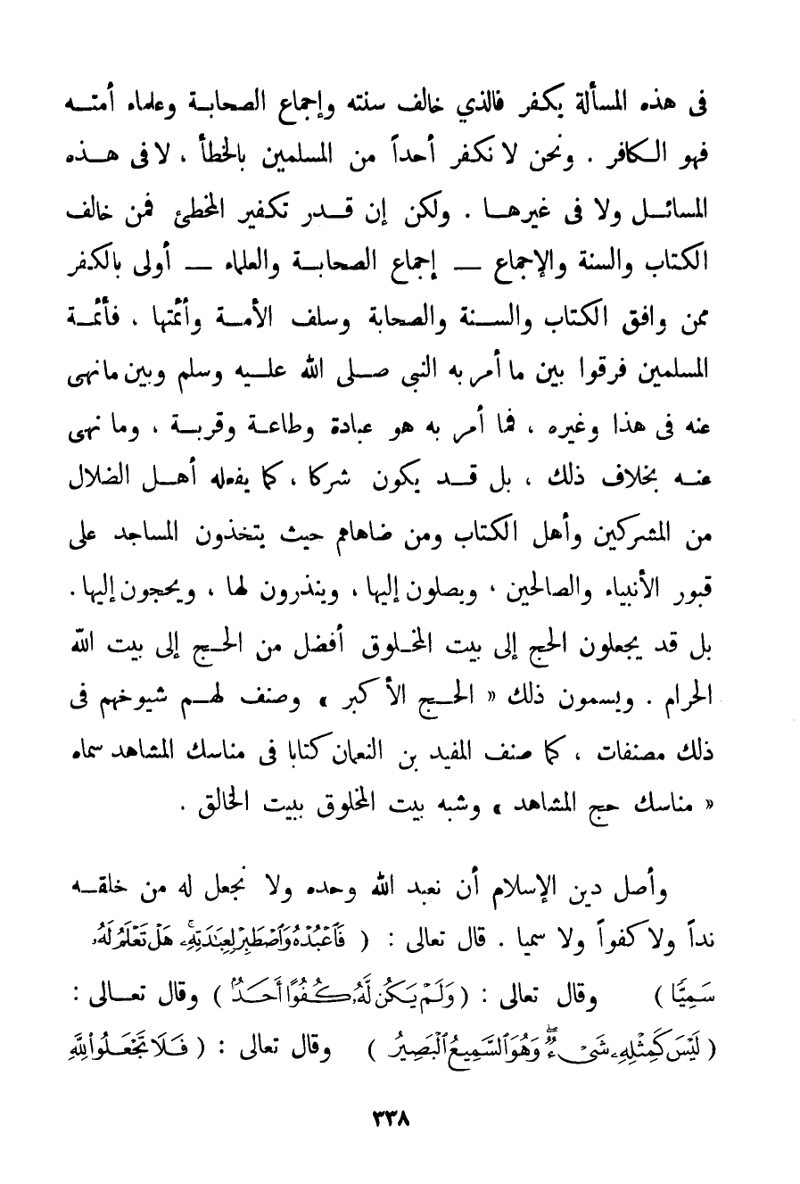 فِي هَذِهِ الْمَسْأَلَةِ يَكْفُرُ فَاَلَّذِي خَالَفَ سُنَّتَهُ وَإِجْمَاعَ الصَّحَابَةِ وَعُلَمَاءَ أُمَّتِهِ فَهُوَ الْكَافِرُ. وَنَحْنُ لَا نُكَفِّرُ أَحَدًا مِنْ الْمُسْلِمِينَ بِالْخَطَأِ لَا فِي هَذِهِ الْمَسَائِلِ وَلَا فِي غَيْرِهَا. وَلَكِنْ إنْ قُدِّرَ تَكْفِيرُ الْمُخْطِئِ فَمَنْ خَالَفَ الْكِتَابَ وَالسُّنَّةَ وَالْإِجْمَاعَ - إجْمَاعَ الصَّحَابَةِ وَالْعُلَمَاءِ - أَوْلَى بِالْكُفْرِ مِمَّنْ وَافَقَ الْكِتَابَ وَالسُّنَّةَ وَالصَّحَابَةَ وَسَلَفَ الْأُمَّةِ وَأَئِمَّتَهَا فَأَئِمَّةُ الْمُسْلِمِينَ فَرَّقُوا بَيْنَ مَا أَمَرَ بِهِ النَّبِيُّ صَلَّى اللَّهُ عَلَيْهِ وَسَلَّمَ وَبَيْنَ مَا نَهَى عَنْهُ فِي هَذَا وَغَيْرِهِ فَمَا أَمَرَ بِهِ هُوَ عِبَادَةٌ وَطَاعَةٌ وَقُرْبَةٌ وَمَا نَهَى عَنْهُ بِخِلَافِ ذَلِكَ بَلْ قَدْ يَكُونُ شِرْكًا كَمَا يَفْعَلُهُ أَهْلُ الضَّلَالِ مِنْ الْمُشْرِكِينَ وَأَهْلِ الْكِتَابِ وَمَنْ ضَاهَاهُمْ حَيْثُ يَتَّخِذُونَ الْمَسَاجِدَ عَلَى قُبُورِ الْأَنْبِيَاءِ وَالصَّالِحِينَ وَيُصَلُّونَ إلَيْهَا وَيَنْذِرُونَ لَهَا وَيَحُجُّونَ إلَيْهَا. بَلْ قَدْ يَجْعَلُونَ الْحَجَّ إلَى بَيْتِ الْمَخْلُوقِ أَفْضَلَ مِنْ الْحَجِّ إلَى بَيْتِ اللَّهِ الْحَرَامِ. وَيُسَمُّونَ ذَلِكَ " الْحَجَّ الْأَكْبَرَ " وَصَنَّفَ لَهُمْ شُيُوخُهُمْ فِي ذَلِكَ مُصَنَّفَاتٍ كَمَا صَنَّفَ الْمُفِيدُ بْنُ النُّعْمَانِ كِتَابًا فِي مَنَاسِكَ الْمَشَاهِدِ سَمَّاهُ " مَنَاسِكُ حَجِّ الْمَشَاهِدِ " وَشَبَّهَ بَيْتَ الْمَخْلُوقِ بِبَيْتِ الْخَالِقِ. وَأَصْلُ دِينِ الْإِسْلَامِ أَنْ نَعْبُدَ اللَّهَ وَحْدَهُ وَلَا نَجْعَلَ لَهُ مِنْ خَلْقِهِ نِدًّا وَلَا كُفُوًا وَلَا سَمِيًّا. قَالَ تَعَالَى: {فَاعْبُدْهُ وَاصْطَبِرْ لِعِبَادَتِهِ هَلْ تَعْلَمُ لَهُ سَمِيًّا} وَقَالَ تَعَالَى: {وَلَمْ يَكُنْ لَهُ كُفُوًا أَحَدٌ} وَقَالَ تَعَالَى: {لَيْسَ كَمِثْلِهِ شَيْءٌ وَهُوَ السَّمِيعُ الْبَصِيرُ} وَقَالَ تَعَالَى: {فَلَا تَجْعَلُوا