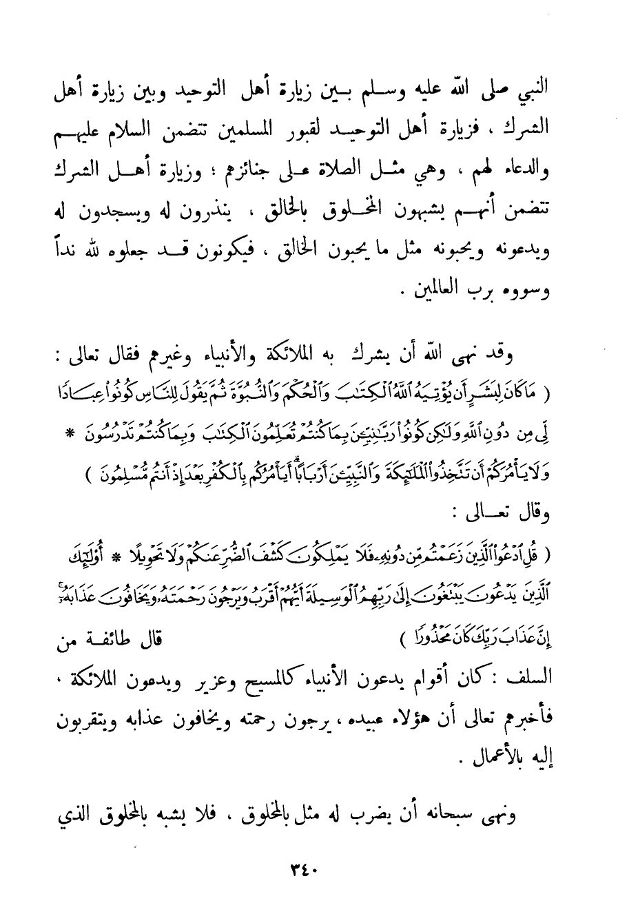 النَّبِيُّ صَلَّى اللَّهُ عَلَيْهِ وَسَلَّمَ بَيْنَ زِيَارَةِ أَهْلِ التَّوْحِيدِ وَبَيْنَ زِيَارَةِ أَهْلِ الشِّرْكِ فَزِيَارَةُ أَهْلِ التَّوْحِيدِ لِقُبُورِ الْمُسْلِمِينَ تَتَضَمَّنُ السَّلَامَ عَلَيْهِمْ وَالدُّعَاءَ لَهُمْ وَهِيَ مِثْلُ الصَّلَاةِ عَلَى جَنَائِزِهِمْ؛ وَزِيَارَةُ أَهْلِ الشِّرْكِ تَتَضَمَّنُ أَنَّهُمْ يُشَبِّهُونَ الْمَخْلُوقَ بِالْخَالِقِ يَنْذِرُونَ لَهُ وَيَسْجُدُونَ لَهُ وَيَدْعُونَهُ وَيُحِبُّونَهُ مِثْلَ مَا يُحِبُّونَ الْخَالِقَ فَيَكُونُونَ قَدْ جَعَلُوهُ لِلَّهِ نِدًّا وَسَوَّوْهُ بِرَبِّ الْعَالَمِينَ. وَقَدْ نَهَى اللَّهُ أَنْ يُشْرَكَ بِهِ الْمَلَائِكَةُ وَالْأَنْبِيَاءُ وَغَيْرُهُمْ فَقَالَ تَعَالَى: {مَا كَانَ لِبَشَرٍ أَنْ يُؤْتِيَهُ اللَّهُ الْكِتَابَ وَالْحُكْمَ وَالنُّبُوَّةَ ثُمَّ يَقُولَ لِلنَّاسِ كُونُوا عِبَادًا لِي مِنْ دُونِ اللَّهِ وَلَكِنْ كُونُوا رَبَّانِيِّينَ بِمَا كُنْتُمْ تُعَلِّمُونَ الْكِتَابَ وَبِمَا كُنْتُمْ تَدْرُسُونَ وَلَا يَأْمُرَكُمْ أَنْ تَتَّخِذُوا الْمَلَائِكَةَ وَالنَّبِيِّينَ أَرْبَابًا} {أَيَأْمُرُكُمْ بِالْكُفْرِ بَعْدَ إذْ أَنْتُمْ مُسْلِمُونَ} وَقَالَ تَعَالَى: {قُلِ ادْعُوا الَّذِينَ زَعَمْتُمْ مِنْ دُونِهِ فَلَا يَمْلِكُونَ كَشْفَ الضُّرِّ عَنْكُمْ وَلَا تَحْوِيلًا} {أُولَئِكَ الَّذِينَ يَدْعُونَ يَبْتَغُونَ إلَى رَبِّهِمُ الْوَسِيلَةَ أَيُّهُمْ أَقْرَبُ وَيَرْجُونَ رَحْمَتَهُ وَيَخَافُونَ عَذَابَهُ إنَّ عَذَابَ رَبِّكَ كَانَ مَحْذُورًا} قَالَ طَائِفَةٌ مِنْ السَّلَفِ: كَانَ أَقْوَامٌ يَدْعُونَ الْأَنْبِيَاءَ كَالْمَسِيحِ وَعُزَيْرٍ وَيَدْعُونَ الْمَلَائِكَةَ فَأَخْبَرَهُمْ تَعَالَى أَنَّ هَؤُلَاءِ عَبِيدُهُ يَرْجُونَ رَحْمَتَهُ وَيَخَافُونَ عَذَابَهُ وَيَتَقَرَّبُونَ إلَيْهِ بِالْأَعْمَالِ. وَنَهَى سُبْحَانَهُ أَنْ يُضْرَبَ لَهُ مَثَلٌ بِالْمَخْلُوقِ فَلَا يُشَبَّهُ بِالْمَخْلُوقِ الَّذِي