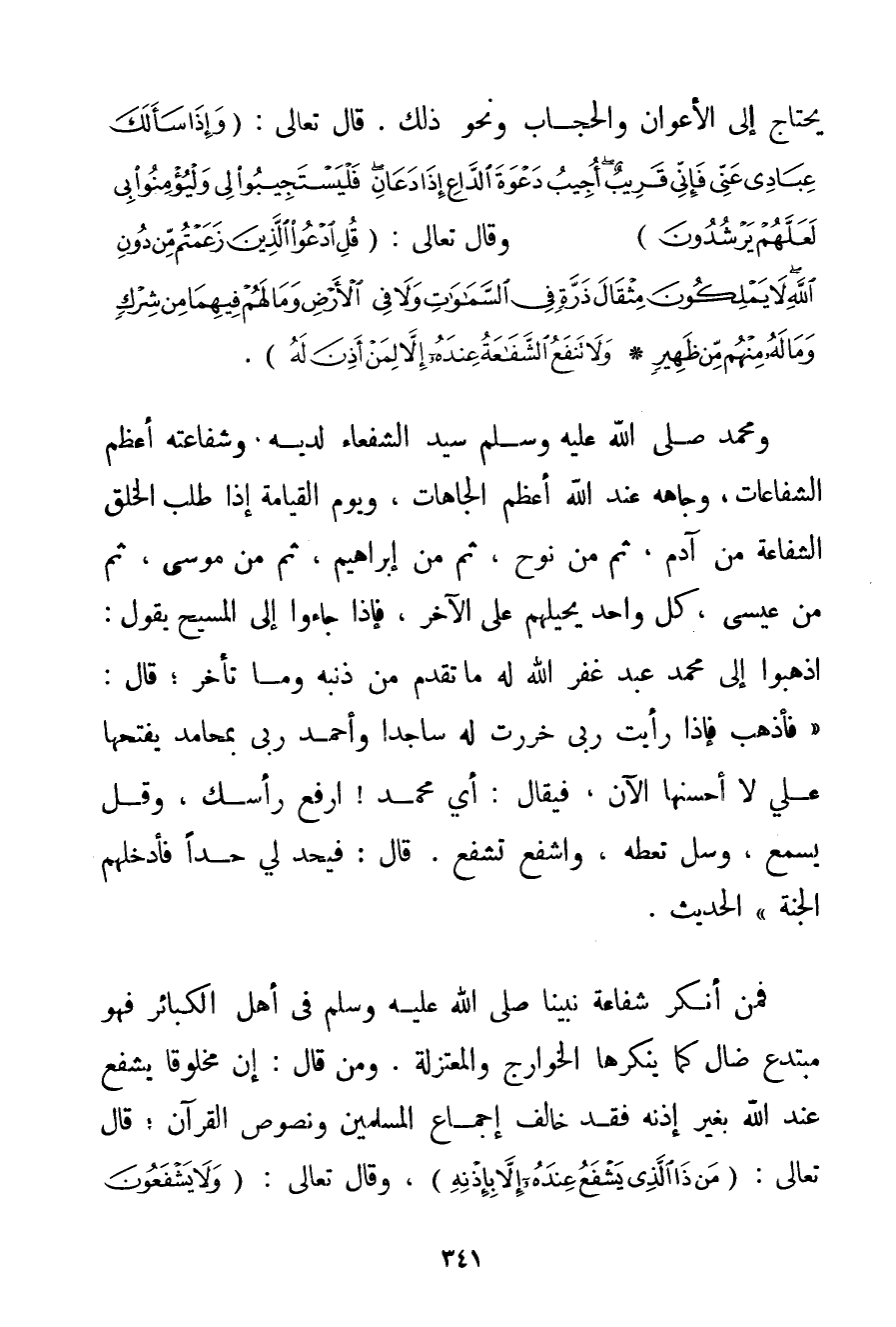 فَمَنْ أَنْكَرَ شَفَاعَةَ نَبِيِّنَا صَلَّى اللَّهُ عَلَيْهِ وَسَلَّمَ فِي أَهْلِ الْكَبَائِرِ فَهُوَ مُبْتَدِعٌ ضَالٌّ كَمَا يُنْكِرُهَا الْخَوَارِجُ وَالْمُعْتَزِلَةُ. وَمَنْ قَالَ: إنَّ مَخْلُوقًا يَشْفَعُ عِنْدَ اللَّهِ بِغَيْرِ إذْنِهِ فَقَدْ خَالَفَ إجْمَاعَ الْمُسْلِمِينَ وَنُصُوصَ الْقُرْآنِ؛ قَالَ تَعَالَى: {مَنْ ذَا الَّذِي يَشْفَعُ عِنْدَهُ إلَّا بِإِذْنِهِ} وَقَالَ تَعَالَى: {وَلَا