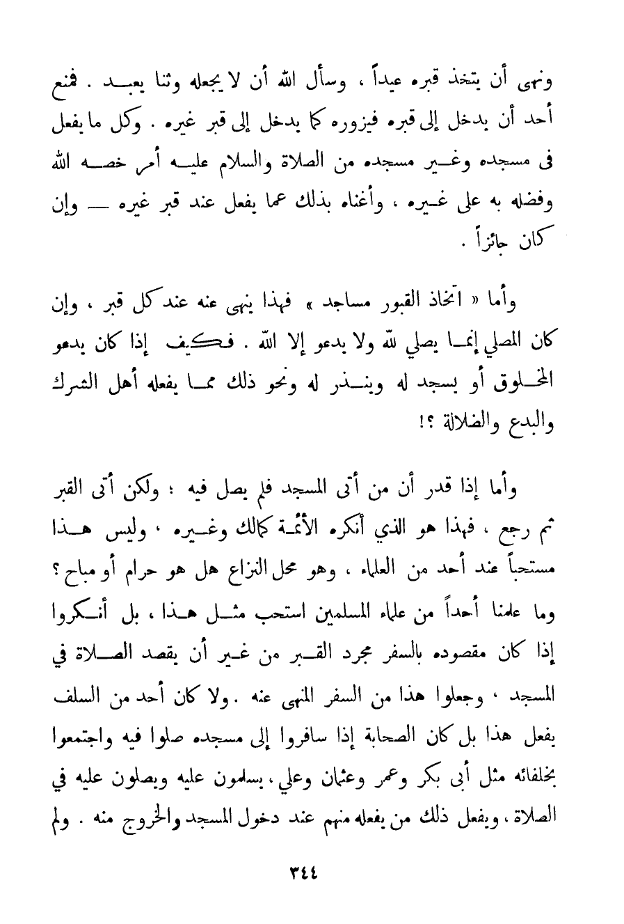 وَنَهَى أَنْ يُتَّخَذَ قَبْرُهُ عِيدًا وَسَأَلَ اللَّهَ أَنْ لَا يَجْعَلُهُ وَثَنًا يُعْبَدُ. فَمُنِعَ أَحَدٌ أَنْ يَدْخُلَ إلَى قَبْرِهِ فَيَزُورَهُ كَمَا يَدْخُلُ إلَى قَبْرِ غَيْرِهِ. وَكُلُّ مَا يُفْعَلُ فِي مَسْجِدِهِ وَغَيْرِ مَسْجِدِهِ مِنْ الصَّلَاةِ وَالسَّلَامِ عَلَيْهِ أَمْرٌ خَصَّهُ اللَّهُ وَفَضَّلَهُ بِهِ عَلَى غَيْرِهِ وَأَغْنَاهُ بِذَلِكَ عَمَّا يُفْعَلُ عِنْدَ قَبْرِ غَيْرِهِ - وَإِنْ كَانَ جَائِزًا. وَأَمَّا " اتِّخَاذُ الْقُبُورِ مَسَاجِدَ " فَهَذَا يُنْهَى عَنْهُ عِنْدَ كُلِّ قَبْرٍ وَإِنْ كَانَ الْمُصَلِّي إنَّمَا يُصَلِّي لِلَّهِ وَلَا يَدْعُو إلَّا اللَّهَ. فَكَيْفَ إذَا كَانَ يَدْعُو الْمَخْلُوقَ أَوْ يَسْجُدَ لَهُ وَيَنْذِرَ لَهُ وَنَحْوَ ذَلِكَ مِمَّا يَفْعَلُهُ أَهْلُ الشِّرْكِ وَالْبِدَعِ وَالضَّلَالَةِ وَأَمَّا إذَا قُدِّرَ أَنَّ مَنْ أَتَى الْمَسْجِدَ فَلَمْ يُصَلِّ فِيهِ؛ وَلَكِنْ أَتَى الْقَبْرَ ثُمَّ رَجَعَ فَهَذَا هُوَ الَّذِي أَنْكَرَهُ الْأَئِمَّةُ كَمَالِكِ وَغَيْرِهِ وَلَيْسَ هَذَا مُسْتَحَبًّا عِنْدَ أَحَدٍ مِنْ الْعُلَمَاءِ وَهُوَ مَحَلُّ النِّزَاعِ هَلْ هُوَ حَرَامٌ أَوْ مُبَاحٌ؟ وَمَا عَلِمْنَا أَحَدًا مِنْ عُلَمَاءِ الْمُسْلِمِينَ اسْتَحَبَّ مِثْلَ هَذَا بَلْ أَنْكَرُوا إذَا كَانَ مَقْصُودُهُ بِالسَّفَرِ مُجَرَّدَ الْقَبْرِ مِنْ غَيْرِ أَنْ يَقْصِدَ الصَّلَاةَ فِي الْمَسْجِدِ وَجَعَلُوا هَذَا مِنْ السَّفَرِ الْمَنْهِيِّ عَنْهُ. وَلَا كَانَ أَحَدٌ مِنْ السَّلَفِ يَفْعَلُ هَذَا بَلْ كَانَ الصَّحَابَةُ إذَا سَافَرُوا إلَى مَسْجِدِهِ صَلَّوْا فِيهِ وَاجْتَمَعُوا بِخُلَفَائِهِ مِثْلَ أَبِي بَكْرٍ وَعُمَرَ وَعُثْمَانَ وَعَلِيٍّ يُسَلِّمُونَ عَلَيْهِ وَيُصَلُّونَ عَلَيْهِ فِي الصَّلَاةِ وَيَفْعَلُ ذَلِكَ مَنْ يَفْعَلُهُ مِنْهُمْ عِنْدَ دُخُولِ الْمَسْجِدِ وَالْخُرُوجِ مِنْهُ. وَلَمْ