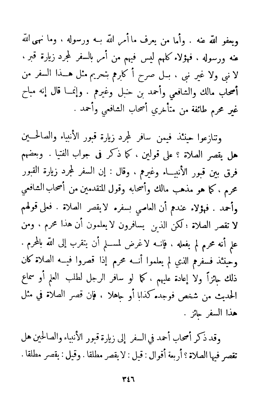 وَتَنَازَعُوا حِينَئِذٍ فِيمَنْ سَافَرَ لِمُجَرَّدِ زِيَارَةِ قُبُورِ الْأَنْبِيَاءِ وَالصَّالِحِينَ هَلْ يَقْصُرُ الصَّلَاةَ؟ عَلَى قَوْلَيْنِ كَمَا ذَكَرَ فِي جَوَابِ الْفُتْيَا. وَبَعْضُهُمْ فَرَّقَ بَيْنَ قُبُورِ الْأَنْبِيَاءِ وَغَيْرِهِمْ وَقَالَ: إنَّ السَّفَرَ لِمُجَرَّدِ زِيَارَةِ الْقُبُورِ مُحَرَّمٌ كَمَا هُوَ مَذْهَبُ مَالِكٍ وَأَصْحَابِهِ وَقَوْلُ الْمُتَقَدِّمِينَ مِنْ أَصْحَابِ الشَّافِعِيِّ وَأَحْمَد. فَهَؤُلَاءِ عِنْدَهُمْ أَنَّ الْعَاصِيَ بِسَفَرِهِ لَا يَقْصُرُ الصَّلَاةَ. فَعَلَى قَوْلِهِمْ لَا تُقْصَرُ الصَّلَاةُ؛ لَكِنَّ الَّذِينَ يُسَافِرُونَ لَا يَعْلَمُونَ أَنَّ هَذَا مُحَرَّمٌ وَمَنْ عَلِمَ أَنَّهُ مُحَرَّمٌ لَمْ يَفْعَلْهُ فَإِنَّهُ لَا غَرَضَ لِمُسْلِمِ أَنْ يَتَقَرَّبَ إلَى اللَّهِ بِالْمُحَرَّمِ. وَحِينَئِذٍ فَسَفَرُهُمْ الَّذِي لَمْ يَعْلَمُوا أَنَّهُ مُحَرَّمٌ إذَا قَصَرُوا فِيهِ الصَّلَاةَ كَانَ ذَلِكَ جَائِزًا وَلَا إعَادَةَ عَلَيْهِمْ كَمَا لَوْ سَافَرَ الرَّجُلُ لِطَلَبِ الْعِلْمِ أَوْ سَمَاعِ الْحَدِيثِ مِنْ شَخْصٍ فَوَجَدَهُ كَذَّابًا أَوْ جَاهِلًا فَإِنَّ قَصْرَ الصَّلَاةِ فِي مِثْلِ هَذَا السَّفَرِ جَائِزٌ. وَقَدْ ذَكَرَ أَصْحَابُ أَحْمَد فِي السَّفَرِ إلَى زِيَارَةِ قُبُورِ الْأَنْبِيَاءِ وَالصَّالِحِينَ هَلْ تُقْصَرُ فِيهَا الصَّلَاةُ؟ أَرْبَعَةَ أَقْوَالٍ: قِيلَ: لَا يَقْصُرُ مُطْلَقًا.