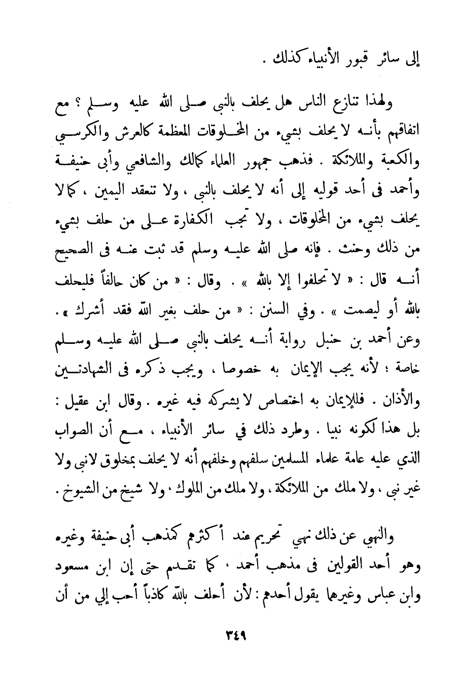 وَلِهَذَا تَنَازَعَ النَّاسُ هَلْ يُحْلَفُ. بِالنَّبِيِّ صَلَّى اللَّهُ عَلَيْهِ وَسَلَّمَ؟ مَعَ اتِّفَاقِهِمْ بِأَنَّهُ لَا يُحْلَفُ بِشَيْءِ مِنْ الْمَخْلُوقَاتِ الْمُعَظَّمَةِ كَالْعَرْشِ وَالْكُرْسِيِّ وَالْكَعْبَةِ وَالْمَلَائِكَةِ. فَذَهَبَ جُمْهُورُ الْعُلَمَاءِ كَمَالِكِ وَالشَّافِعِيِّ وَأَبِي حَنِيفَةَ وَأَحْمَد فِي أَحَدِ قَوْلَيْهِ إلَى أَنَّهُ لَا يُحْلَفُ بِالنَّبِيِّ وَلَا تَنْعَقِدُ الْيَمِينُ كَمَا لَا يُحْلَفُ بِشَيْءِ مِنْ الْمَخْلُوقَاتِ وَلَا تَجِبُ الْكَفَّارَةُ عَلَى مَنْ حَلَفَ بِشَيْءِ مِنْ ذَلِكَ وَحَنِثَ. فَإِنَّهُ صَلَّى اللَّهُ عَلَيْهِ وَسَلَّمَ قَدْ ثَبَتَ عَنْهُ فِي الصَّحِيحِ أَنَّهُ قَالَ: {لَا تَحْلِفُوا إلَّا بِاَللَّهِ} . وَقَالَ: {مَنْ كَانَ حَالِفًا فَلْيَحْلِفْ بِاَللَّهِ أَوْ لِيَصْمُتْ} . وَفِي السُّنَنِ: {مَنْ حَلَفَ بِغَيْرِ اللَّهِ فَقَدْ أَشْرَكَ} .وَعَنْ أَحْمَد بْنِ حَنْبَلٍ رِوَايَةٌ أَنَّهُ يُحْلَفُ بِالنَّبِيِّ صَلَّى اللَّهُ عَلَيْهِ وَسَلَّمَ خَاصَّةً؛ لِأَنَّهُ يَجِبُ الْإِيمَانُ بِهِ خُصُوصًا وَيَجِبُ ذِكْرُهُ فِي الشَّهَادَتَيْنِ وَالْأَذَانِ. فَلِلْإِيمَانِ بِهِ اخْتِصَاصٌ لَا يُشْرِكُهُ فِيهِ غَيْرُهُ. وَقَالَ ابْنُ عَقِيلٍ: بَلْ هَذَا لِكَوْنِهِ نَبِيًّا. وَطُرِدَ ذَلِكَ فِي سَائِرِ الْأَنْبِيَاءِ مَعَ أَنَّ الصَّوَابَ الَّذِي عَلَيْهِ عَامَّةُ عُلَمَاءِ الْمُسْلِمِينَ سَلَفُهُمْ وَخَلَفُهُمْ أَنَّهُ لَا يُحْلَفُ بِمَخْلُوقِ لَا نَبِيٍّ وَلَا غَيْرِ نَبِيٍّ وَلَا مَلَكٍ مِنْ الْمَلَائِكَةِ وَلَا مَلِكٍ مِنْ الْمُلُوكِ وَلَا شَيْخٍ مِنْ الشُّيُوخِ.