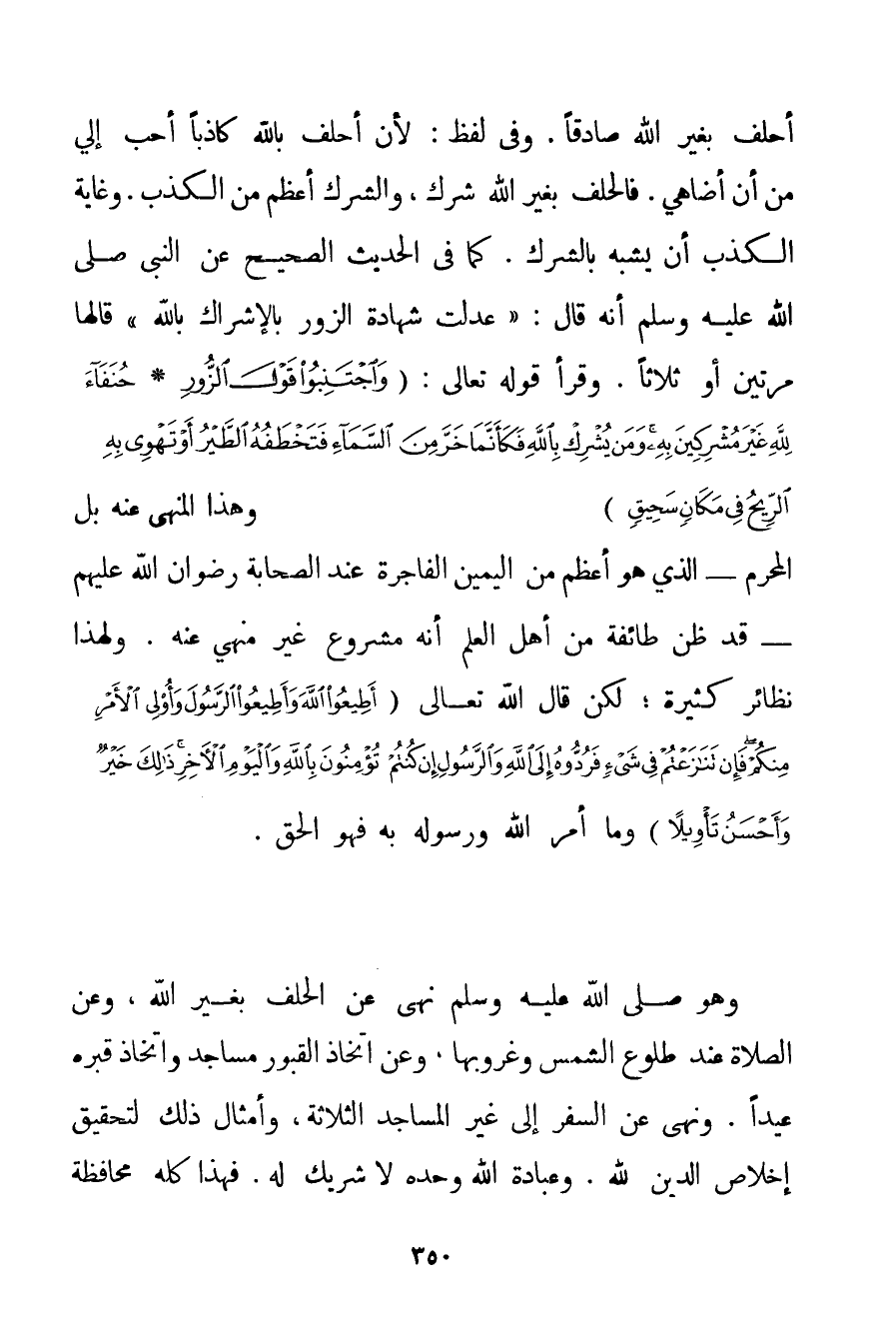 أَحْلِفُ بِغَيْرِ اللَّهِ صَادِقًا. وَفِي لَفْظٍ: لَأَنْ أَحْلِفَ بِاَللَّهِ كَاذِبًا أَحَبُّ إلَيَّ مِنْ أَنْ أُضَاهِيَ. فَالْحَلِفُ بِغَيْرِ اللَّهِ شِرْكٌ وَالشِّرْكُ أَعْظَمُ مِنْ الْكَذِبِ. وَغَايَةُ الْكَذِبِ أَنْ يُشَبَّهَ بِالشِّرْكِ. كَمَا فِي الْحَدِيثِ الصَّحِيحِ عَنْ النَّبِيِّ صَلَّى اللَّهُ عَلَيْهِ وَسَلَّمَ أَنَّهُ قَالَ: {عُدِلَتْ شَهَادَةُ الزُّورِ بِالْإِشْرَاكِ بِاَللَّهِ} قَالَهَا مَرَّتَيْنِ أَوْ ثَلَاثًا. وَقَرَأَ قَوْله تَعَالَى {وَاجْتَنِبُوا قَوْلَ الزُّورِ} {حُنَفَاءَ لِلَّهِ غَيْرَ مُشْرِكِينَ بِهِ وَمَنْ يُشْرِكْ بِاللَّهِ فَكَأَنَّمَا خَرَّ مِنَ السَّمَاءِ فَتَخْطَفُهُ الطَّيْرُ أَوْ تَهْوِي بِهِ الرِّيحُ فِي مَكَانٍ سَحِيقٍ} وَهَذَا الْمَنْهِيُّ عَنْهُ بَلْ الْمُحَرَّمُ - الَّذِي هُوَ أَعْظَمُ مِنْ الْيَمِينِ الْفَاجِرَةِ عِنْدَ الصَّحَابَةِ رِضْوَانُ اللَّهِ عَلَيْهِمْ - قَدْ ظَنَّ طَائِفَةٌ مِنْ أَهْلِ الْعِلْمِ أَنَّهُ مَشْرُوعٌ غَيْرُ مَنْهِيٍّ عَنْهُ. وَلِهَذَا نَظَائِرُ كَثِيرَةٌ؛ لَكِنْ قَالَ اللَّهُ تَعَالَى {أَطِيعُوا اللَّهَ وَأَطِيعُوا الرَّسُولَ وَأُولِي الْأَمْرِ مِنْكُمْ فَإِنْ تَنَازَعْتُمْ فِي شَيْءٍ فَرُدُّوهُ إلَى اللَّهِ وَالرَّسُولِ إنْ كُنْتُمْ تُؤْمِنُونَ بِاللَّهِ وَالْيَوْمِ الْآخِرِ ذَلِكَ خَيْرٌ وَأَحْسَنُ تَأْوِيلًا} وَمَا أَمَرَ اللَّهُ وَرَسُولُهُ بِهِ فَهُوَ الْحَقُّ. وَهُوَ صَلَّى اللَّهُ عَلَيْهِ وَسَلَّمَ نَهَى عَنْ الْحَلِفِ بِغَيْرِ اللَّهِ وَعَنْ الصَّلَاة عِنْدَ طُلُوعِ الشَّمْسِ وَغُرُوبِهَا وَعَنْ اتِّخَاذِ الْقُبُورِ مَسَاجِدَ وَاِتِّخَاذِ قَبْرِهِ عِيدًا. وَنَهَى عَنْ السَّفَرِ إلَى غَيْرِ الْمَسَاجِدِ الثَّلَاثَةِ وَأَمْثَالِ ذَلِكَ لِتَحْقِيقِ إخْلَاصِ الدِّينِ لِلَّهِ. وَعِبَادَةِ اللَّهِ وَحْدَهُ لَا شَرِيكَ لَهُ. فَهَذَا كُلُّهُ مُحَافَظَةً