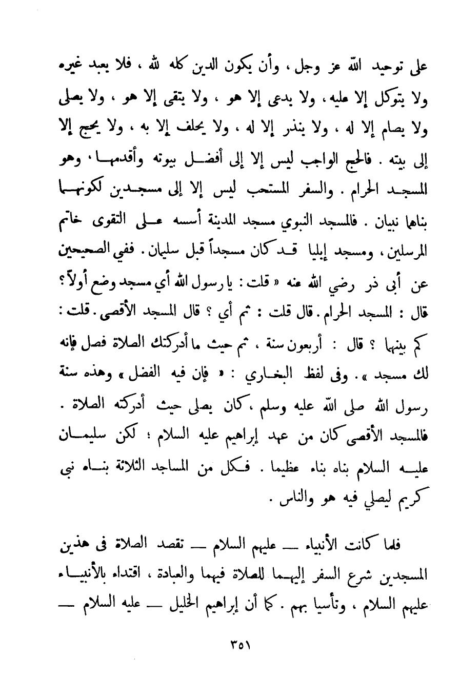عَلَى تَوْحِيدِ اللَّهِ عَزَّ وَجَلَّ وَأَنْ يَكُونَ الدِّينُ كُلُّهُ لِلَّهِ فَلَا يُعْبَدُ غَيْرُهُ وَلَا يُتَوَكَّلُ إلَّا عَلَيْهِ وَلَا يُدْعَى إلَّا هُوَ وَلَا يُتَّقَى إلَّا هُوَ وَلَا يُصَلَّى وَلَا يُصَامُ إلَّا لَهُ وَلَا يُنْذَرُ إلَّا لَهُ وَلَا يُحْلَفُ إلَّا بِهِ وَلَا يُحَجُّ إلَّا إلَى بَيْتِهِ. فَالْحَجُّ الْوَاجِبُ لَيْسَ إلَّا إلَى أَفْضَلِ بُيُوتِهِ وَأَقْدَمِهَا وَهُوَ الْمَسْجِدُ الْحَرَامُ. وَالسَّفَرُ الْمُسْتَحَبُّ لَيْسَ إلَّا إلَى مَسْجِدَيْنِ لِكَوْنِهِمَا بَنَاهُمَا نَبِيَّانِ. فَالْمَسْجِدُ النَّبَوِيُّ مَسْجِدُ الْمَدِينَةِ أَسَّسَهُ عَلَى التَّقْوَى خَاتَمُ الْمُرْسَلِينَ وَمَسْجِدُ إيليا قَدْ كَانَ مَسْجِدًا قَبْلَ سُلَيْمَانَ. فَفِي الصَّحِيحَيْنِ عَنْ أَبِي ذَرٍّ رَضِيَ اللَّهُ عَنْهُ {قُلْت: يَا رَسُولَ اللَّهِ أَيُّ مَسْجِدٍ وُضِعَ أَوَّلًا؟ قَالَ: الْمَسْجِدُ الْحَرَامُ. قَالَ قُلْت: ثُمَّ أَيُّ؟ قَالَ الْمَسْجِدُ الْأَقْصَى. قُلْت: كَمْ بَيْنَهُمَا؟ قَالَ: أَرْبَعُونَ سَنَةً ثُمَّ حَيْثُ مَا أَدْرَكَتْك الصَّلَاةُ فَصَلِّ فَإِنَّهُ لَك مَسْجِدٌ} . وَفِي لَفْظِ الْبُخَارِيِّ: {فَإِنَّ فِيهِ الْفَضْلَ} وَهَذِهِ سُنَّةُ رَسُولِ اللَّهِ صَلَّى اللَّهُ عَلَيْهِ وَسَلَّمَ كَانَ يُصَلِّي حَيْثُ أَدْرَكَتْهُ الصَّلَاةُ. فَالْمَسْجِدُ الْأَقْصَى كَانَ مِنْ عَهْدِ إبْرَاهِيمَ عَلَيْهِ السَّلَامُ لَكِنَّ سُلَيْمَانَ عَلَيْهِ السَّلَامُ بَنَاهُ بِنَاءً عَظِيمًا. فَكُلٌّ مِنْ الْمَسَاجِدِ الثَّلَاثَةِ بَنَاهُ نَبِيٌّ كَرِيمٌ لِيُصَلِّيَ فِيهِ هُوَ وَالنَّاسُ. فَلَمَّا كَانَتْ الْأَنْبِيَاءُ - عَلَيْهِمْ السَّلَامُ - تَقْصِدُ الصَّلَاةَ فِي هَذَيْنِ الْمَسْجِدَيْنِ شُرِعَ السَّفَرُ إلَيْهِمَا لِلصَّلَاةِ فِيهِمَا وَالْعِبَادَةِ اقْتِدَاءً بِالْأَنْبِيَاءِ عَلَيْهِمْ السَّلَامُ وَتَأَسِّيًا بِهِمْ. كَمَا أَنَّ إبْرَاهِيمَ الْخَلِيلَ - عَلَيْهِ السَّلَامُ -