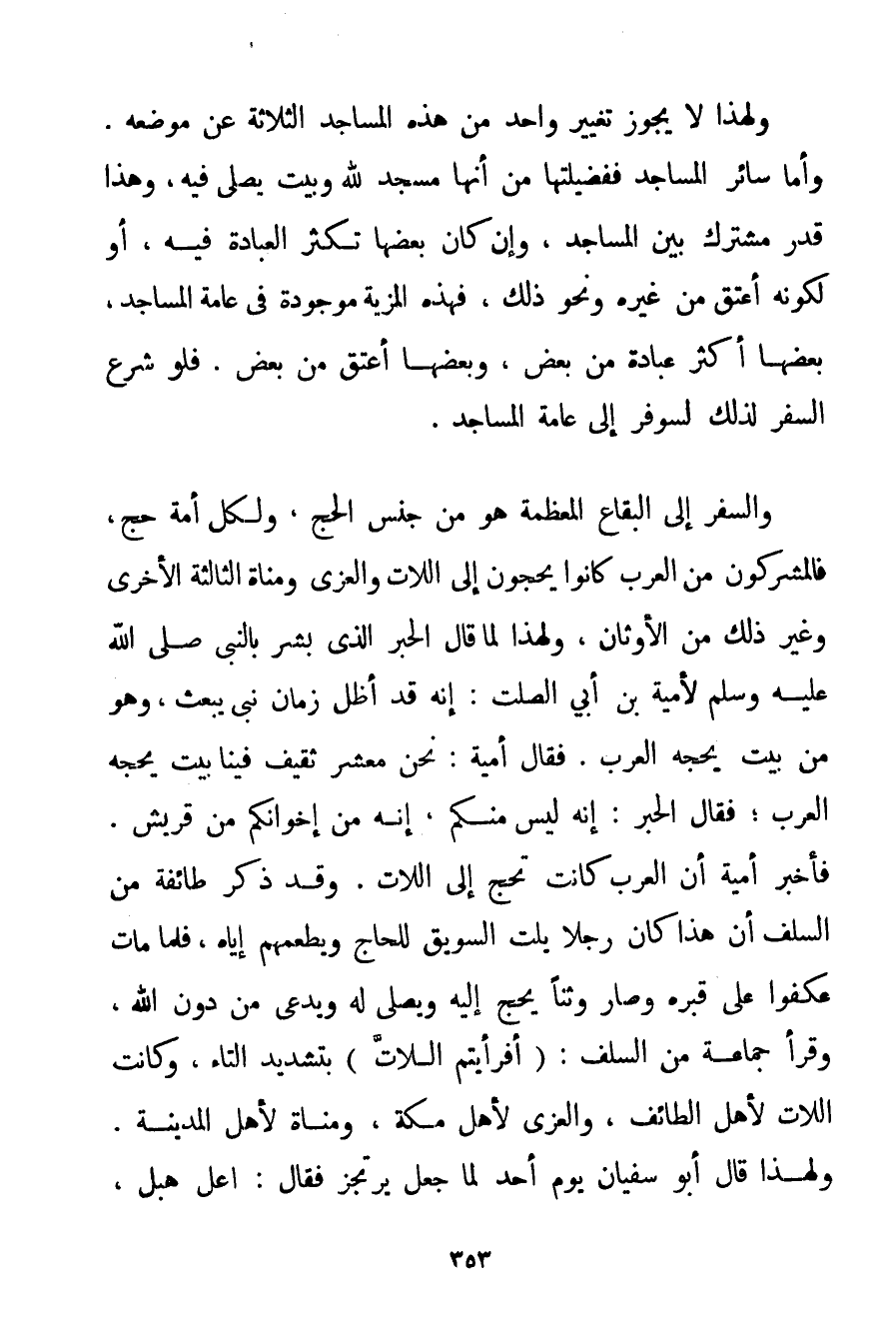وَالسَّفَرُ إلَى الْبِقَاعِ الْمُعَظَّمَةِ هُوَ مِنْ جِنْسِ الْحَجِّ وَلِكُلِّ أُمَّةٍ حَجٌّ فَالْمُشْرِكُونَ مِنْ الْعَرَبِ كَانُوا يَحُجُّونَ إلَى اللَّاتِ وَالْعُزَّى وَمَنَاةَ الثَّالِثَةَ الْأُخْرَى وَغَيْرِ ذَلِكَ مِنْ الْأَوْثَانِ وَلِهَذَا لَمَّا {قَالَ الْحَبْرُ الَّذِي بَشَّرَ بِالنَّبِيِّ صَلَّى اللَّهُ عَلَيْهِ وَسَلَّمَ لِأُمَيَّةِ بْنِ أَبِي الصَّلْتِ: إنَّهُ قَدْ أَظَلَّ زَمَانُ نَبِيٍّ يُبْعَثُ وَهُوَ مِنْ بَيْتٍ يَحُجُّهُ الْعَرَبُ. فَقَالَ أُمَيَّةُ: نَحْنُ مَعْشَرَ ثَقِيفٍ فِينَا بَيْتٌ يَحُجُّهُ الْعَرَبُ؛ فَقَالَ الْحَبْرُ: إنَّهُ لَيْسَ مِنْكُمْ إنَّهُ مِنْ إخْوَانِكُمْ مِنْ قُرَيْشٍ} . فَأَخْبَرَ أُمَيَّةَ أَنَّ الْعَرَبَ كَانَتْ تَحُجُّ إلَى اللَّاتِ. وَقَدْ ذَكَرَ طَائِفَةٌ مِنْ السَّلَفِ أَنَّ هَذَا كَانَ رَجُلًا يَلُتُّ السَّوِيقَ لِلْحَاجِّ وَيُطْعِمُهُمْ إيَّاهُ فَلَمَّا مَاتَ عَكَفُوا عَلَى قَبْرِهِ وَصَارَ وَثَنًا يُحَجُّ إلَيْهِ وَيُصَلَّى لَهُ وَيُدْعَى مِنْ دُونِ اللَّهِ وَقَرَأَ جَمَاعَةٌ مِنْ السَّلَفِ: {أَفَرَأَيْتُمُ اللَّاتَ} بِتَشْدِيدِ التَّاءِ وَكَانَتْ اللَّاتُ لِأَهْلِ الطَّائِفِ وَالْعُزَّى لِأَهْلِ مَكَّةَ وَمَنَاةُ لِأَهْلِ الْمَدِينَةِ. وَلِهَذَا {قَالَ أَبُو سُفْيَانَ يَوْمَ أُحُدٍ لَمَّا جَعَلَ يَرْتَجِزُ فَقَالَ: اُعْلُ هُبَلَ