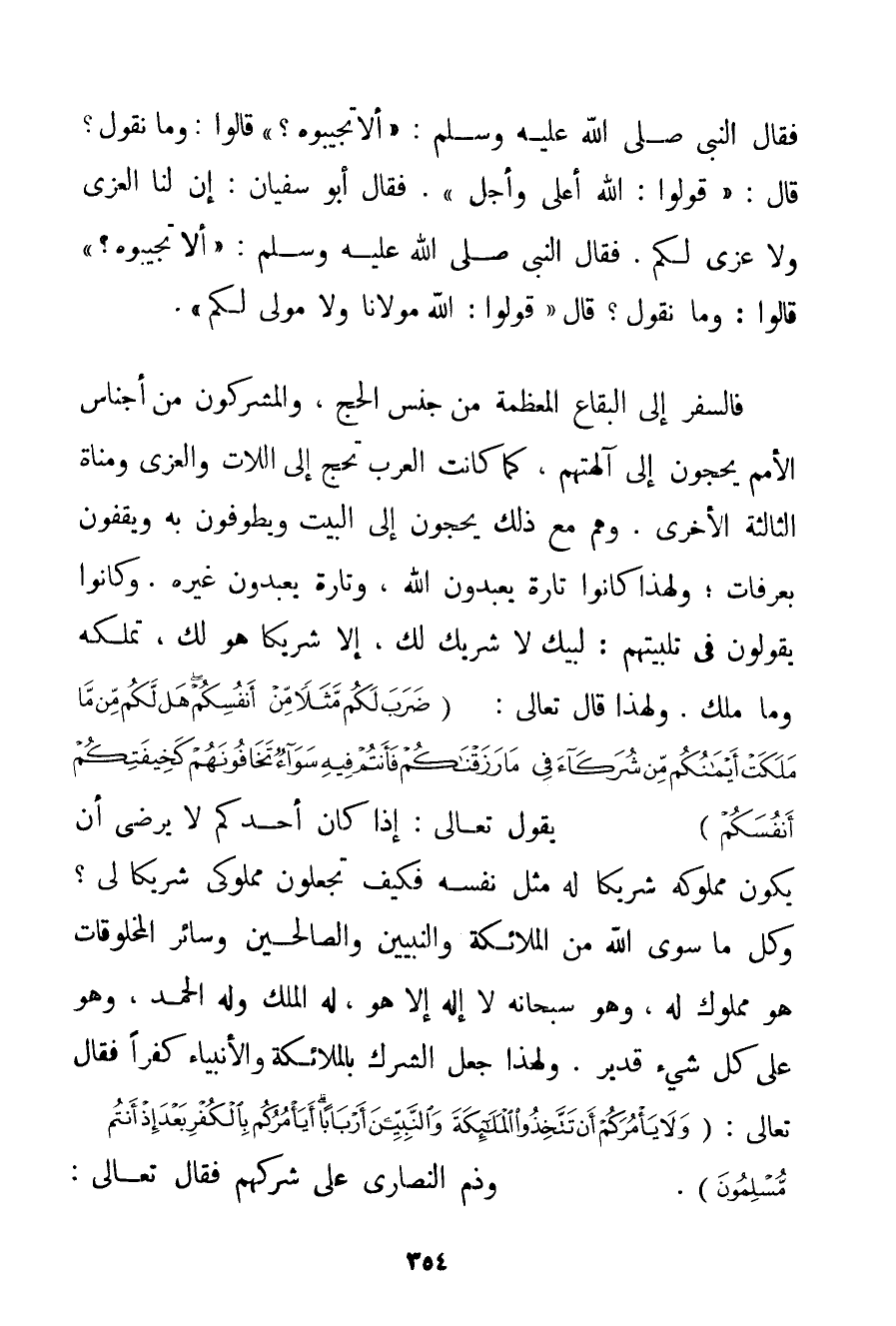 فَقَالَ النَّبِيُّ صَلَّى اللَّهُ عَلَيْهِ وَسَلَّمَ أَلَا تُجِيبُوهُ؟ قَالُوا: وَمَا نَقُولُ؟ قَالَ: قُولُوا: اللَّهُ أَعْلَى وَأَجَلُّ. فَقَالَ أَبُو سُفْيَانَ: إنَّ لَنَا الْعُزَّى وَلَا عُزَّى لَكُمْ. فَقَالَ النَّبِيُّ صَلَّى اللَّهُ عَلَيْهِ وَسَلَّمَ أَلَا تُجِيبُوهُ؟ قَالُوا: وَمَا نَقُولُ؟ قَالَ قُولُوا: اللَّهُ مَوْلَانَا وَلَا مَوْلَى لَكُمْ} . فَالسَّفَرُ إلَى الْبِقَاعِ الْمُعَظَّمَةِ مِنْ جِنْسِ الْحَجِّ وَالْمُشْرِكُونَ مِنْ أَجْنَاسِ الْأُمَمِ يَحُجُّونَ إلَى آلِهَتِهِمْ كَمَا كَانَتْ الْعَرَبُ تَحُجُّ إلَى اللَّاتِ وَالْعُزَّى وَمَنَاةَ الثَّالِثَةَ الْأُخْرَى. وَهُمْ مَعَ ذَلِكَ يَحُجُّونَ إلَى الْبَيْتِ وَيَطُوفُونَ بِهِ وَيَقِفُونَ بِعَرَفَاتِ؛ وَلِهَذَا كَانُوا تَارَةً يَعْبُدُونَ اللَّهَ وَتَارَةً يَعْبُدُونَ غَيْرَهُ. وَكَانُوا يَقُولُونَ فِي تَلْبِيَتِهِمْ: لَبَّيْكَ لَا شَرِيكَ لَك إلَّا شَرِيكًا هُوَ لَك تَمْلِكُهُ وَمَا ملك. وَلِهَذَا قَالَ تَعَالَى: {ضَرَبَ لَكُمْ مَثَلًا مِنْ أَنْفُسِكُمْ هَلْ لَكُمْ مِنْ مَا مَلَكَتْ أَيْمَانُكُمْ مِنْ شُرَكَاءَ فِي مَا رَزَقْنَاكُمْ فَأَنْتُمْ فِيهِ سَوَاءٌ تَخَافُونَهُمْ كَخِيفَتِكُمْ أَنْفُسَكُمْ} يَقُولُ تَعَالَى: إذَا كَانَ أَحَدُكُمْ لَا يَرْضَى أَنْ يَكُونَ مَمْلُوكُهُ شَرِيكًا لَهُ مِثْلَ نَفْسِهِ فَكَيْفَ تَجْعَلُونَ مَمْلُوكِي شَرِيكًا لِي؟ وَكُلُّ مَا سِوَى اللَّهِ مِنْ الْمَلَائِكَةِ وَالنَّبِيِّينَ وَالصَّالِحِينَ وَسَائِرِ الْمَخْلُوقَاتِ هُوَ مَمْلُوكٌ لَهُ وَهُوَ سُبْحَانَهُ لَا إلَهَ إلَّا هُوَ لَهُ الْمُلْكُ وَلَهُ الْحَمْدُ وَهُوَ عَلَى كُلِّ شَيْءٍ قَدِيرٌ. وَلِهَذَا جُعِلَ الشِّرْكُ بِالْمَلَائِكَةِ وَالْأَنْبِيَاءِ كُفْرًا فَقَالَ تَعَالَى: {وَلَا يَأْمُرَكُمْ أَنْ تَتَّخِذُوا الْمَلَائِكَةَ وَالنَّبِيِّينَ أَرْبَابًا أَيَأْمُرُكُمْ بِالْكُفْرِ بَعْدَ إذْ أَنْتُمْ مُسْلِمُونَ} . وَذَمَّ النَّصَارَى عَلَى شِرْكِهِمْ فَقَالَ تَعَالَى: