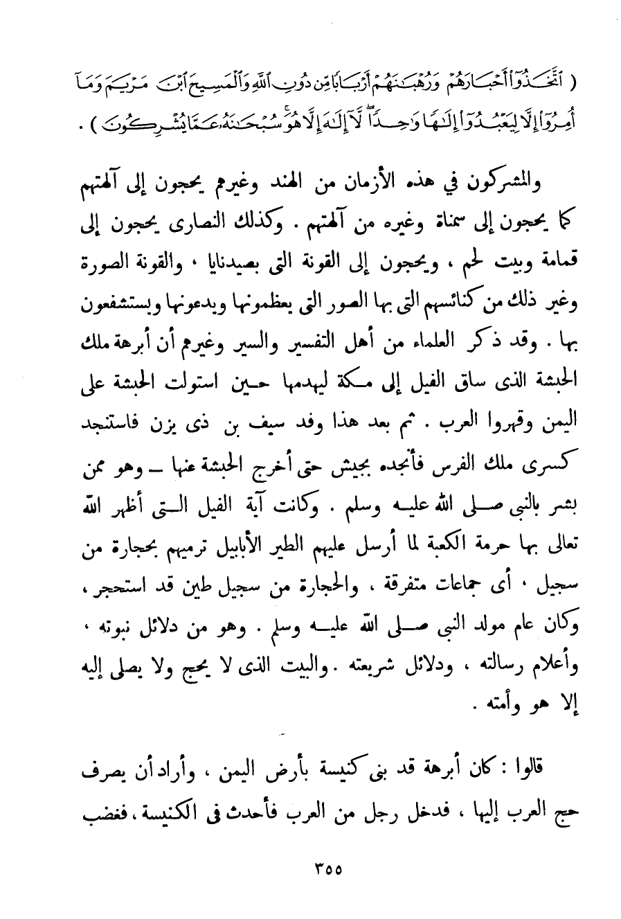 {اتَّخَذُوا أَحْبَارَهُمْ وَرُهْبَانَهُمْ أَرْبَابًا مِنْ دُونِ اللَّهِ وَالْمَسِيحَ ابْنَ مَرْيَمَ وَمَا أُمِرُوا إلَّا لِيَعْبُدُوا إلَهًا وَاحِدًا لَا إلَهَ إلَّا هُوَ سُبْحَانَهُ عَمَّا يُشْرِكُونَ} . وَالْمُشْرِكُونَ فِي هَذِهِ الْأَزْمَانِ مِنْ الْهِنْدِ وَغَيْرِهِمْ يَحُجُّونَ إلَى آلِهَتِهِمْ كَمَا يَحُجُّونَ إلَى سمناة وَغَيْرِهِ مِنْ آلِهَتِهِمْ. وَكَذَلِكَ النَّصَارَى يَحُجُّونَ إلَى قُمَامَةَ وَبَيْتِ لَحْمٍ وَيَحُجُّونَ إلَى الْقَوْنَة الَّتِي بصيدنايا وَالْقَوْنَة الصُّورَةُ وَغَيْرِ ذَلِكَ مِنْ كَنَائِسِهِمْ الَّتِي بِهَا الصُّوَرُ الَّتِي يُعَظِّمُونَهَا وَيَدْعُونَهَا وَيَسْتَشْفِعُونَ بِهَا. وَقَدْ ذَكَرَ الْعُلَمَاءُ مِنْ أَهْلِ التَّفْسِيرِ وَالسِّيَرِ وَغَيْرِهِمْ أَنَّ أبرهة مَلِكَ الْحَبَشَةِ الَّذِي سَاقَ الْفِيلَ إلَى مَكَّةَ لِيَهْدِمَهَا حِينَ اسْتَوْلَتْ الْحَبَشَةُ عَلَى الْيَمَنِ وَقَهَرُوا الْعَرَبَ. ثُمَّ بَعْدَ هَذَا وَفَدَ سَيْفُ بْنُ ذِي يزن فَاسْتَنْجَدَ كِسْرَى مَلِكَ الْفُرْسِ فَأَنْجَدَهُ بِجَيْشِ حَتَّى أَخْرَجَ الْحَبَشَةَ عَنْهَا - وَهُوَ مِمَّنْ بَشَّرَ بِالنَّبِيِّ صَلَّى اللَّهُ عَلَيْهِ وَسَلَّمَ. وَكَانَتْ آيَةُ الْفِيلِ الَّتِي أَظْهَرَ اللَّهُ تَعَالَى بِهَا حُرْمَةَ الْكَعْبَةِ لَمَّا أَرْسَلَ عَلَيْهِمْ الطَّيْرَ الْأَبَابِيلَ تَرْمِيهِمْ بِحِجَارَةٍ مِنْ سِجِّيلِ أَيْ جَمَاعَاتٍ مُتَفَرِّقَةٍ وَالْحِجَارَةُ مِنْ سِجِّيلٍ طِينٌ قَدْ اسْتَحْجَرَ وَكَانَ عَامَ مَوْلِدِ النَّبِيِّ صَلَّى اللَّهُ عَلَيْهِ وَسَلَّمَ. وَهُوَ مِنْ دَلَائِلَ نُبُوَّتِهِ وَأَعْلَامِ رِسَالَتِهِ وَدَلَائِلَ شَرِيعَتِهِ. وَالْبَيْتُ الَّذِي لَا يَحُجُّ وَلَا يُصَلِّي إلَيْهِ إلَّا هُوَ وَأُمَّتُهُ. قَالُوا: كَانَ أبرهة قَدْ بَنَى كَنِيسَةً بِأَرْضِ الْيَمَنِ وَأَرَادَ أَنْ يَصْرِفَ حَجَّ الْعَرَبِ إلَيْهَا فَدَخَلَ رَجُلٌ مِنْ الْعَرَبِ فَأَحْدَثَ فِي الْكَنِيسَةِ فَغَضِبَ