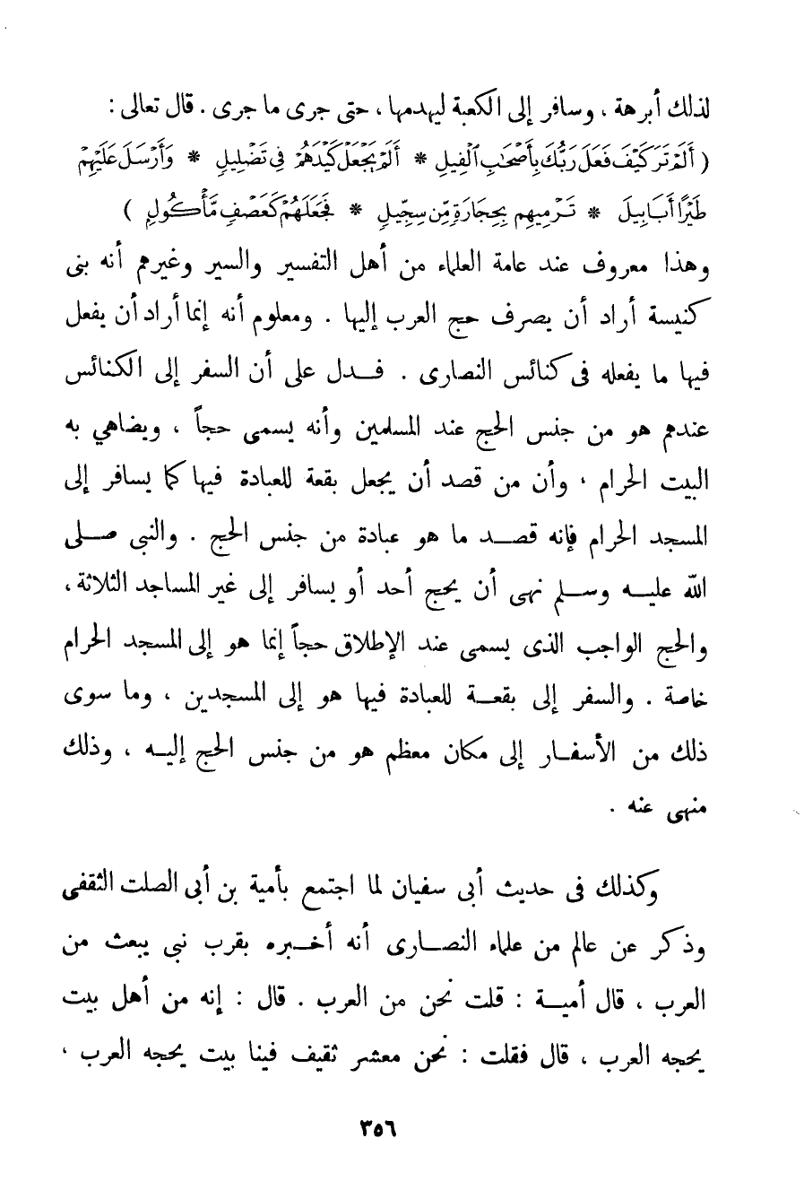 لِذَلِك أبرهة وَسَافَرَ إلَى الْكَعْبَةِ لِيَهْدِمَهَا حَتَّى جَرَى مَا جَرَى. قَالَ تَعَالَى: {أَلَمْ تَرَ كَيْفَ فَعَلَ رَبُّكَ بِأَصْحَابِ الْفِيلِ} {أَلَمْ يَجْعَلْ كَيْدَهُمْ فِي تَضْلِيلٍ} {وَأَرْسَلَ عَلَيْهِمْ طَيْرًا أَبَابِيلَ} {تَرْمِيهِمْ بِحِجَارَةٍ مِنْ سِجِّيلٍ} {فَجَعَلَهُمْ كَعَصْفٍ مَأْكُولٍ} وَهَذَا مَعْرُوفٌ عِنْدَ عَامَّةِ الْعُلَمَاءِ مِنْ أَهْلِ التَّفْسِيرِ وَالسِّيَرِ وَغَيْرِهِمْ أَنَّهُ بَنَى كَنِيسَةً أَرَادَ أَنْ يَصْرِفَ حَجَّ الْعَرَبِ إلَيْهَا. وَمَعْلُومٌ أَنَّهُ إنَّمَا أَرَادَ أَنْ يَفْعَلَ فِيهَا مَا يَفْعَلُهُ فِي كَنَائِسِ النَّصَارَى. فَدَلَّ عَلَى أَنَّ السَّفَرَ إلَى الْكَنَائِسِ عِنْدَهُمْ هُوَ مِنْ جِنْسِ الْحَجِّ عِنْدَ الْمُسْلِمِينَ وَأَنَّهُ يُسَمَّى حَجًّا وَيُضَاهَى بِهِ الْبَيْتُ الْحَرَامُ وَأَنَّ مَنْ قَصَدَ أَنْ يَجْعَلَ بُقْعَةً لِلْعِبَادَةِ فِيهَا كَمَا يُسَافِرُ إلَى الْمَسْجِدِ الْحَرَامِ فَإِنَّهُ قَصَدَ مَا هُوَ عِبَادَةٌ مِنْ جِنْسِ الْحَجِّ. وَالنَّبِيُّ صَلَّى اللَّهُ عَلَيْهِ وَسَلَّمَ نَهَى أَنْ يَحُجَّ أَحَدٌ أَوْ يُسَافِرَ إلَى غَيْرِ الْمَسَاجِدِ الثَّلَاثَةِ وَالْحَجُّ الْوَاجِبُ الَّذِي يُسَمَّى عِنْدَ الْإِطْلَاقِ حَجًّا إنَّمَا هُوَ إلَى الْمَسْجِدِ الْحَرَامِ خَاصَّةً. وَالسَّفَرُ إلَى بُقْعَةٍ لِلْعِبَادَةِ فِيهَا هُوَ إلَى الْمَسْجِدَيْنِ وَمَا سِوَى ذَلِكَ مِنْ الْأَسْفَارِ إلَى مَكَانٍ مُعَظَّمٍ هُوَ مِنْ جِنْسِ الْحَجِّ إلَيْهِ وَذَلِكَ مَنْهِيٌّ عَنْهُ. وَكَذَلِكَ فِي حَدِيثِ {أَبِي سُفْيَانَ لَمَّا اجْتَمَعَ بِأُمَيَّةِ بْنِ أَبِي الصَّلْتِ الثَّقَفِيِّ وَذَكَرَ عَنْ عَالِمٍ مِنْ عُلَمَاءِ النَّصَارَى أَنَّهُ أَخْبَرَهُ بِقُرْبِ نَبِيٍّ يُبْعَثُ مِنْ الْعَرَبِ قَالَ أُمَيَّةُ: قُلْت نَحْنُ مِنْ الْعَرَبِ. قَالَ: إنَّهُ مِنْ أَهْلِ بَيْتٍ يَحُجُّهُ الْعَرَبُ قَالَ فَقُلْت: نَحْنُ مَعْشَرَ ثَقِيفٍ فِينَا بَيْتٌ يَحُجُّهُ الْعَرَبُ