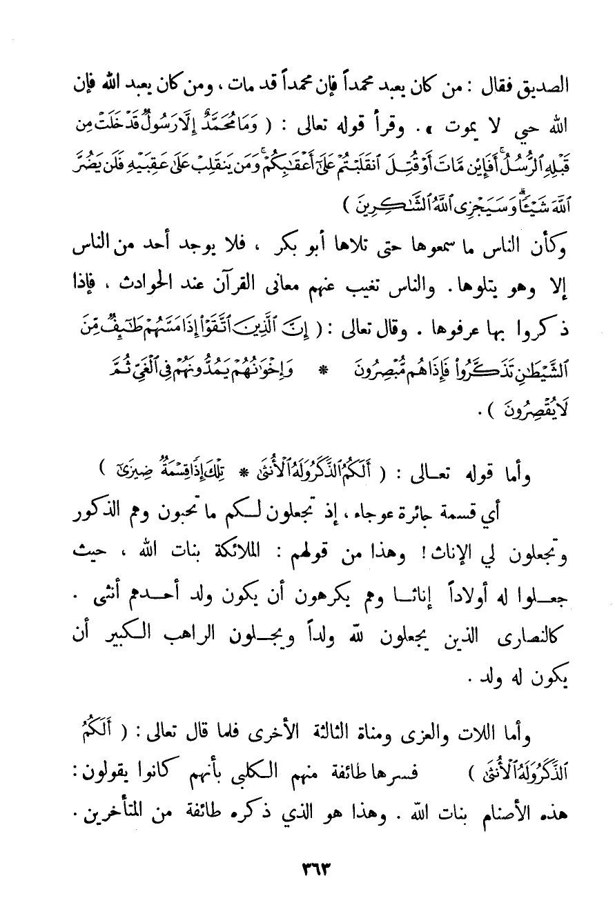 الصَّدِيقُ فَقَالَ: مَنْ كَانَ يَعْبُدُ مُحَمَّدًا فَإِنَّ مُحَمَّدًا قَدْ مَاتَ وَمَنْ كَانَ يَعْبُدُ اللَّهَ فَإِنَّ اللَّهَ حَيٌّ لَا يَمُوتُ. وَقَرَأَ قَوْله تَعَالَى {وَمَا مُحَمَّدٌ إلَّا رَسُولٌ قَدْ خَلَتْ مِنْ قَبْلِهِ الرُّسُلُ أَفَإِنْ مَاتَ أَوْ قُتِلَ انْقَلَبْتُمْ عَلَى أَعْقَابِكُمْ وَمَنْ يَنْقَلِبْ عَلَى عَقِبَيْهِ فَلَنْ يَضُرَّ اللَّهَ شَيْئًا وَسَيَجْزِي اللَّهُ الشَّاكِرِينَ} وَكَأَنَّ النَّاسَ مَا سَمِعُوهَا حَتَّى تَلَاهَا أَبُو بَكْرٍ} فَلَا يُوجَدُ أَحَدٌ مِنْ النَّاسِ إلَّا وَهُوَ يَتْلُوهَا. وَالنَّاسُ تَغِيبُ عَنْهُمْ مَعَانِي الْقُرْآنِ عِنْدَ الْحَوَادِثِ فَإِذَا ذُكِّرُوا بِهَا عَرَفُوهَا. وَقَالَ تَعَالَى: {إنَّ الَّذِينَ اتَّقَوْا إذَا مَسَّهُمْ طَائِفٌ مِنَ الشَّيْطَانِ تَذَكَّرُوا فَإِذَا هُمْ مُبْصِرُونَ} {وَإِخْوَانُهُمْ يَمُدُّونَهُمْ فِي الْغَيِّ ثُمَّ لَا يُقْصِرُونَ} . وَأَمَّا قَوْله تَعَالَى {أَلَكُمُ الذَّكَرُ وَلَهُ الْأُنْثَى} {تِلْكَ إذًا قِسْمَةٌ ضِيزَى} أَيْ قِسْمَةٌ جَائِرَةٌ عَوْجَاءُ إذْ تَجْعَلُونَ لَكُمْ مَا تُحِبُّونَ وَهُمْ الذُّكُورُ وَتَجْعَلُونَ لِي الْإِنَاثَ وَهَذَا مِنْ قَوْلِهِمْ: الْمَلَائِكَةُ بَنَاتُ اللَّهِ حَيْثُ جَعَلُوا لَهُ أَوْلَادًا إنَاثًا وَهُمْ يَكْرَهُونَ أَنْ يَكُونَ وَلَدُ أَحَدِهِمْ أُنْثَى. كَالنَّصَارَى الَّذِينَ يَجْعَلُونَ لِلَّهِ وَلَدًا وَيُجِلُّونَ الرَّاهِبَ الْكَبِيرَ أَنْ يَكُونَ لَهُ وَلَدٌ. وَأَمَّا اللَّاتُ وَالْعُزَّى وَمَنَاةُ الثَّالِثَةُ الْأُخْرَى فَلَمَّا قَالَ تَعَالَى: {أَلَكُمُ الذَّكَرُ وَلَهُ الْأُنْثَى} فَسَّرَهَا طَائِفَةٌ مِنْهُمْ الْكَلْبِيُّ بِأَنَّهُمْ كَانُوا يَقُولُونَ: هَذِهِ الْأَصْنَامُ بَنَاتُ اللَّهِ. وَهَذَا هُوَ الَّذِي ذَكَرَهُ طَائِفَةٌ مِنْ الْمُتَأَخِّرِينَ.