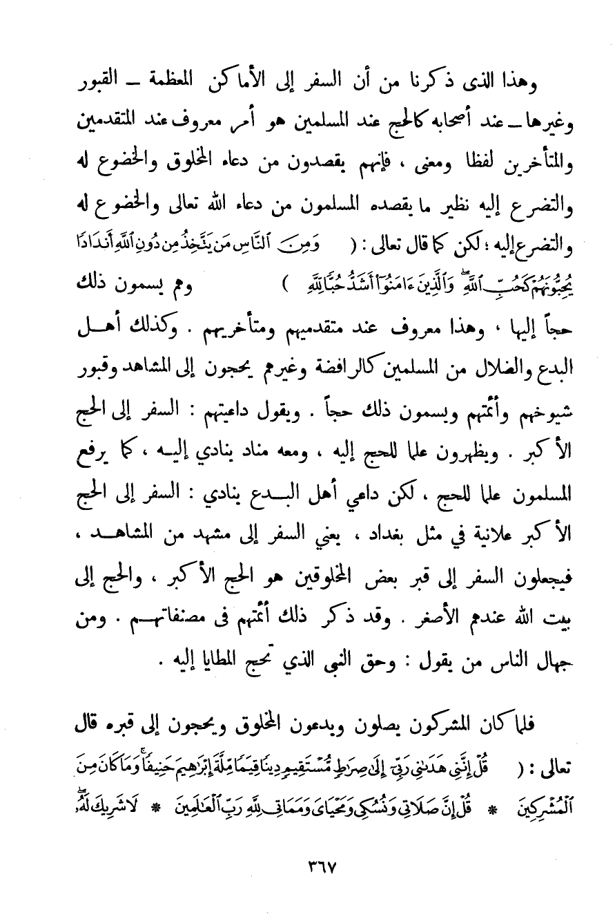 وَهَذَا الَّذِي ذَكَرْنَا مِنْ أَنَّ السَّفَرَ إلَى الْأَمَاكِنِ الْمُعَظَّمَةِ - الْقُبُورِ وَغَيْرِهَا - عِنْدَ أَصْحَابِهِ كَالْحَجِّ عِنْدَ الْمُسْلِمِينَ هُوَ أَمْرٌ مَعْرُوفٌ عِنْدَ الْمُتَقَدِّمِينَ والمتأخرين لَفْظًا وَمَعْنًى فَإِنَّهُمْ يَقْصِدُونَ مِنْ دُعَاءِ الْمَخْلُوقِ وَالْخُضُوعِ لَهُ وَالتَّضَرُّعِ إلَيْهِ نَظِيرَ مَا يَقْصِدُهُ الْمُسْلِمُونَ مِنْ دُعَاءِ اللَّهِ تَعَالَى وَالْخُضُوعِ لَهُ وَالتَّضَرُّعِ إلَيْهِ؛ لَكِنْ كَمَا قَالَ تَعَالَى: {وَمِنَ النَّاسِ مَنْ يَتَّخِذُ مِنْ دُونِ اللَّهِ أَنْدَادًا يُحِبُّونَهُمْ كَحُبِّ اللَّهِ وَالَّذِينَ آمَنُوا أَشَدُّ حُبًّا لِلَّهِ} وَهُمْ يُسَمُّونَ ذَلِكَ حَجًّا إلَيْهَا وَهَذَا مَعْرُوفٌ عِنْدَ مُتَقَدِّمِيهِمْ وَمُتَأَخِّرِيهِمْ. وَكَذَلِكَ أَهْلُ الْبِدَعِ وَالضَّلَالِ مِنْ الْمُسْلِمِينَ كَالرَّافِضَةِ وَغَيْرِهِمْ يَحُجُّونَ إلَى الْمَشَاهِدِ وَقُبُورِ شُيُوخِهِمْ وَأَئِمَّتِهِمْ وَيُسَمُّونَ ذَلِكَ حَجًّا. وَيَقُولُ دَاعِيَتُهُمْ: السَّفَرُ إلَى الْحَجِّ الْأَكْبَرِ وَيُظْهِرُونَ عَلَمًا لِلْحَجِّ إلَيْهِ وَمَعَهُ مُنَادٍ يُنَادِي إلَيْهِ كَمَا يَرْفَعُ الْمُسْلِمُونَ عَلَمًا لِلْحَجِّ لَكِنَّ دَاعِيَ أَهْلِ الْبِدَعِ يُنَادِي: السَّفَرُ إلَى الْحَجِّ الْأَكْبَرِ عَلَانِيَةً فِي مِثْلِ بَغْدَادَ يَعْنِي السَّفَرَ إلَى مَشْهَدٍ مِنْ الْمَشَاهِدِ فَيَجْعَلُونَ السَّفَرَ إلَى قَبْرِ بَعْضِ الْمَخْلُوقِينَ هُوَ الْحَجَّ الْأَكْبَرَ وَالْحَجَّ إلَى بَيْتِ اللَّهِ عِنْدَهُمْ الْأَصْغَرُ. وَقَدْ ذَكَرَ ذَلِكَ أَئِمَّتُهُمْ فِي مُصَنَّفَاتِهِمْ. وَمِنْ جُهَّالِ النَّاسِ مَنْ يَقُولُ: وَحَقُّ النَّبِيِّ الَّذِي تَحُجُّ الْمَطَايَا إلَيْهِ. فَلَمَّا كَانَ الْمُشْرِكُونَ يُصَلُّونَ وَيَدْعُونَ الْمَخْلُوقَ وَيَحُجُّونَ إلَى قَبْرِهِ قَالَ تَعَالَى: {قُلْ إنَّنِي هَدَانِي رَبِّي إلَى صِرَاطٍ مُسْتَقِيمٍ دِينًا قِيَمًا مِلَّةَ إبْرَاهِيمَ حَنِيفًا وَمَا كَانَ مِنَ الْمُشْرِكِينَ} {قُلْ إنَّ صَلَاتِي وَنُسُكِي وَمَحْيَايَ وَمَمَاتِي