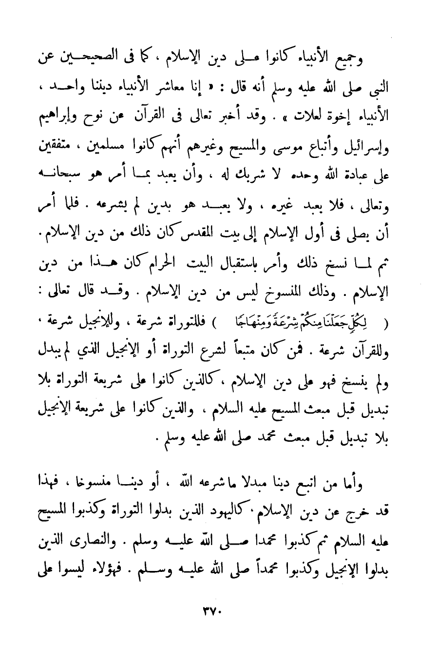 وَجَمِيعُ الْأَنْبِيَاءِ كَانُوا عَلَى دِينِ الْإِسْلَامِ كَمَا فِي الصَّحِيحَيْنِ عَنْ النَّبِيِّ صَلَّى اللَّهُ عَلَيْهِ وَسَلَّمَ أَنَّهُ قَالَ: {إنَّا مَعَاشِرُ الْأَنْبِيَاءِ دِينُنَا وَاحِدٌ الْأَنْبِيَاءُ إخْوَةٌ لِعَلَّاتِ} . وَقَدْ أَخْبَرَ تَعَالَى فِي الْقُرْآنِ عَنْ نُوحٍ وَإِبْرَاهِيمَ وَإِسْرَائِيلَ وَأَتْبَاعِ مُوسَى وَالْمَسِيحِ وَغَيْرِهِمْ أَنَّهُمْ كَانُوا مُسْلِمِينَ مُتَّفِقِينَ عَلَى عِبَادَةِ اللَّهِ وَحْدَهُ لَا شَرِيكَ لَهُ وَأَنْ يُعْبَدَ بِمَا أَمَرَ هُوَ سُبْحَانَهُ وَتَعَالَى فَلَا يُعْبَدُ غَيْرُهُ وَلَا يُعْبَدُ هُوَ بِدِينِ لَمْ يَشْرَعْهُ. فَلَمَّا أُمِرَ أَنْ يُصَلِّيَ فِي أَوَّلِ الْإِسْلَامِ إلَى بَيْتِ الْمَقْدِسِ كَانَ ذَلِكَ مِنْ دِينِ الْإِسْلَامِ. ثُمَّ لَمَّا نُسِخَ ذَلِكَ وَأُمِرَ بِاسْتِقْبَالِ الْبَيْتِ الْحَرَامِ كَانَ هَذَا مِنْ دِينِ الْإِسْلَامِ. وَذَلِكَ الْمَنْسُوخُ لَيْسَ مِنْ دِينِ الْإِسْلَامِ. وَقَدْ قَالَ تَعَالَى: {لِكُلٍّ جَعَلْنَا مِنْكُمْ شِرْعَةً وَمِنْهَاجًا} فَلِلتَّوْرَاةِ شِرْعَةٌ وَلِلْإِنْجِيلِ شِرْعَةٌ وَلِلْقُرْآنِ شِرْعَةٌ. فَمَنْ كَانَ مُتَّبِعًا لِشَرْعِ التَّوْرَاةِ أَوْ الْإِنْجِيلِ الَّذِي لَمْ يُبَدَّلْ وَلَمْ يُنْسَخْ فَهُوَ عَلَى دِينِ الْإِسْلَامِ كَاَلَّذِينَ كَانُوا عَلَى شَرِيعَةِ التَّوْرَاةِ بِلَا تَبْدِيلٍ قَبْلَ مَبْعَثِ الْمَسِيحِ عَلَيْهِ السَّلَامُ وَاَلَّذِينَ كَانُوا عَلَى شَرِيعَةِ الْإِنْجِيلِ بِلَا تَبْدِيلٍ قَبْلَ مَبْعَثِ مُحَمَّدٍ صَلَّى اللَّهُ عَلَيْهِ وَسَلَّمَ.